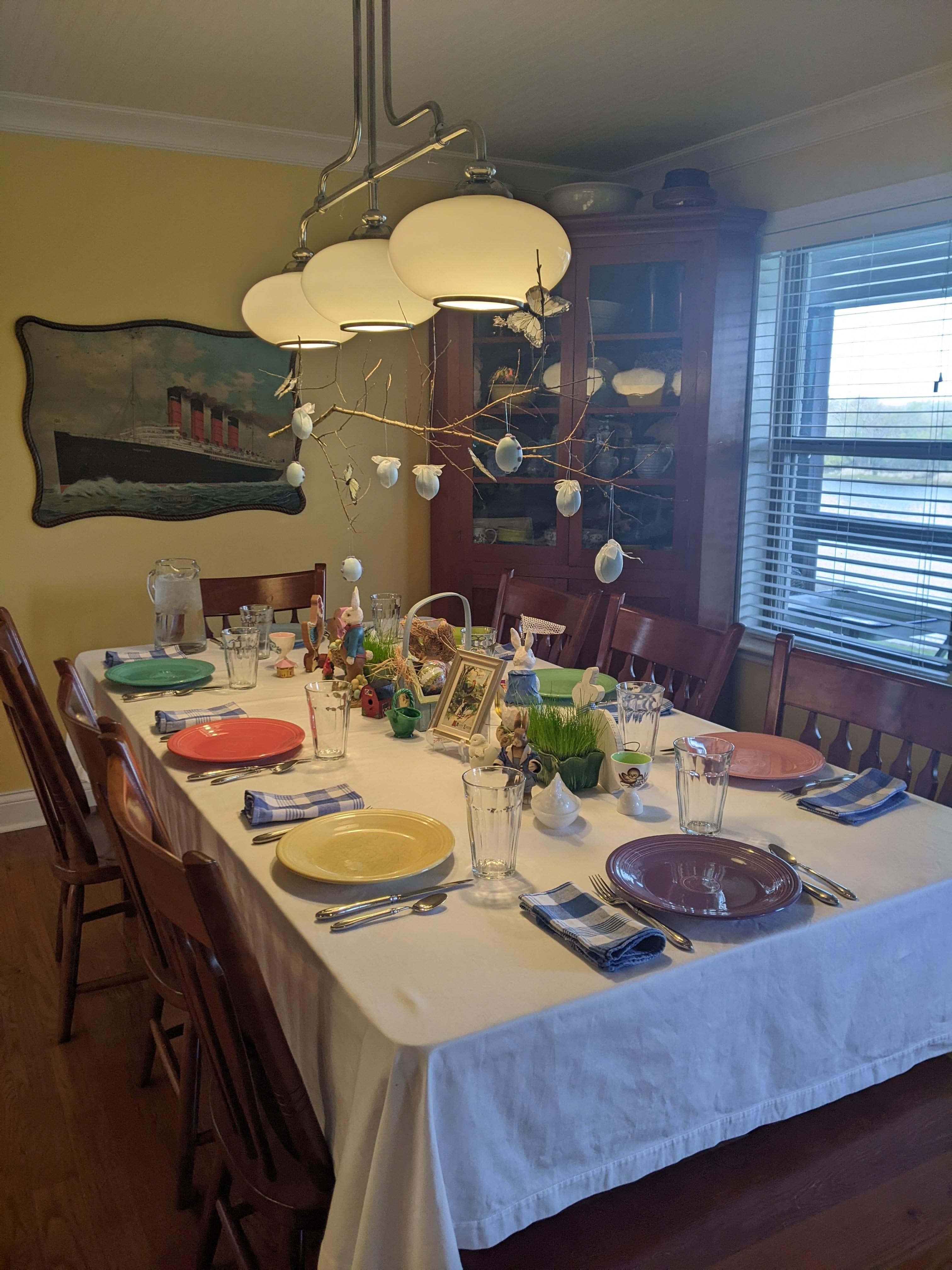 My brother and his family are visiting from Germany and they came over for dinner last night. I had already worked on the Easter table, so all I had to do was set it with my pastel Fiestaware dinner plates and some cheery blue and white checked napkins.