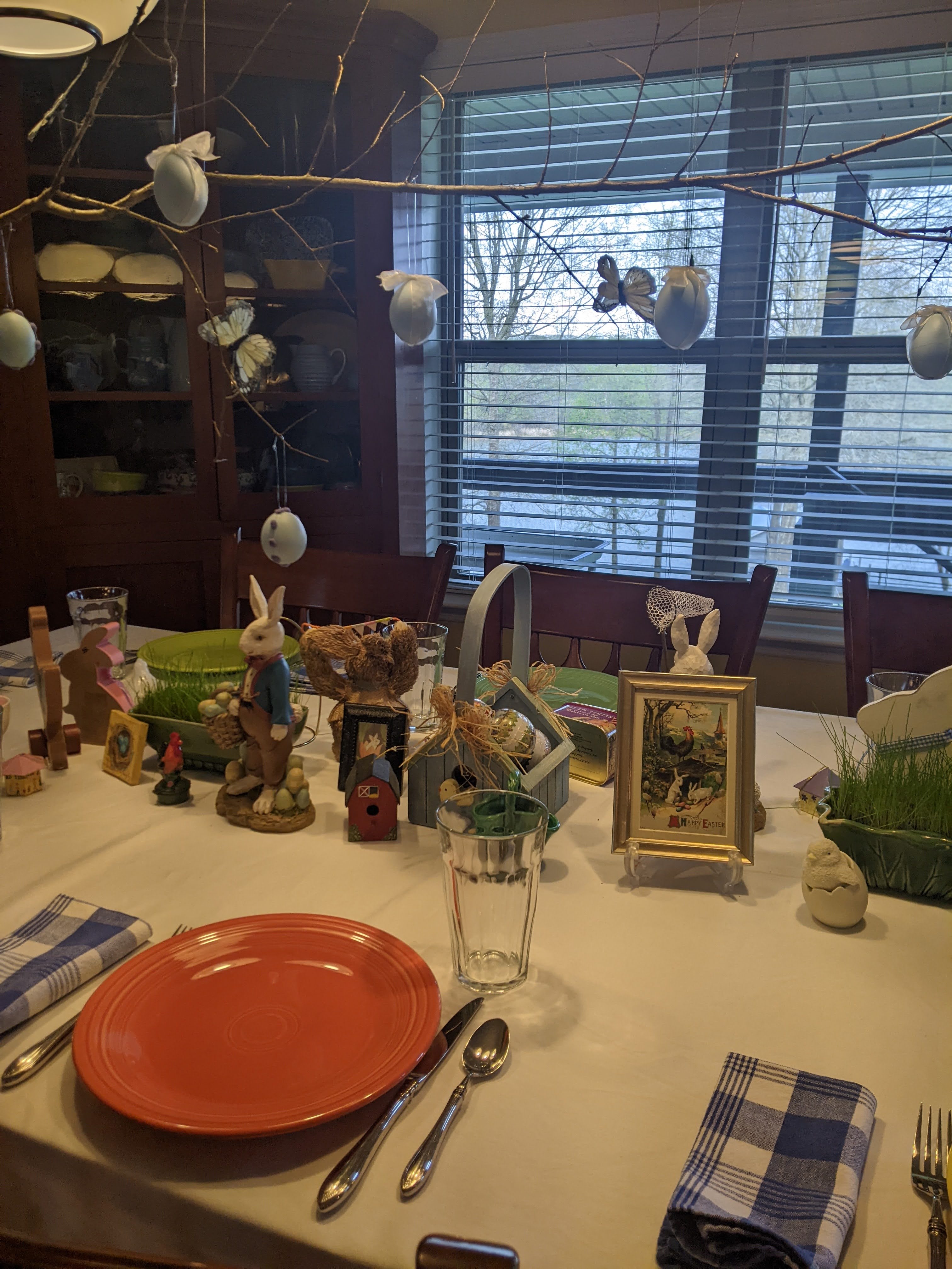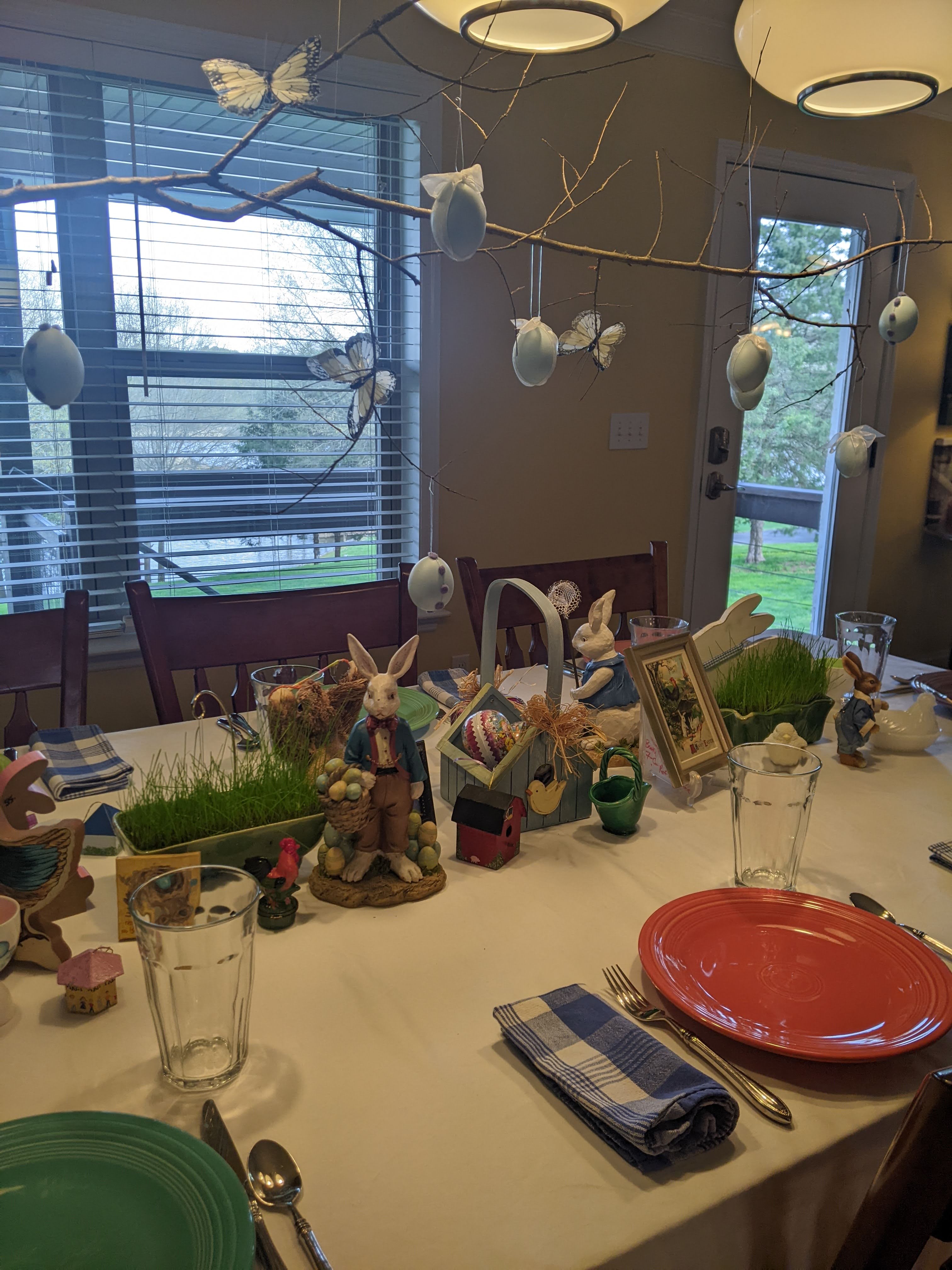 I started my pots of annual rye grass about 10 days ago, and they have needed a couple of haircuts already. I cut the crape myrtle branch earlier this week and suspended it from the light fixture with fishing line. I decorated it with some craft butterflies and some eggs that I blew and painted a million years ago. As you can see, I have amassed quite a collection of Easter cuties for the table. No particular them except that they have to be cute.