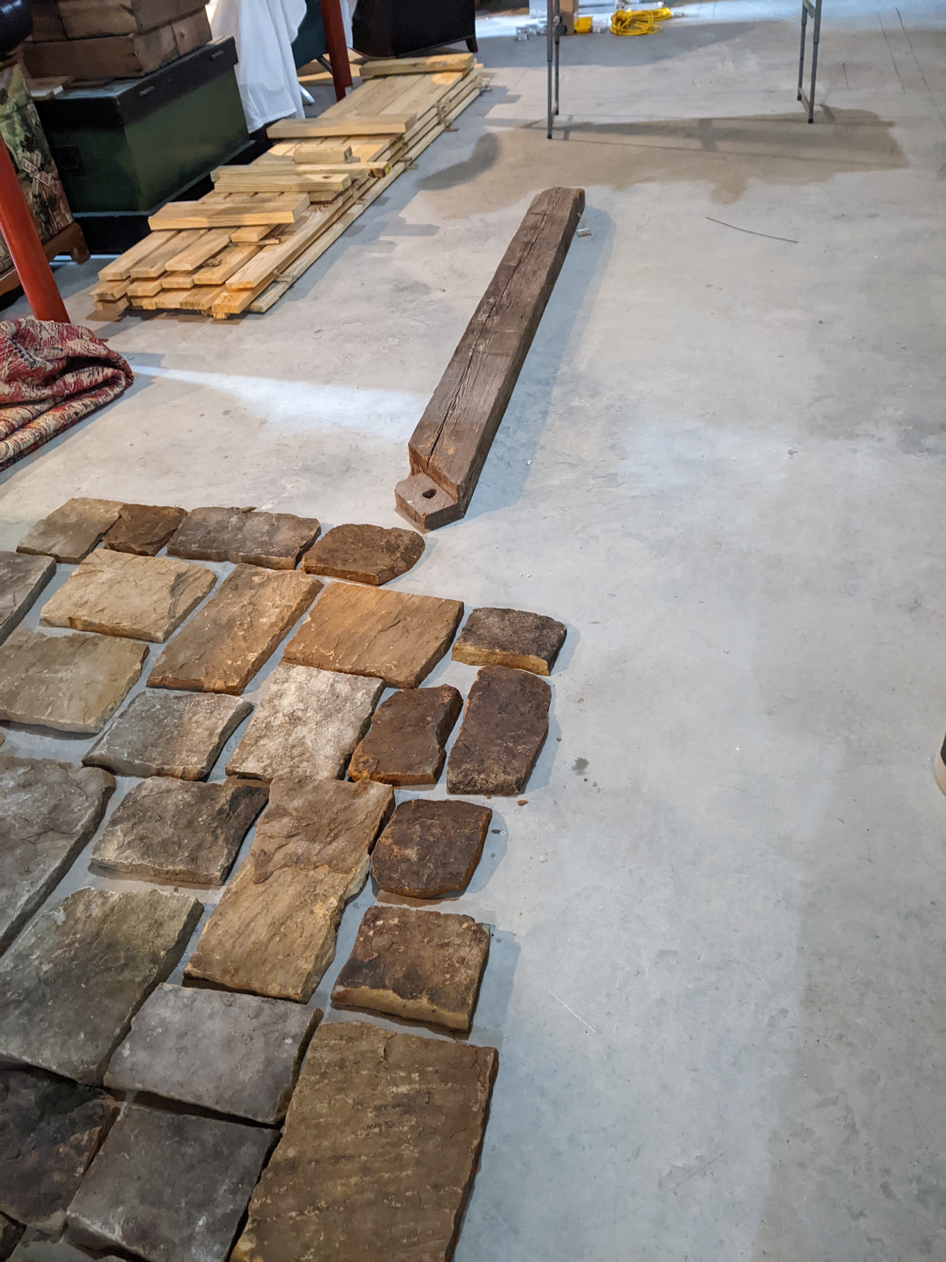 Once this prep work was complete, I took the wire netting off of the top of the pallet of stone veneer and washed it off and brought it in. This is three layers worth to give us a good variety of colors and shapes and sizes.