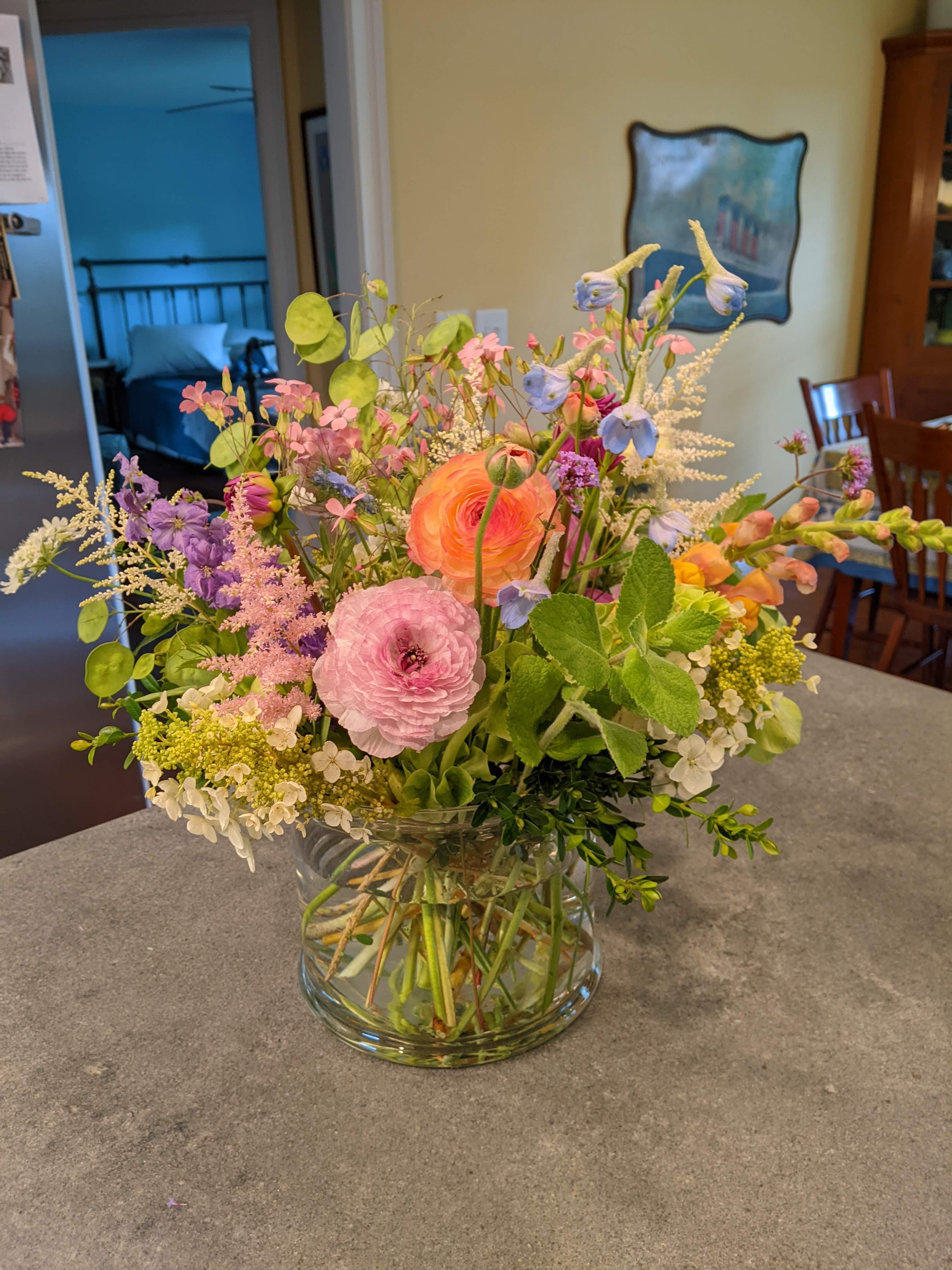 I get a bouquet of flowers every week from my subscription and I LOVE it. This week was more ranunculus, snapdragon, nigella, larkspur, pink astilbe, Bells of Ireland, and what I thought was Gaura, but is actually Saponaria. I added boxwood, lenten rose, white astilbe, oak leaf hydrangea and some dahlias.