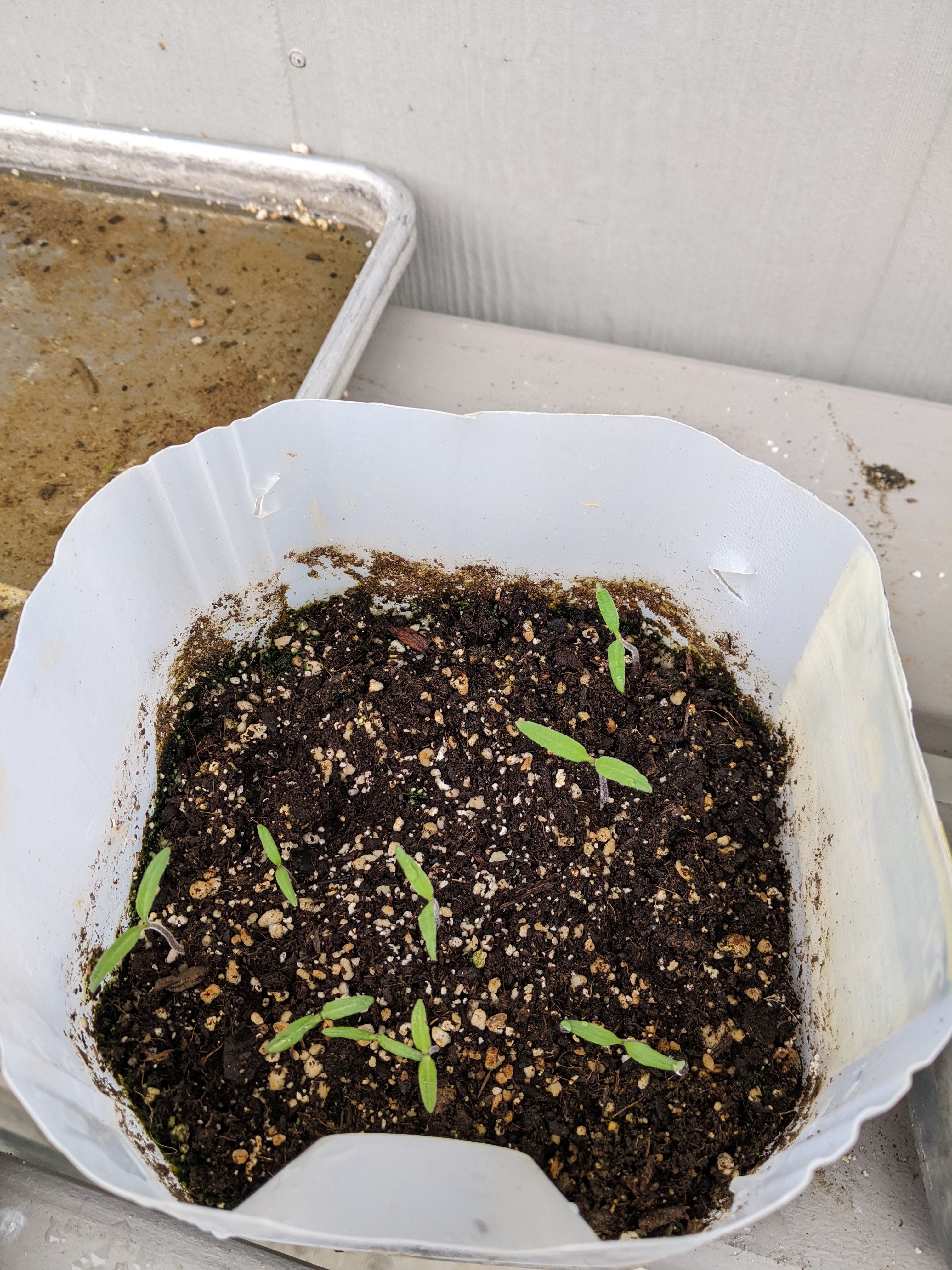 Once they get their first set of real leaves, transplant them into individual pots. Here, I have started another batch of tomatoes (Brandywine) to put in the garden when the first batch of tomatoes gives out.