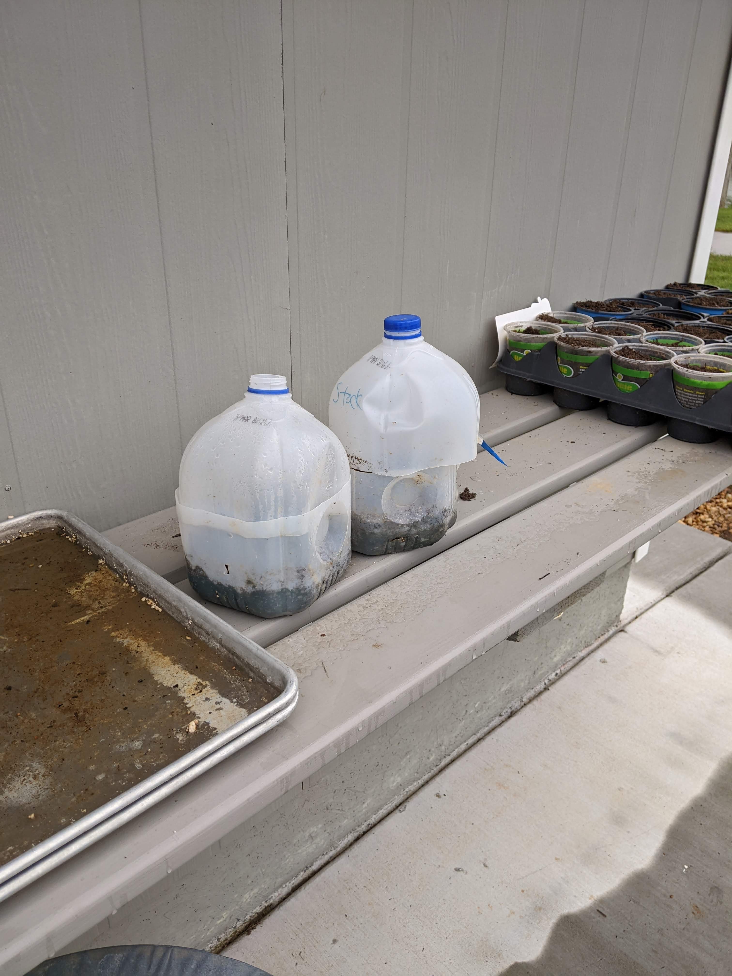 I saw this on Instagram and tried it this year for my tomatoes, peppers, zinnias, and stock. You start with an empty gallon jug and cut it almost in half. Poke some holes in the bottom for drainage.