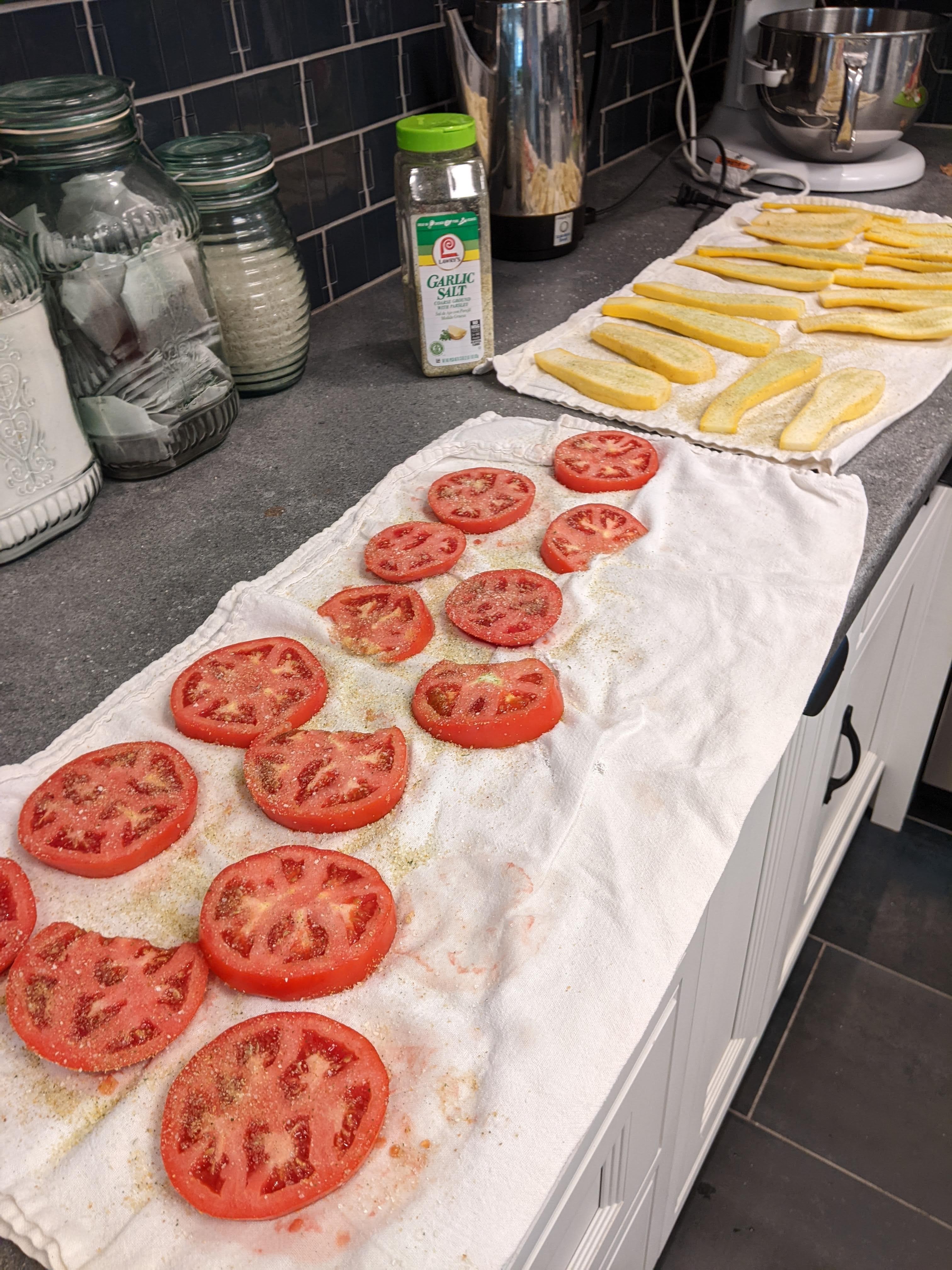 First I started by prepping the squash and tomatoes–6 of each. I sliced the squash into 3rds lengthwise and the tomatoes about 1/4″ thick and laid them on clean towels (or you can use paper towels) and sprinkled them liberally with garlic salt on both sides. I let them sit while I prepped other ingredients.