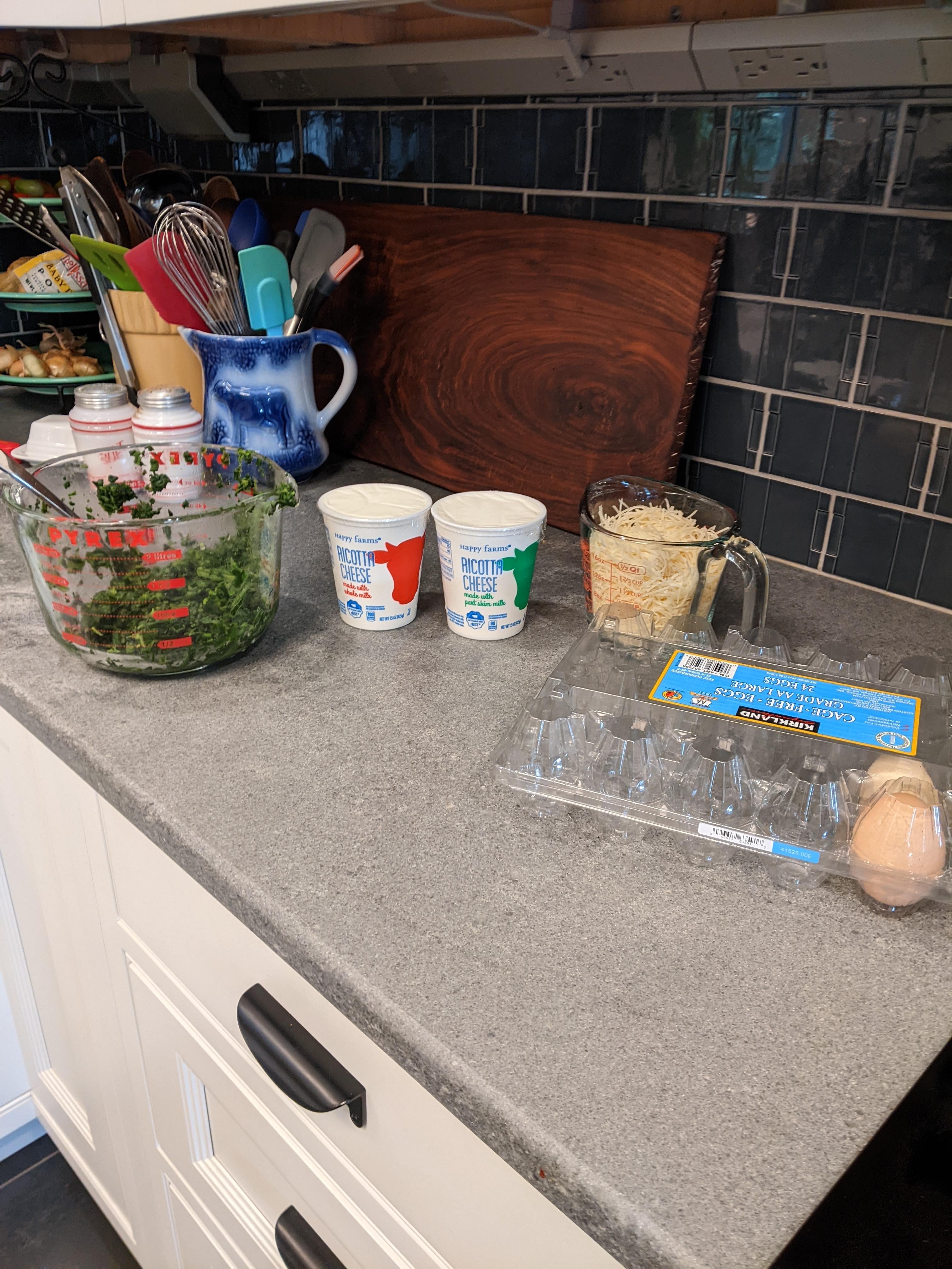 I combined 2 cartons of ricotta cheese, 2 cups shredded parmesan, 2 packages of frozen spinach (defrosted and drained well) and two large eggs.