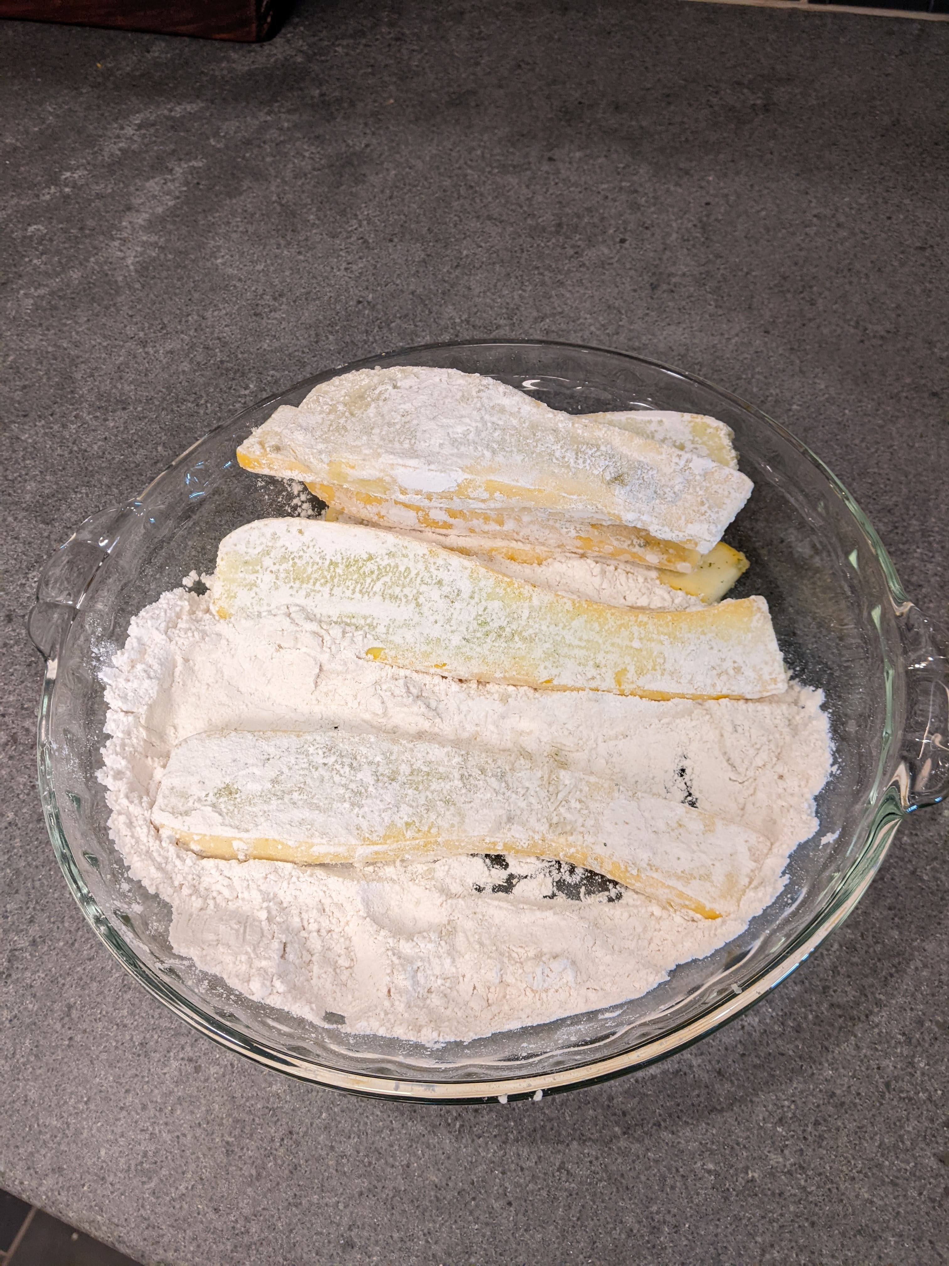 Then I coated the squash planks with plain all purpose flour.