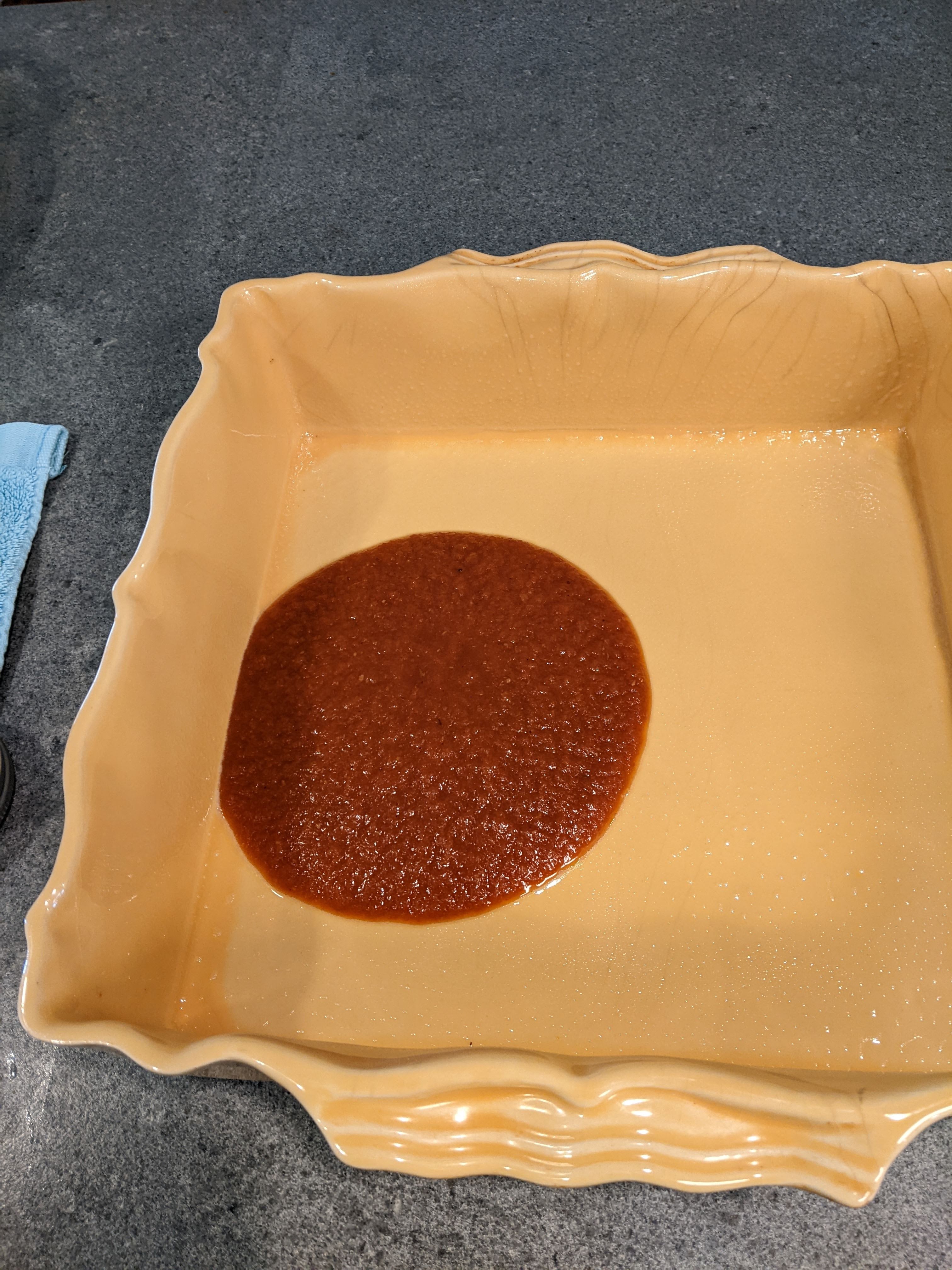 I started by putting about 3/4 cup of tomato sauce in the bottom of a baking dish sprayed with cooking spray.