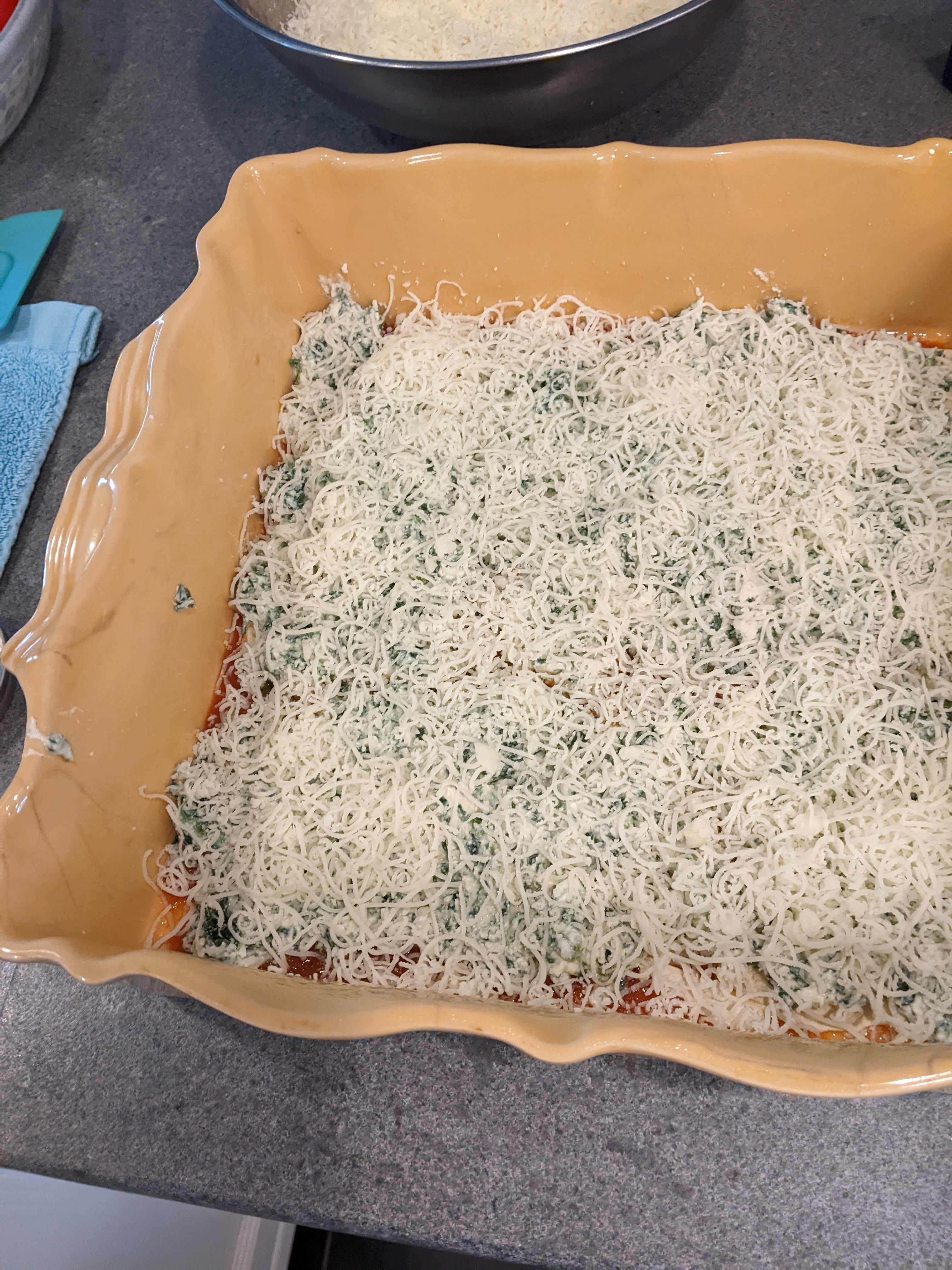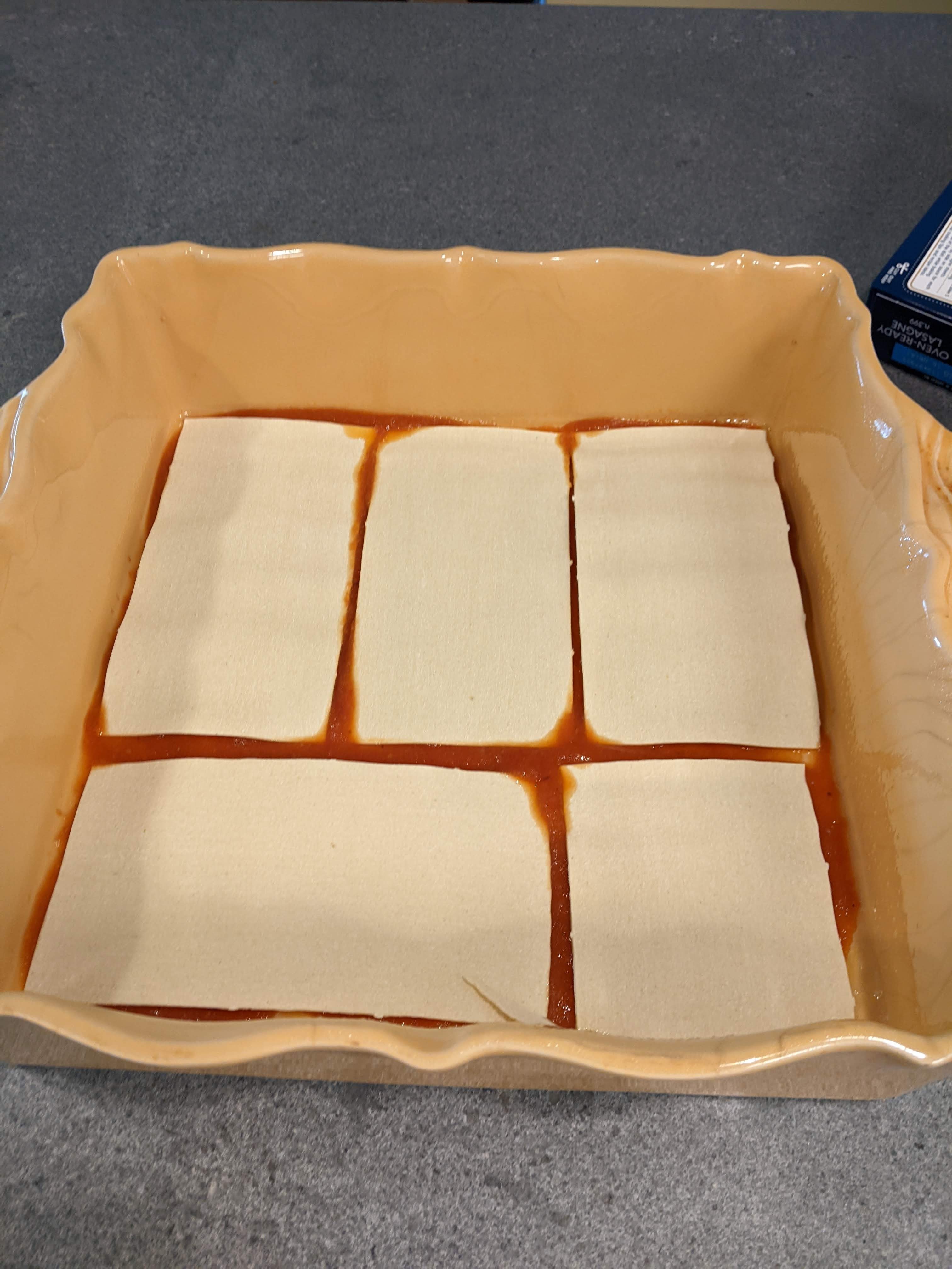 I spread a layer of the filling over the noodles.