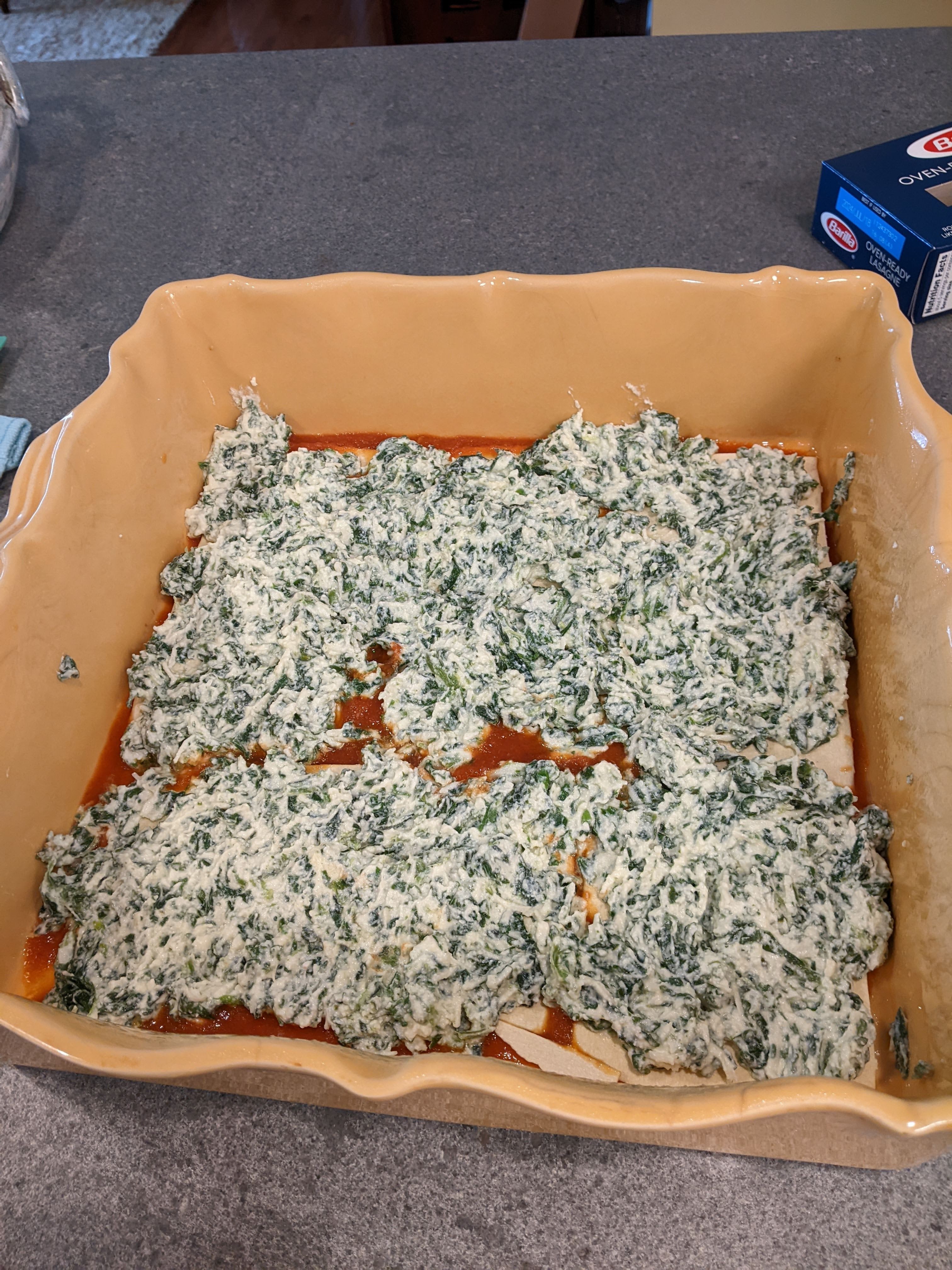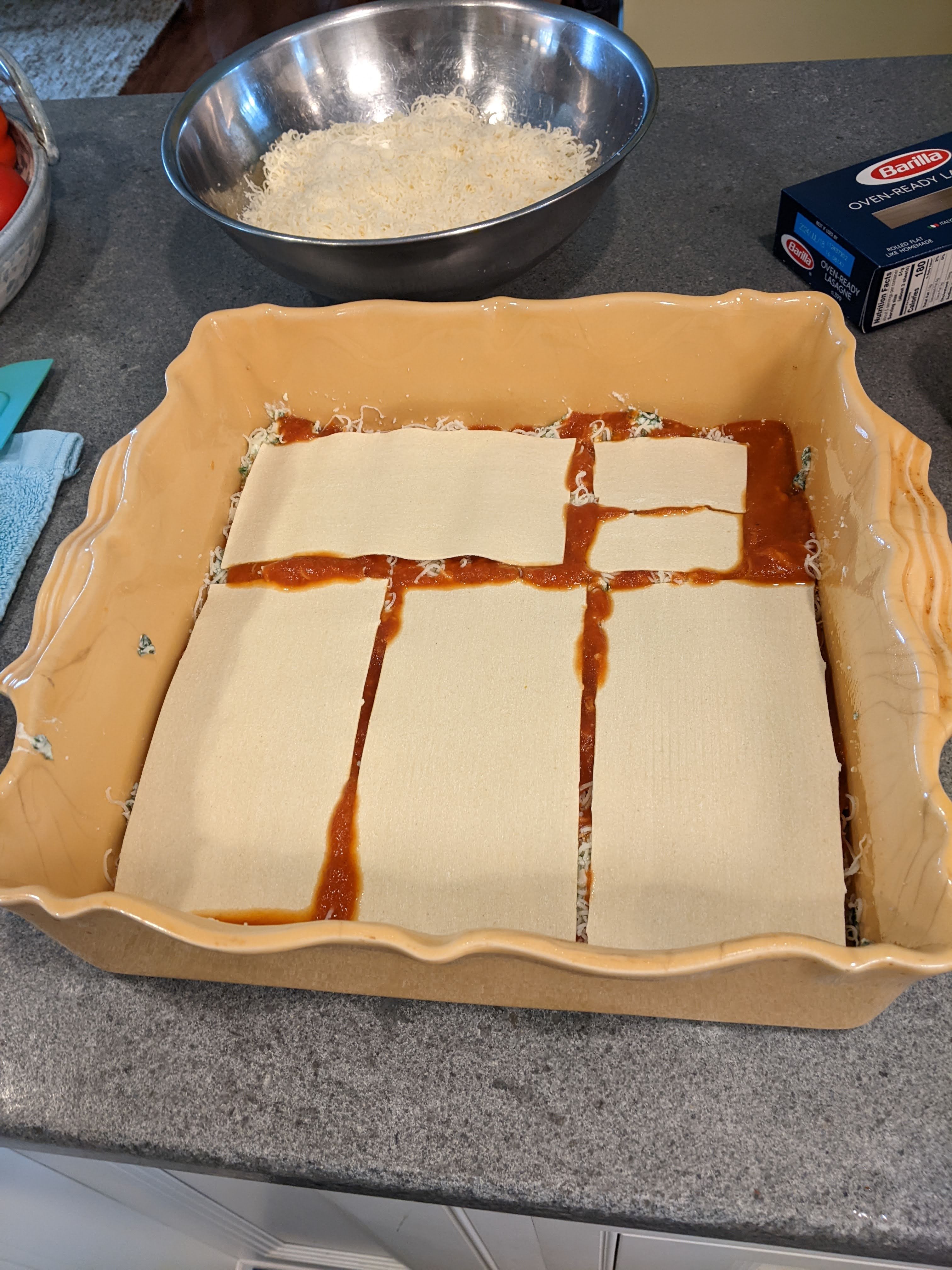 Then I laid 4 1/2 pcs of no-boil Barilla lasagna noodles over that. I don’t prefer this type of noodle, but that is what my little grocery had. I normally get regular noodles and cut them a few minutes shy of being cooked through.
