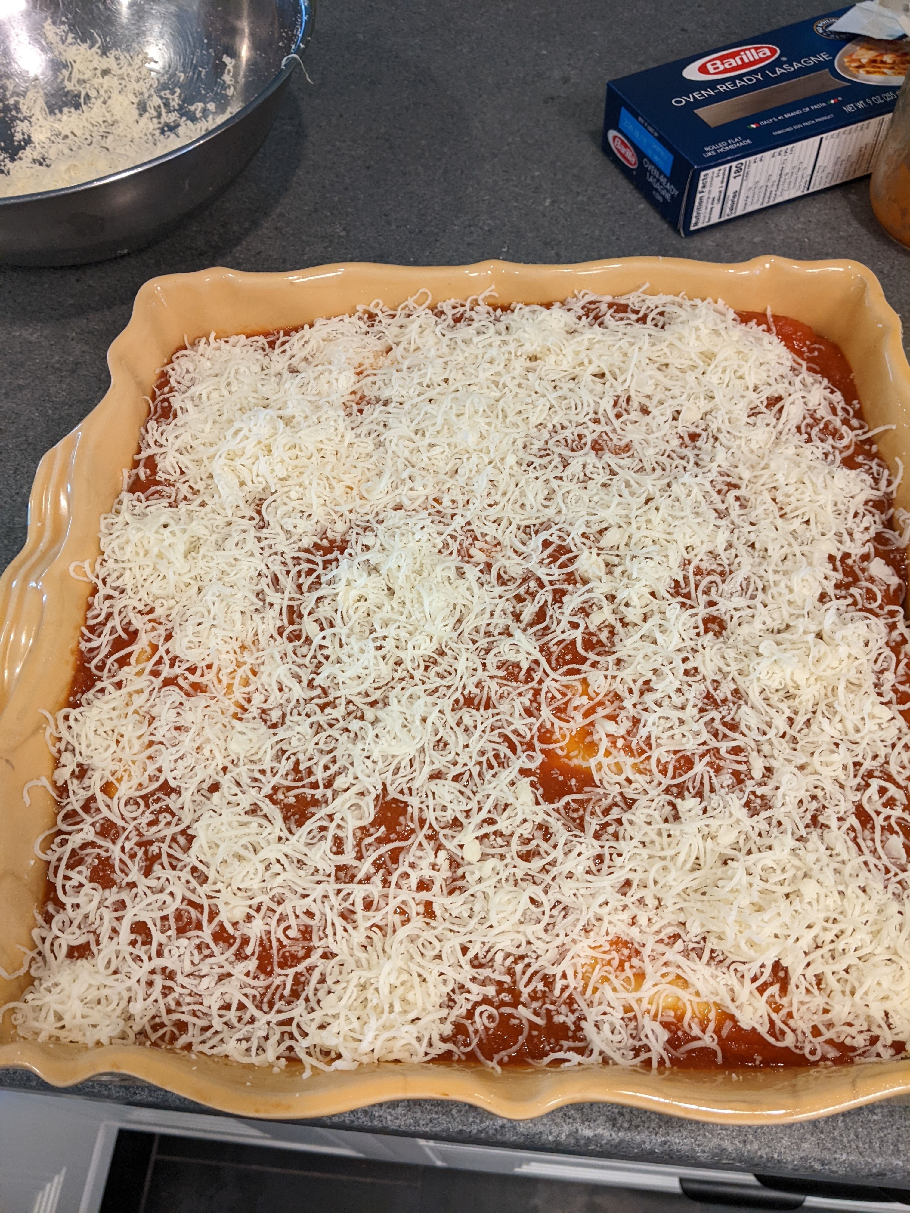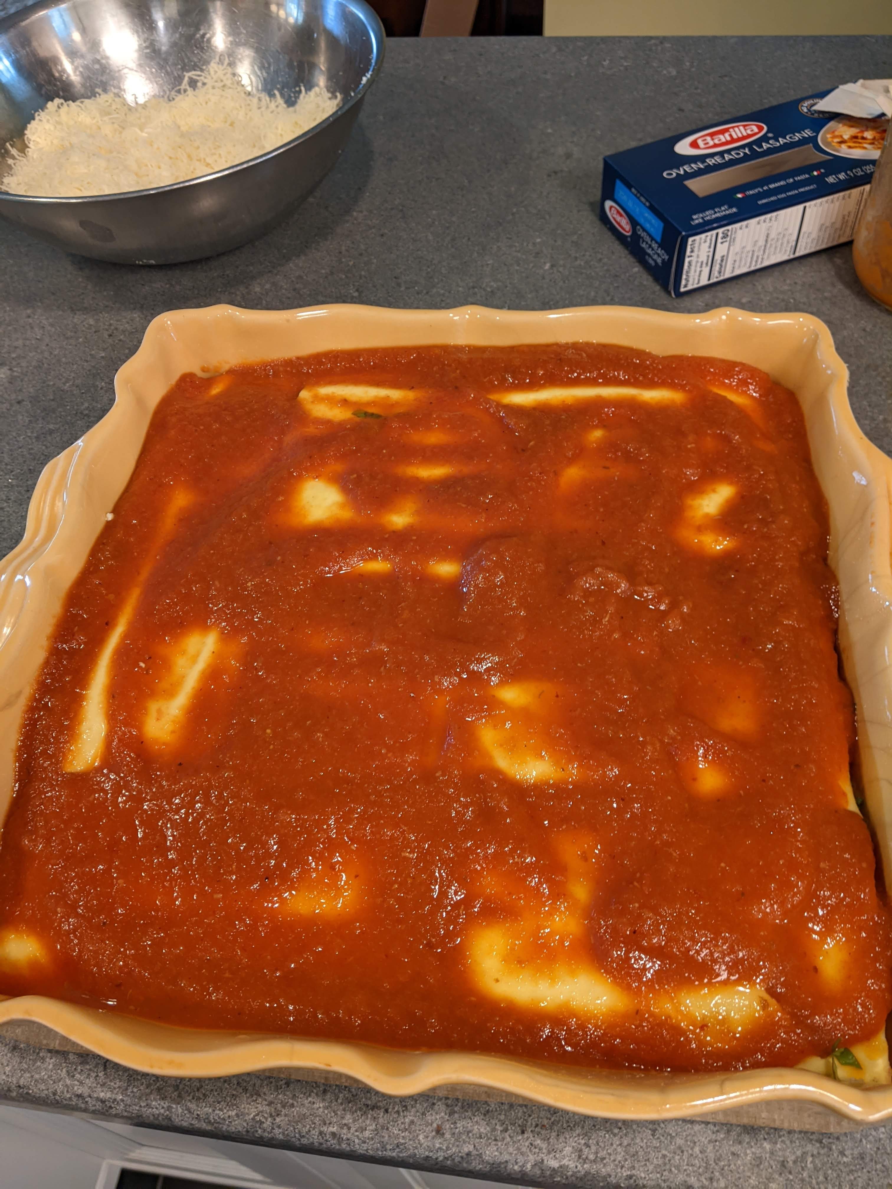 I put the last layer of noodles on and topped it with sauce.