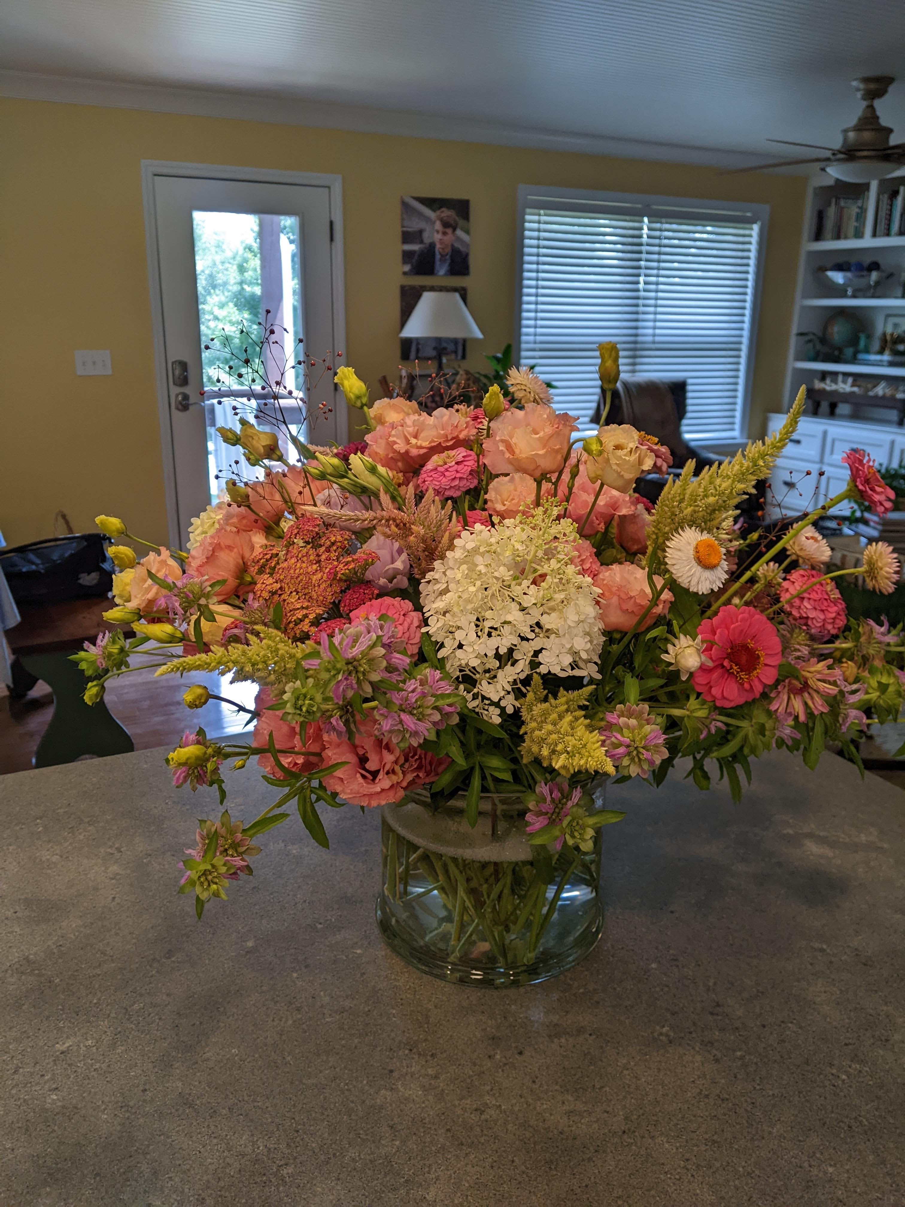 My husband’s cousins came into town to celebrate my MIL’s birthday. I requested a triple bouquet from my flower subscription and boy did she deliver. Ionly added some of my pink zinnias. There was enough for this giant bouquet and flowers for the table, as well as a gorgeous vase of sunflowers for our house. This vase contains lisianthus, zinnias, celosia, strawflowers, hydrangeas, yarrow, and a couple that I don’t know the name of. Her lisianthus has been gorgeous this year and it lasts for a week or more. I highly recommend this flower.