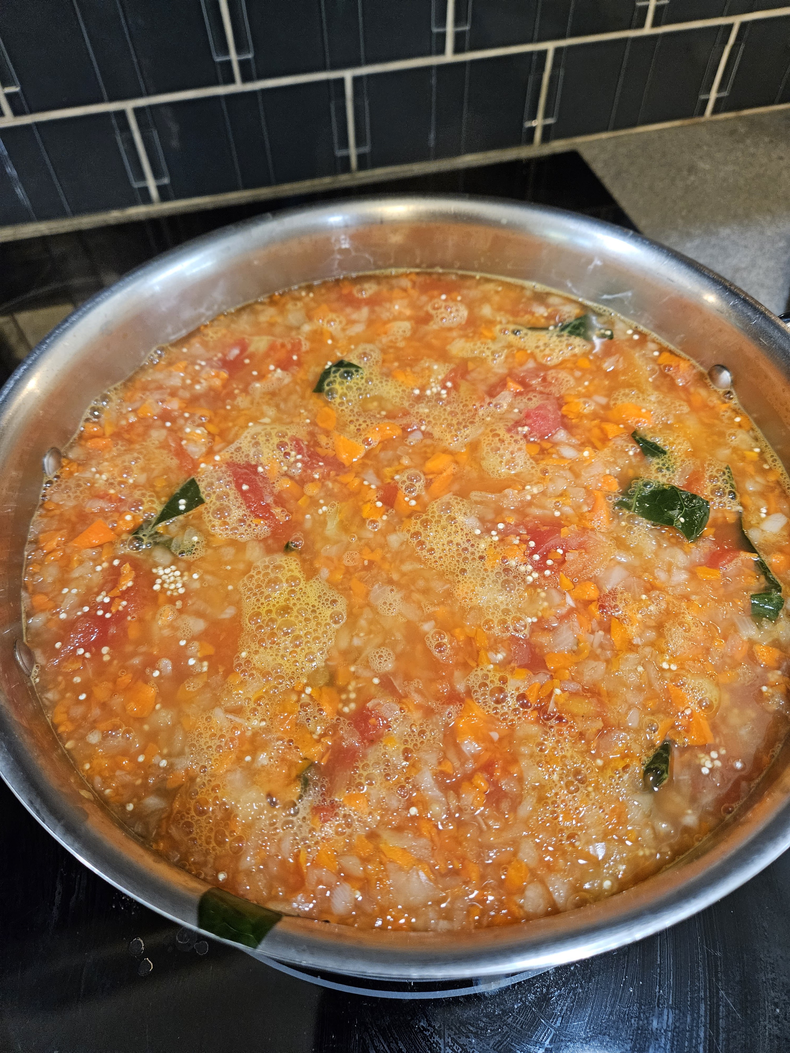 I chopped the carrots (about 1 large carrot/batch) and an onion in the food processor and added it to the broth. I also added the lemon juice and lemon zest and tomatoes, but I don’t drain them. The kale you see is what I was too lazy/impatient to fish out.