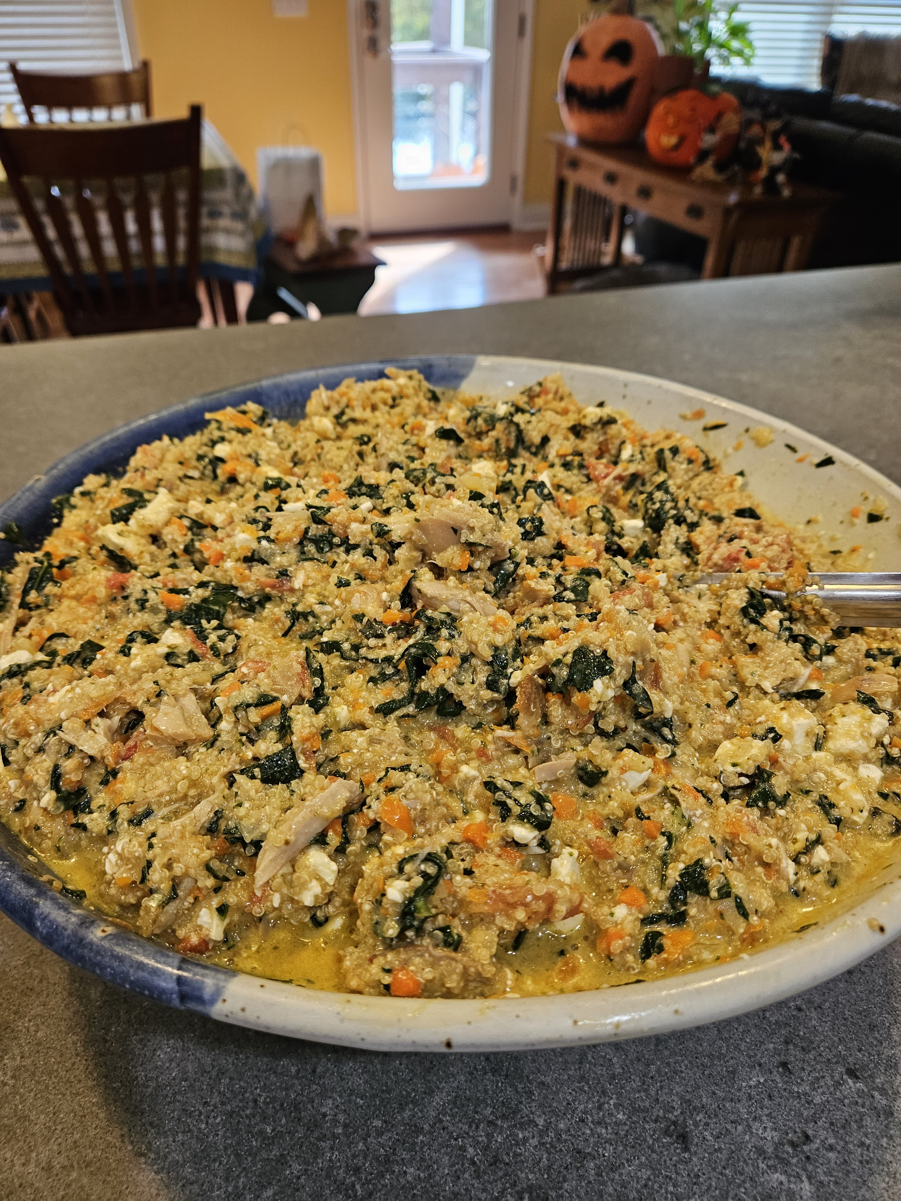 I stirred the quinoa into the turkey, kale and pesto in the large bowl.