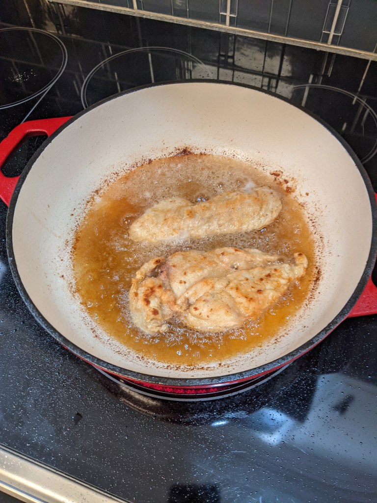 Combine flour, salt, and pepper in a container. Dredge chicken in flour mixture. Heat a pan and add oil to about 1/2 inch. Cook 2 or 3 pieces of chicken until brown–do not crowd the pan.