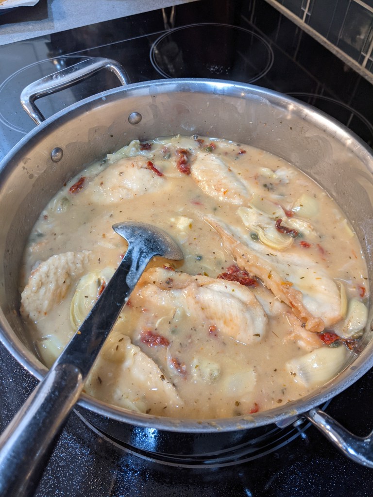 Then I added the capers, artichokes, sun dried tomatoes, and garlic and the remaining stock. The sauce will seem a little thin, but the flour on the chicken will help thicken it.