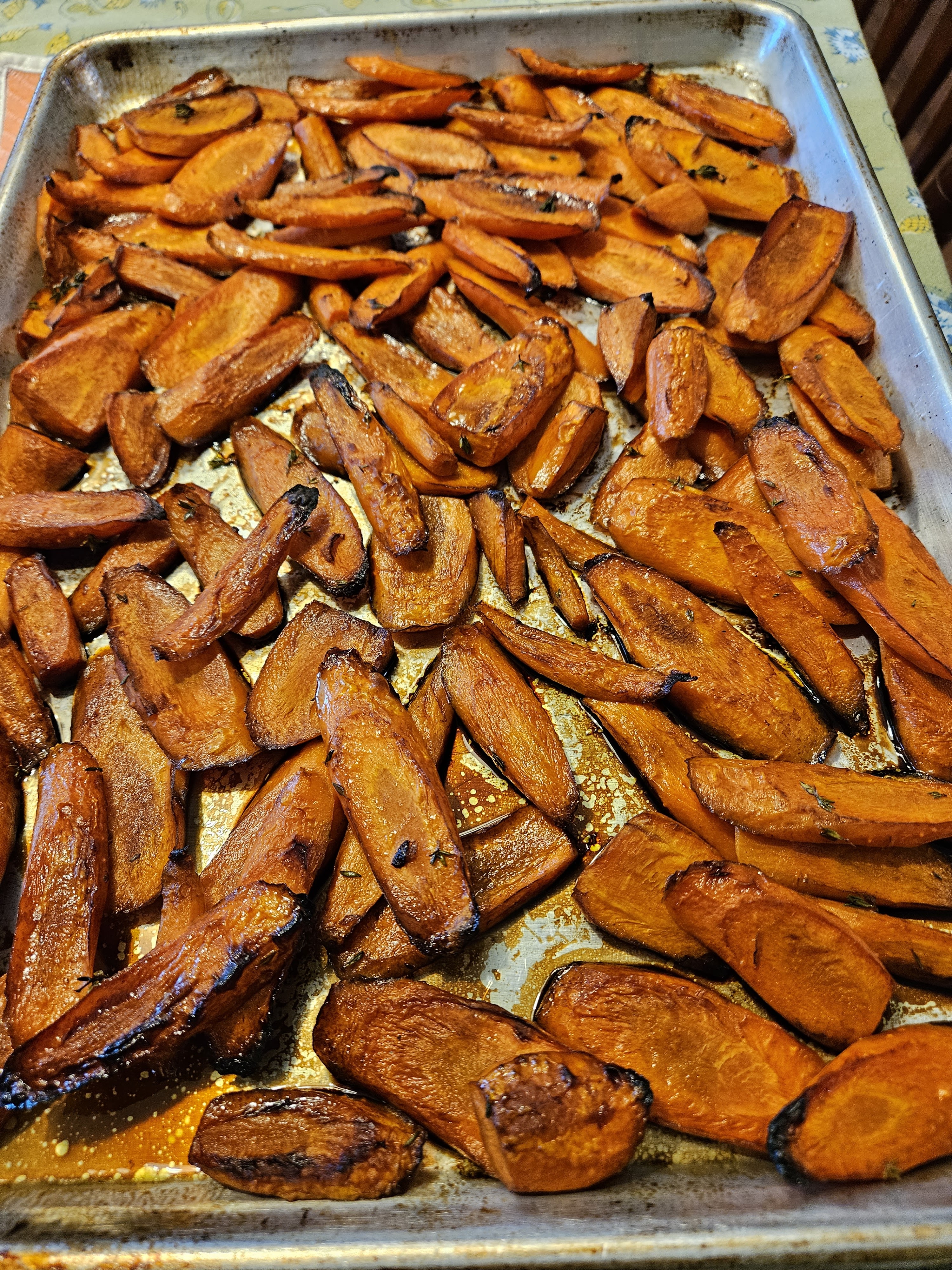 For this many carrots, I mixed 1/4 cup each of balsamic glaze and walnut oil, 2 tsp thyme leaves, and about 1 1/4 tsp smoke salt. I whisked them together until thick and mixed with the carrots until they were thoroughly coated. I roasted them at 425 degrees for 25 minutes.