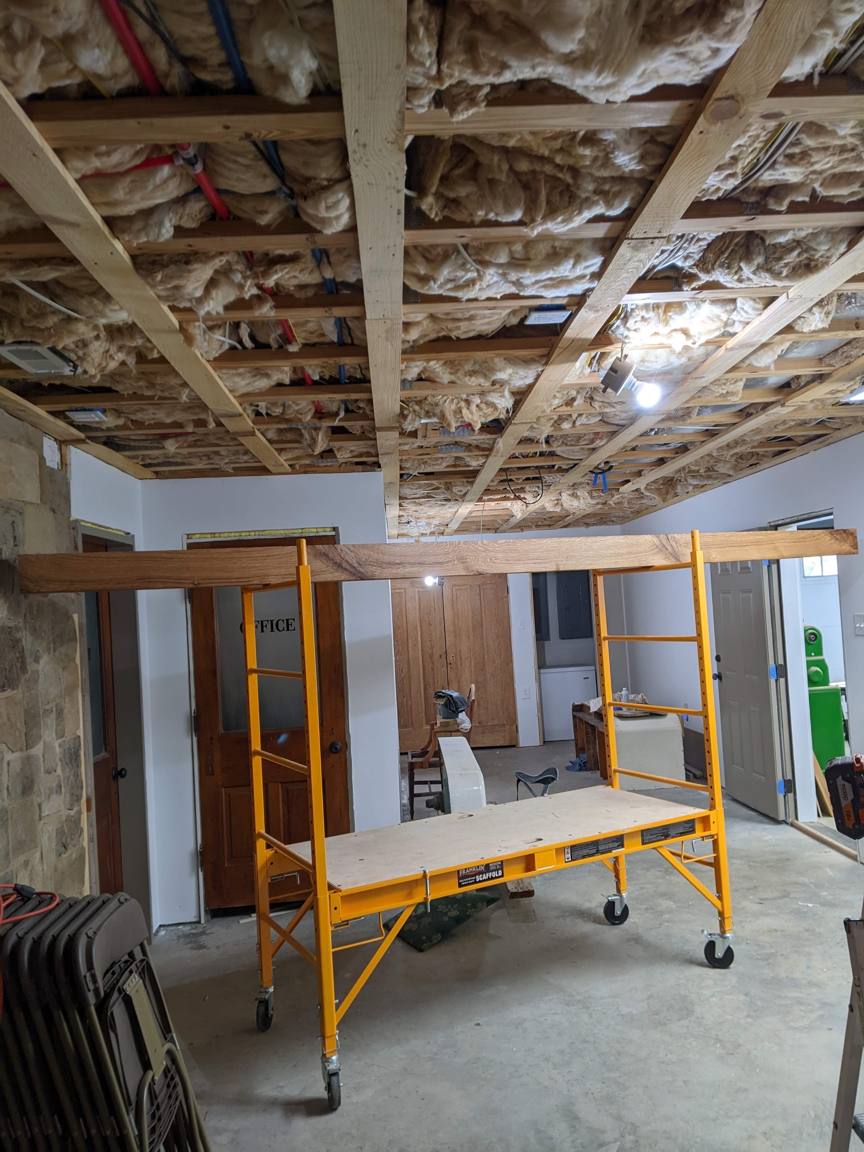 If you’ve been following along, you know that we are going for and 1930’s English pub kind of vibe in the basement because of the space that we’re working with. One of the things that we decided to do was to add oak beams to the ceiling to add a nod to that look.