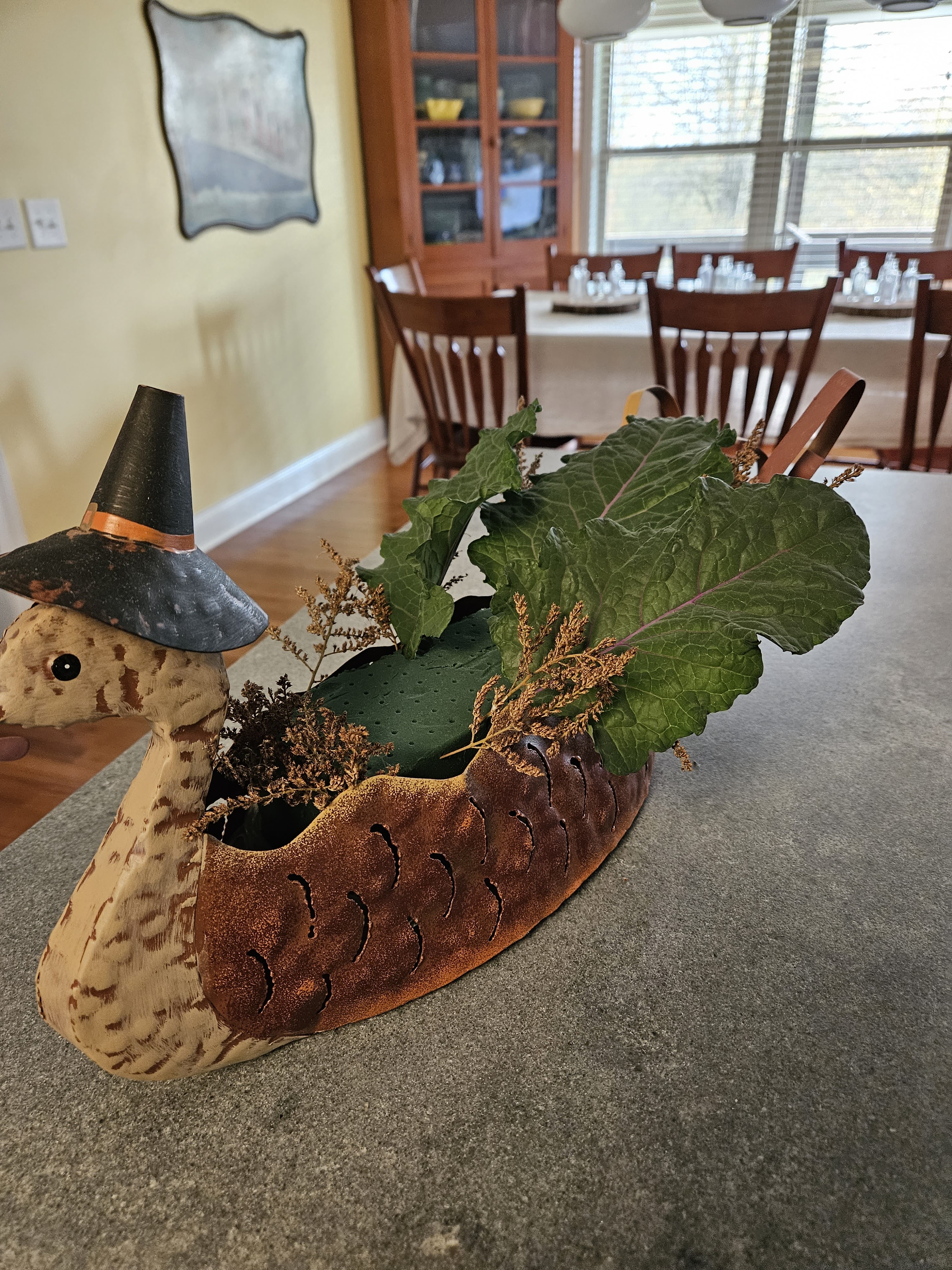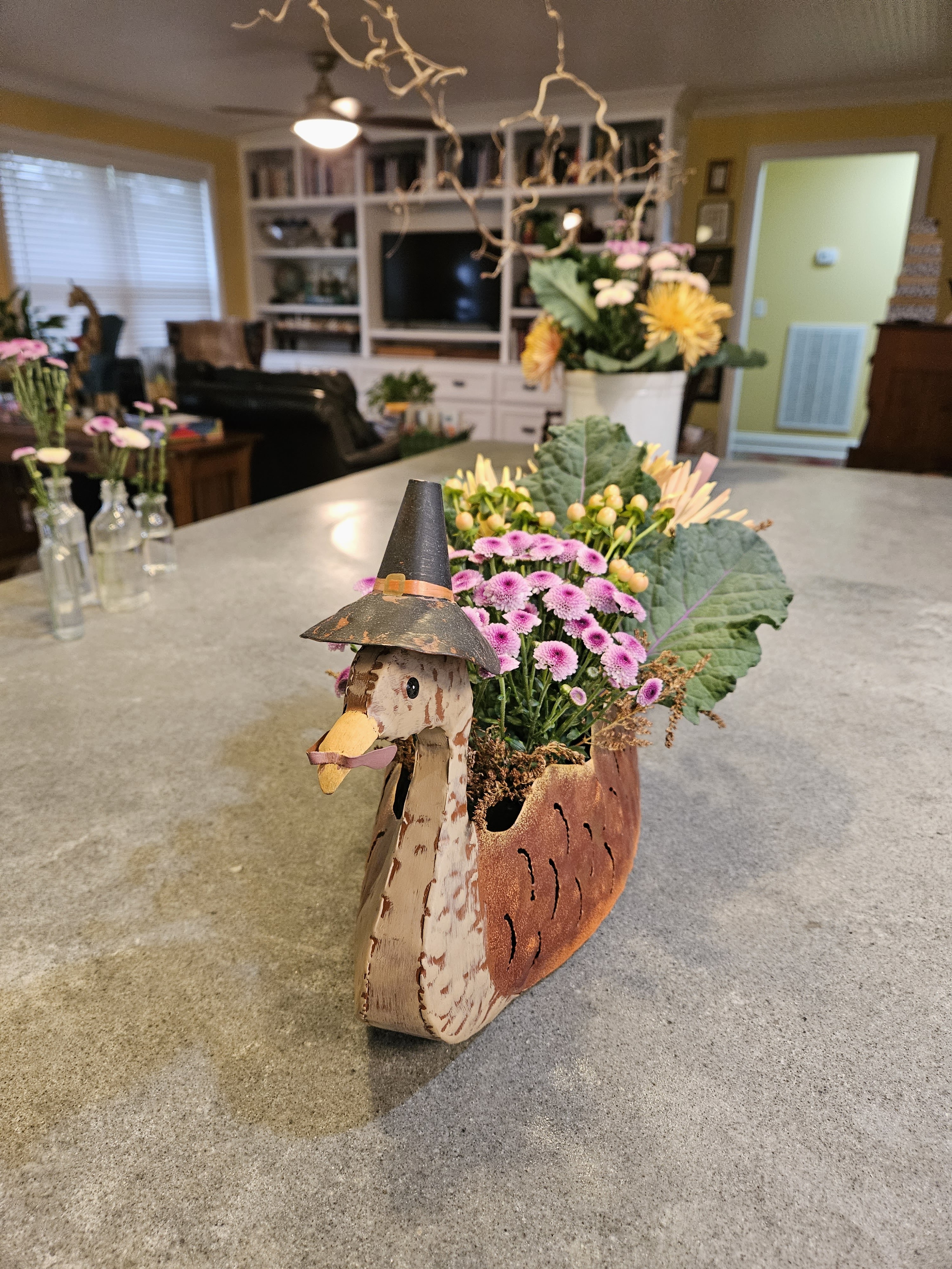 The second flower arrangement is the metal Thanksgiving turkey that I arrange flowers in every Thanksgiving for my mother in law’s kitchen table–it’s a tradition.