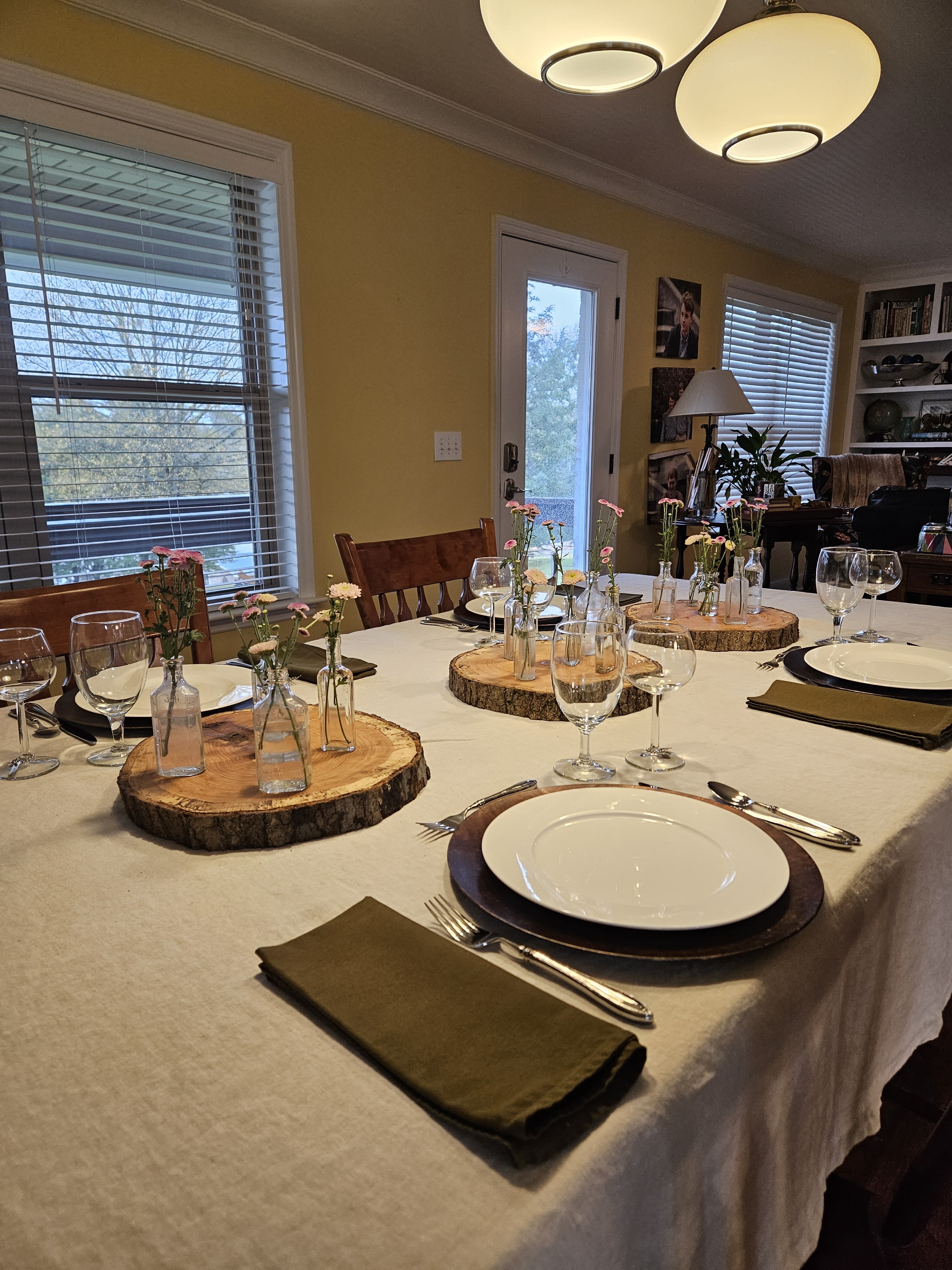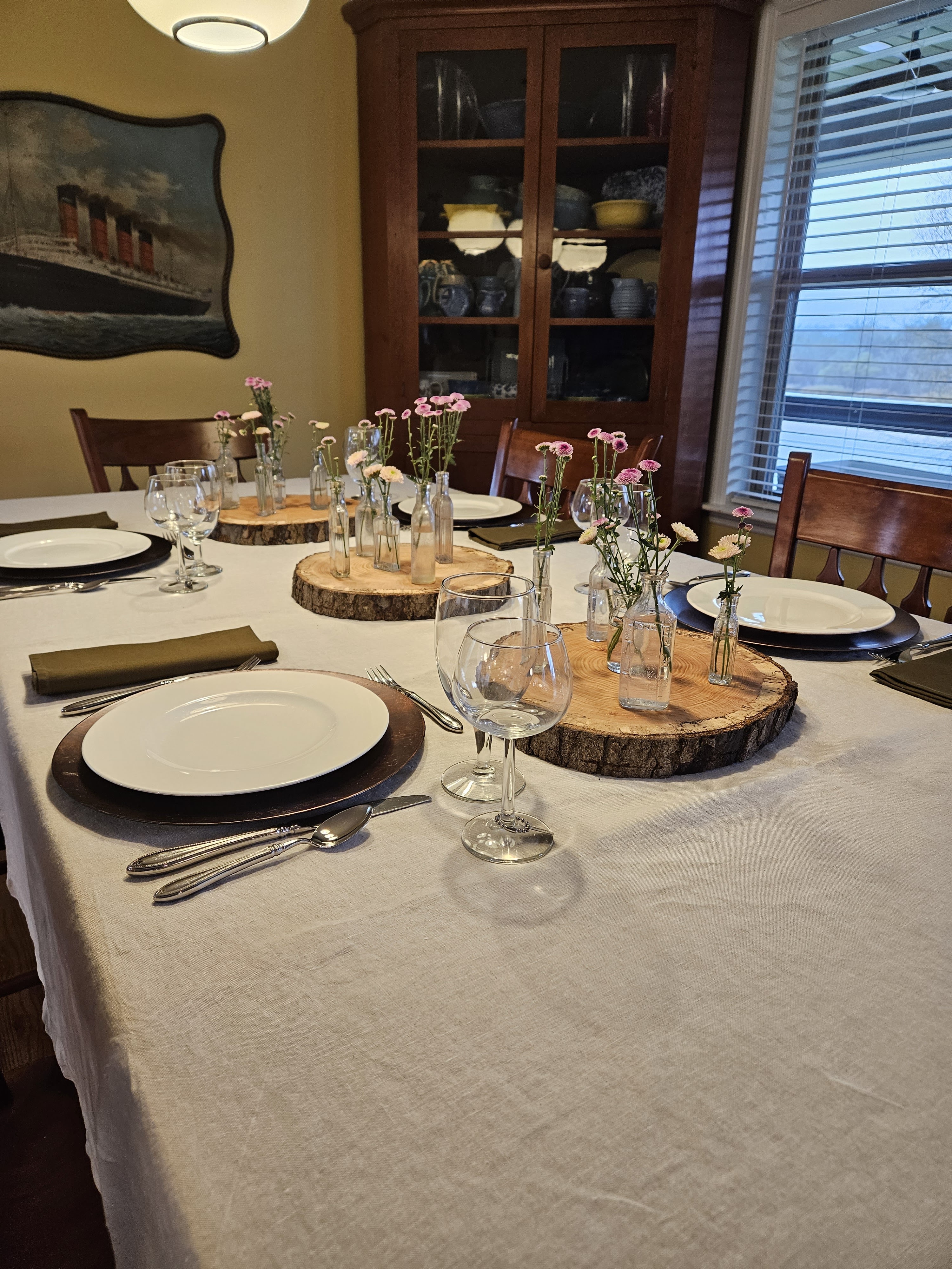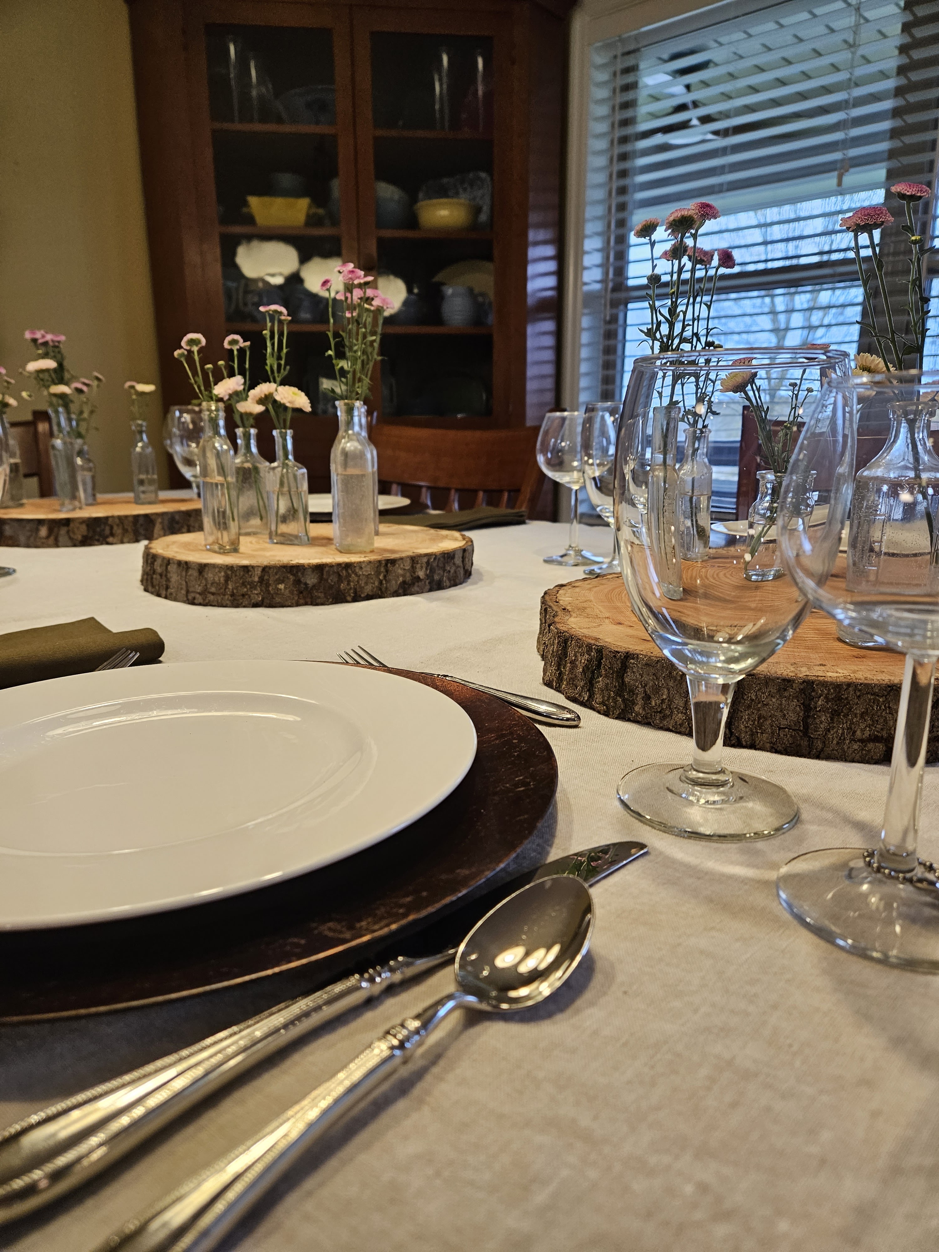 For our table here at the house, I started with a natural color linen hemstitched tablecloth and log slices. I put some vintage apothecary bottles on the log slices and filled them with a few flowers.
