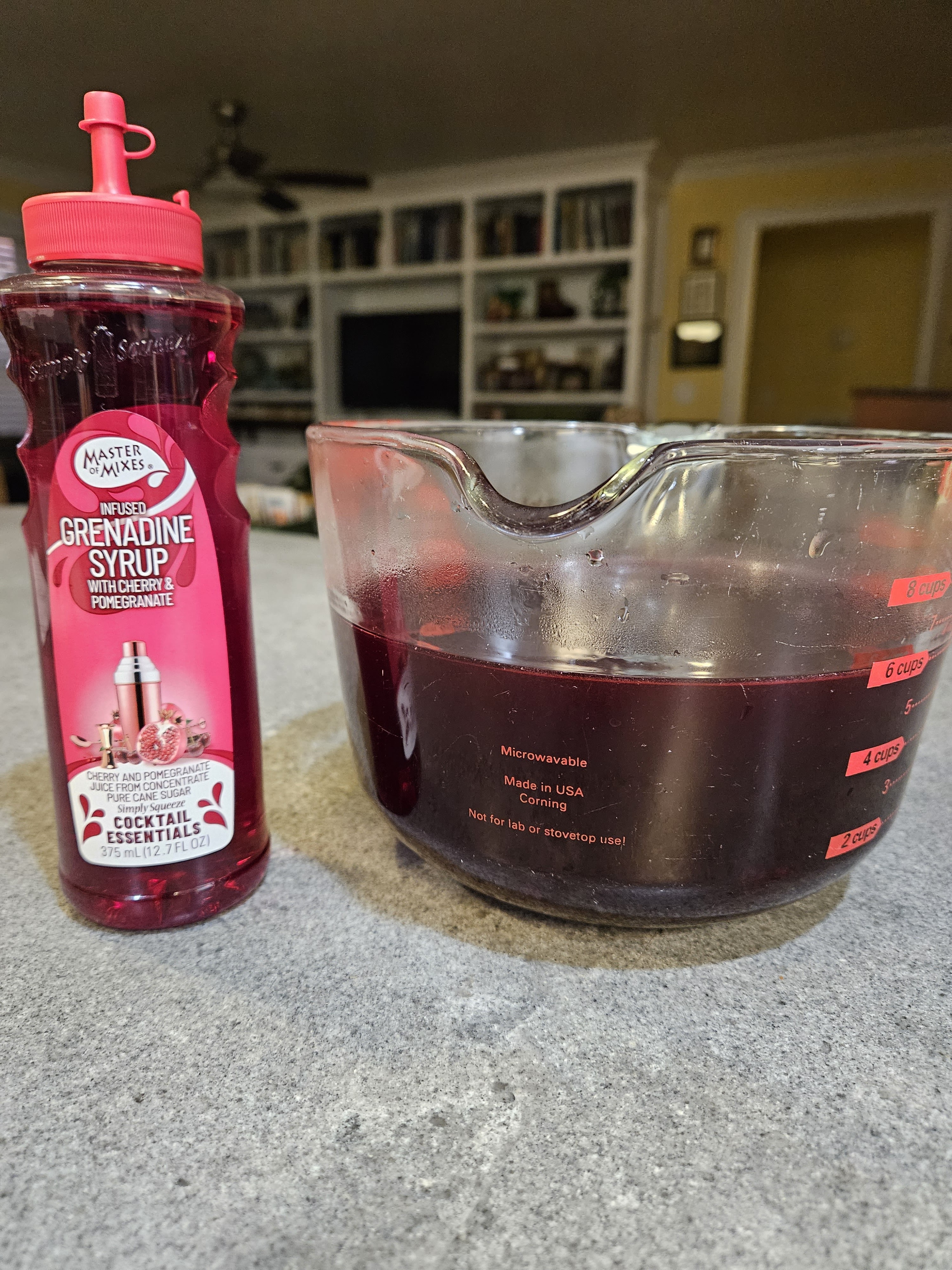 Here’s what it looks like compared to the commercial grenadine (which is only 15% juice and is cherry and pomegranate flavors):
