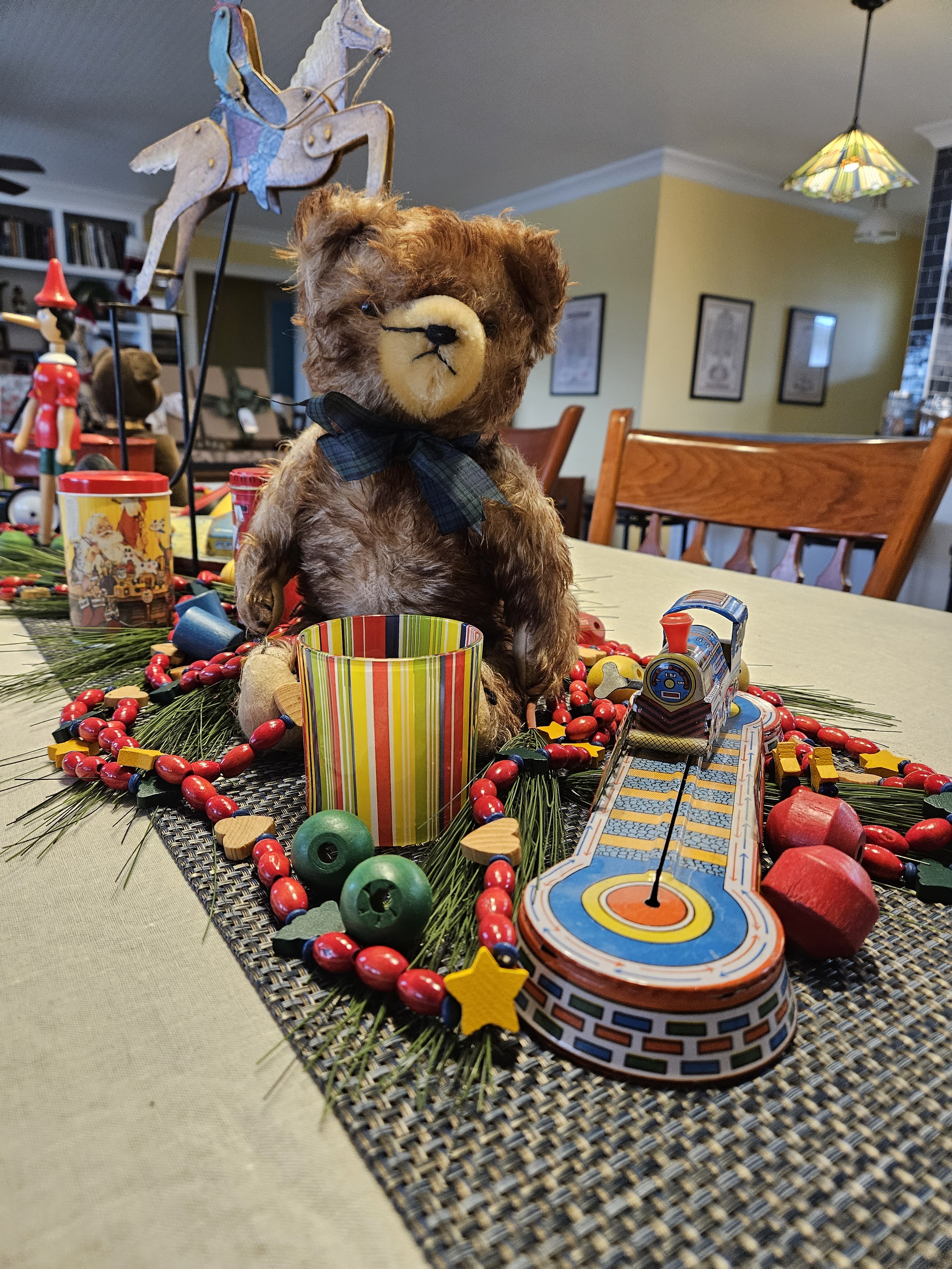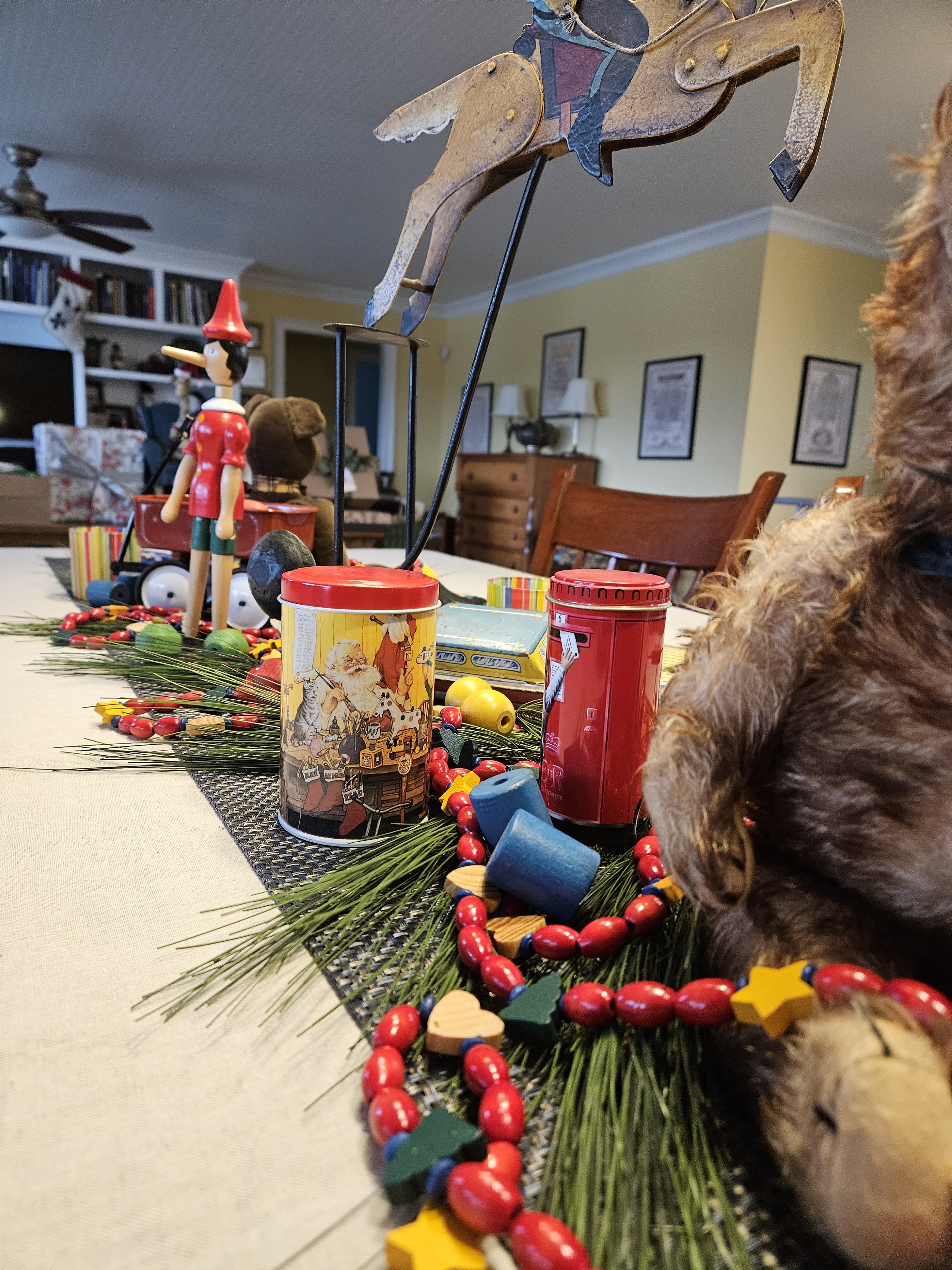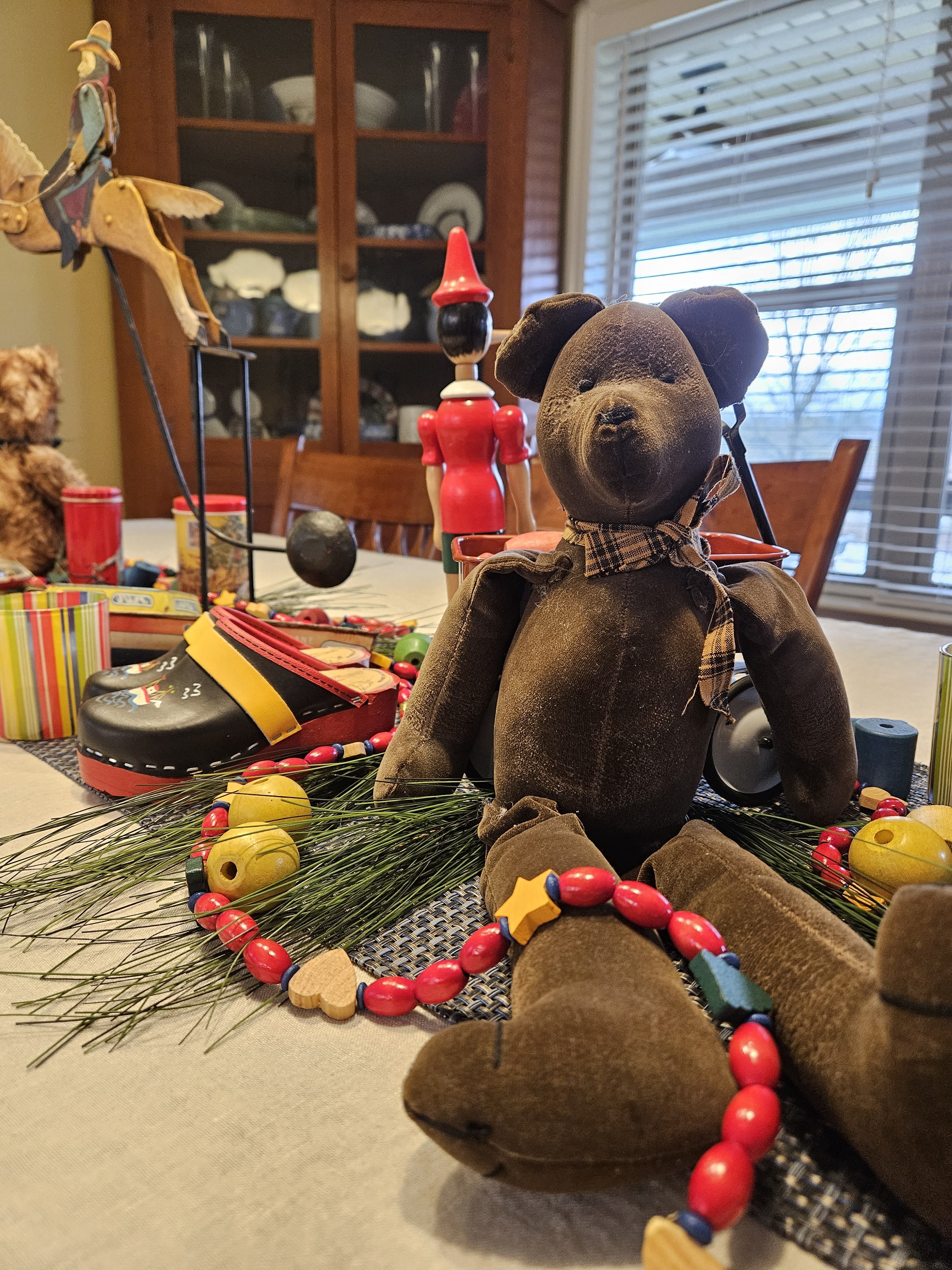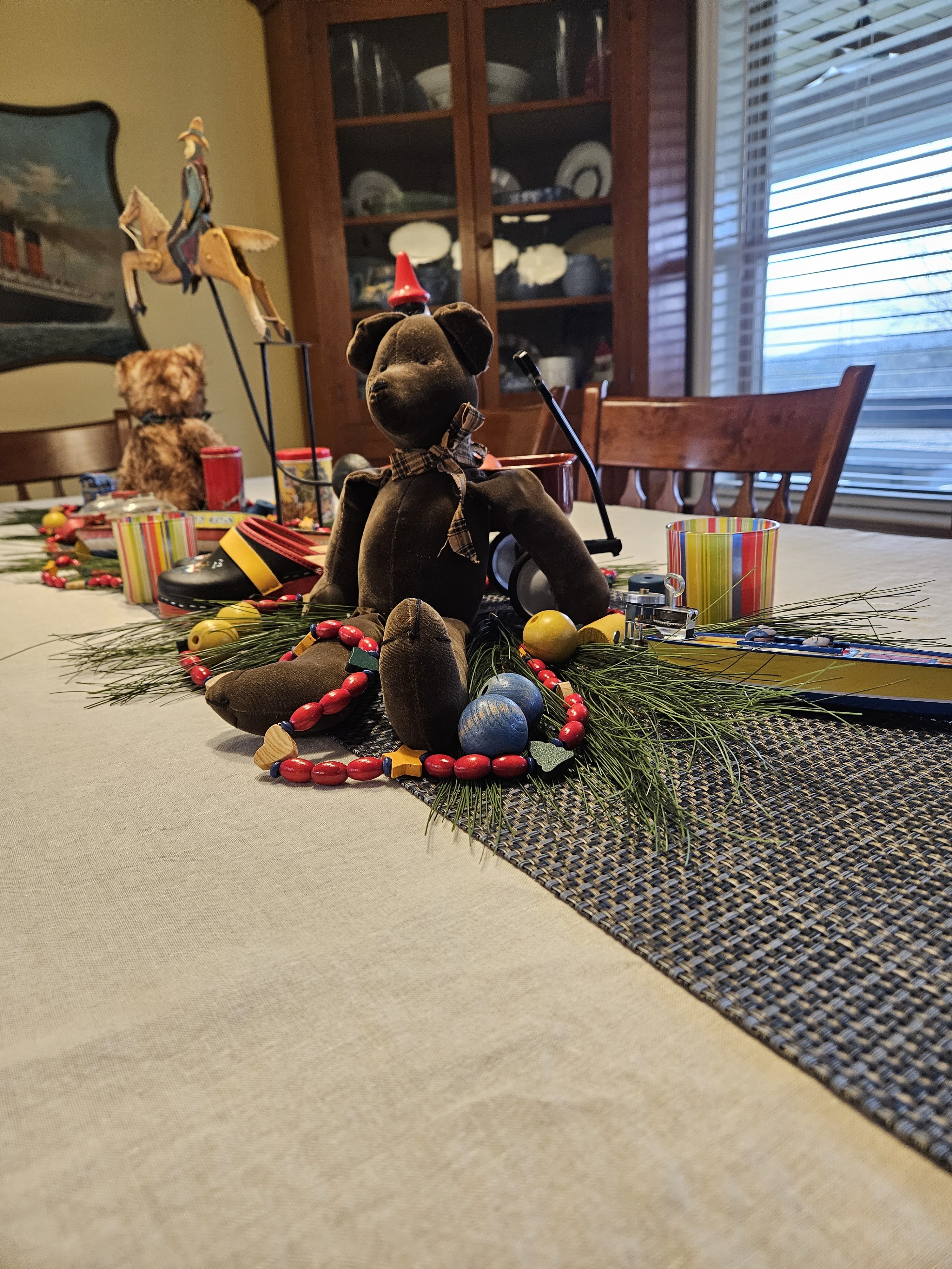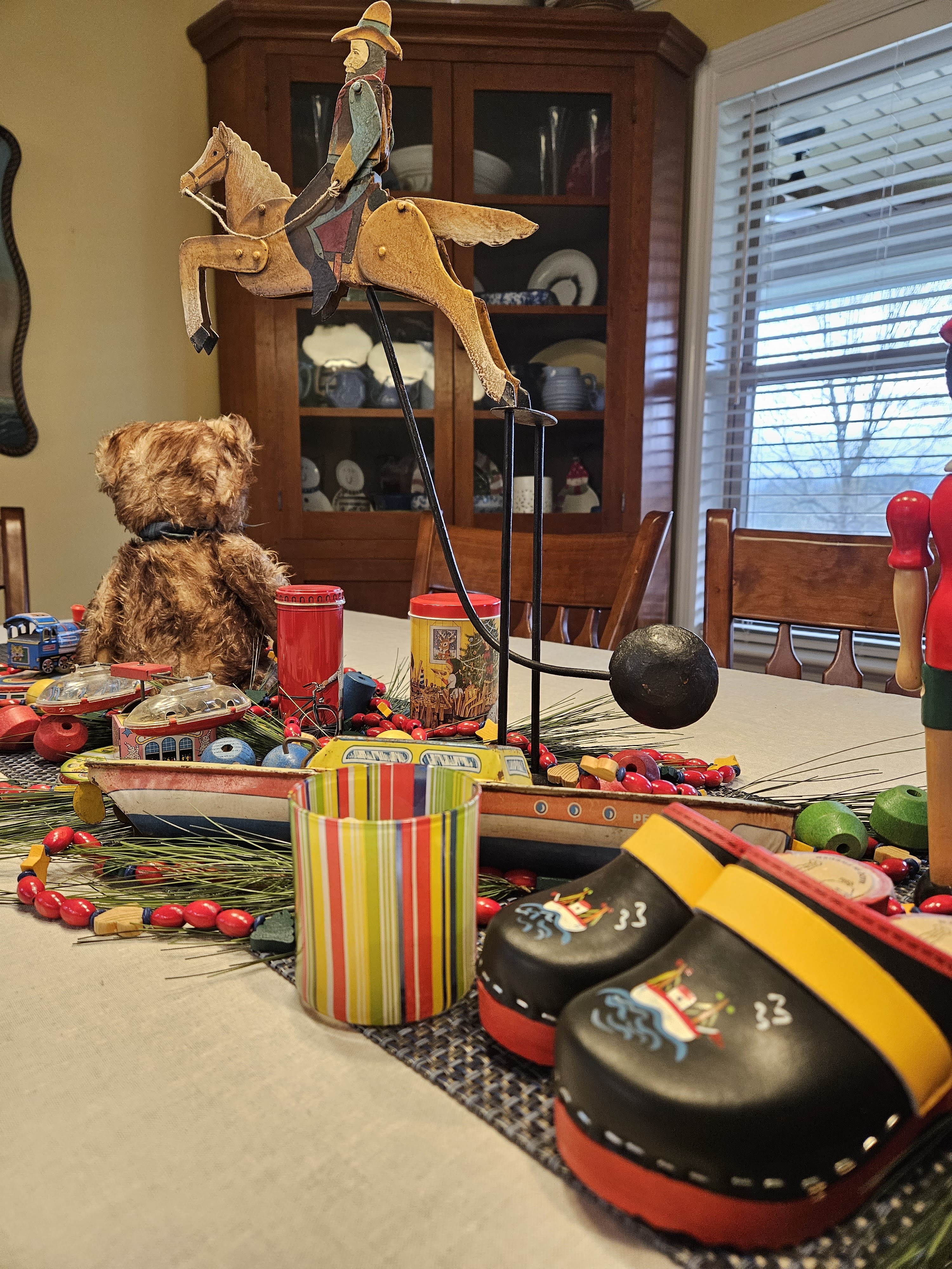 I went back to the idea I had for the Toyland Table, but made some additions. I used the washed natural linen cloth and a woven navy/tan runner. On top of that, I used a bunch of vintage/vintage look toys. I added faux long leaf pine and a cute wooden bead garland and added the vintage stacking wooden beads I found at a antique mall recently–like they were ornaments. I also used some striped candle holders that aren’t Christmas, but work great with the colors of all the items that I used. I think that it turned out really cute.