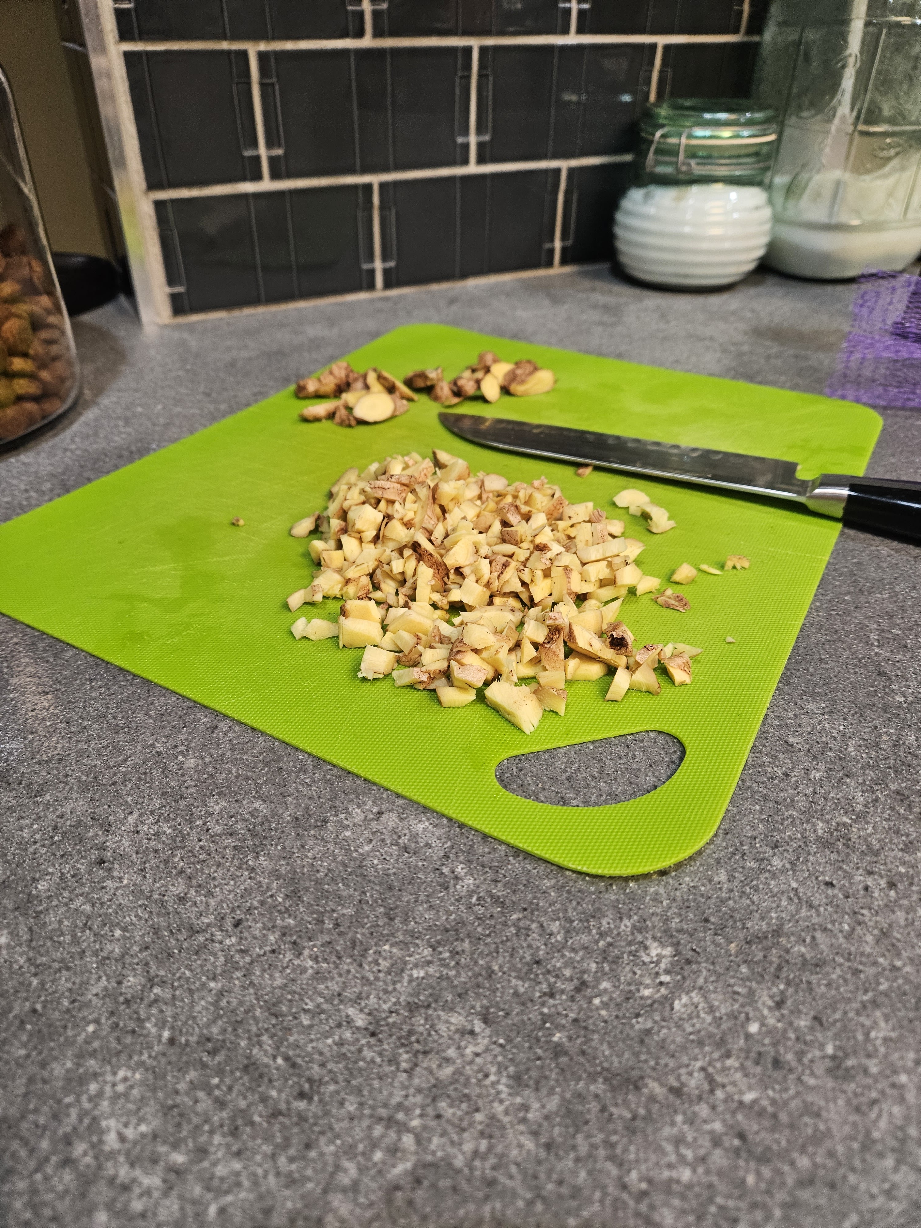 This is a standard simple syrup–1 part water to 1 part sugar. I used brown sugar instead of white sugar, but you can do whichever you prefer. For what I am showing here, I used 3 cups of each and then I chopped up my freshly washed and trimmed ginger root and added it to the still hot liquid. I let it steep for about an hour and strained the ginger out with a fine mesh strainer. Here is how much ginger I used: