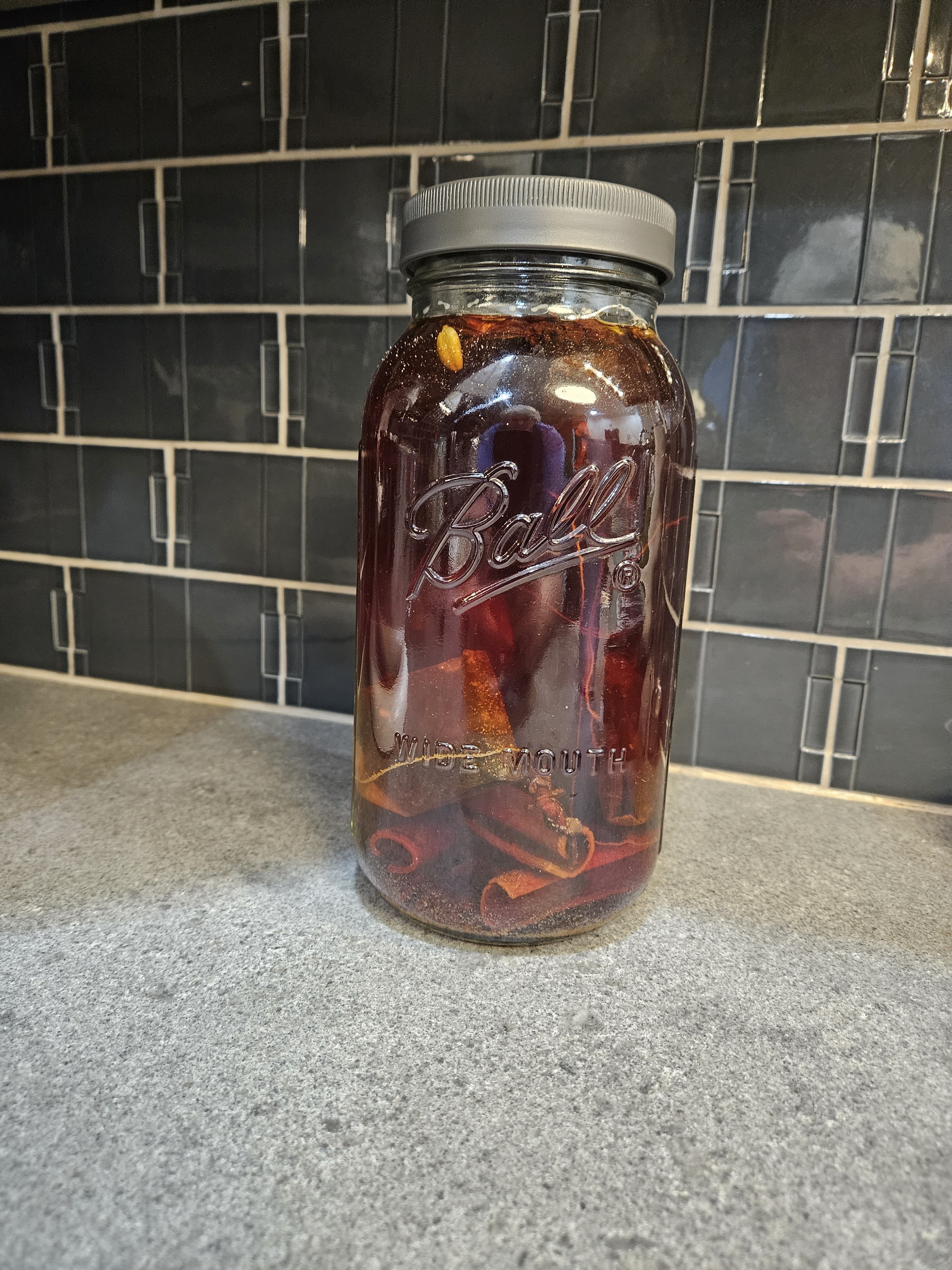 I started with a 1.75 of Wild Turkey bourbon for this batch. I poured it into a half gallon mason jar and added 8 chai tea bags, about 8 cardamom pods, 6 star anise, a tablespoon of whole cloves, and 8 cinnamon sticks. I grated about 3/4 tsp of fresh nutmeg into it as well.