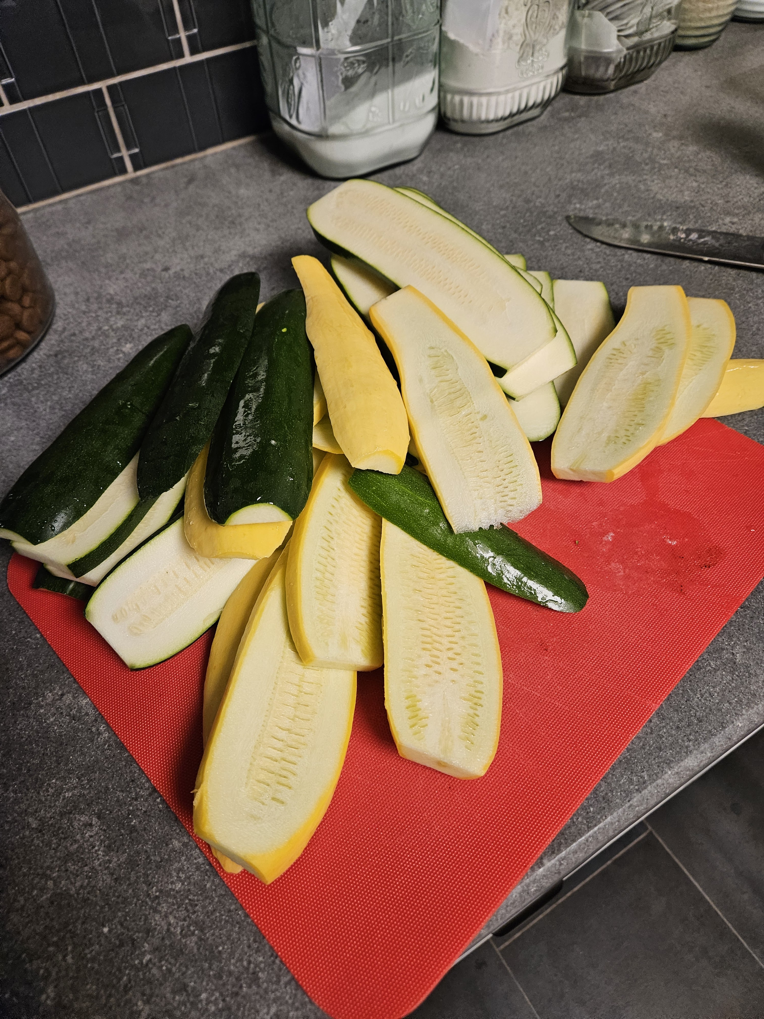 Zucchini and Yellow Squash cut lengthwise into 1/4″ slices