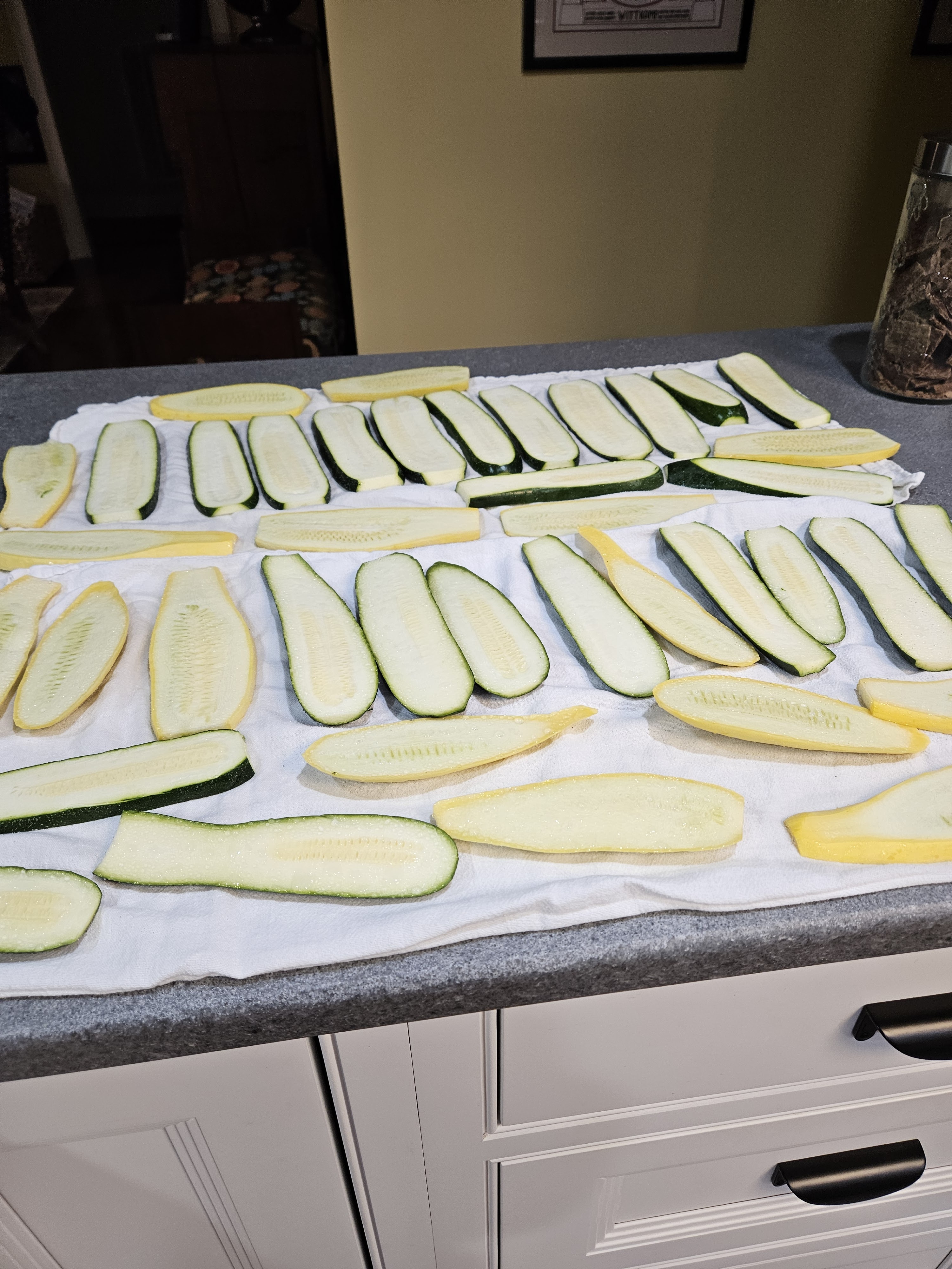 Lay out 2 clean dish towels on the counter and lay the squash on them and then salt them–both sides for those that are cut on both sides.