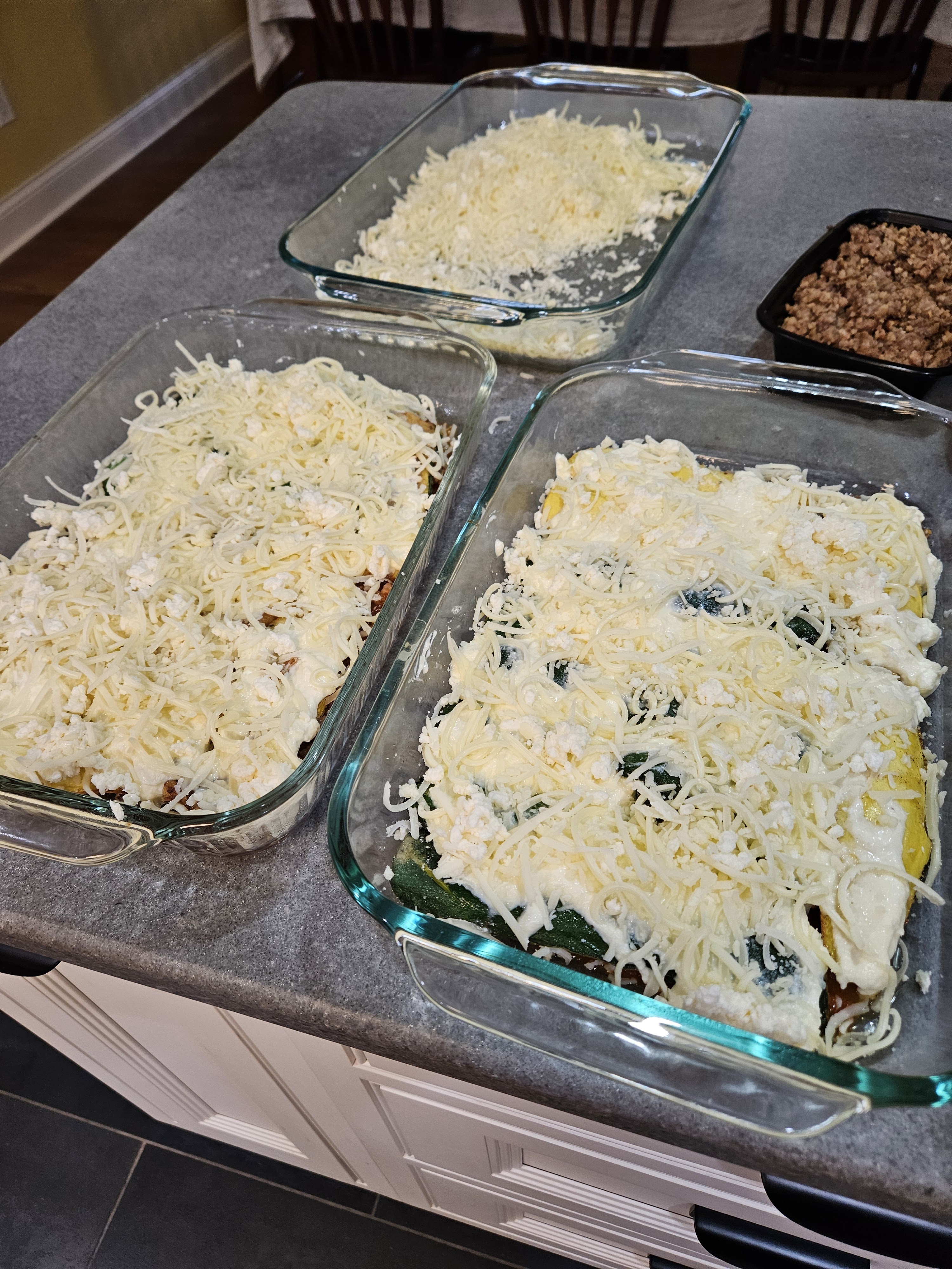 I also shredded 3–8 oz packages of mozzarella and 8 oz of fresh mozzarella.