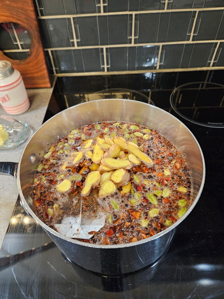 The recipe also calls for fresh ginger, and may call for additional spices (one I found calls for fennel which would double up on the licorice flavor in my opinion.) The best place I have found to get all these spices and not break the bank, is to go to an Indian grocery. They sell the spices in BULK, and the prices are SO MUCH BETTER than the regular grocery store. I use Luzianne decaf family sized tea bags–since I drink it cold, and try to avoid caffeine after lunch.