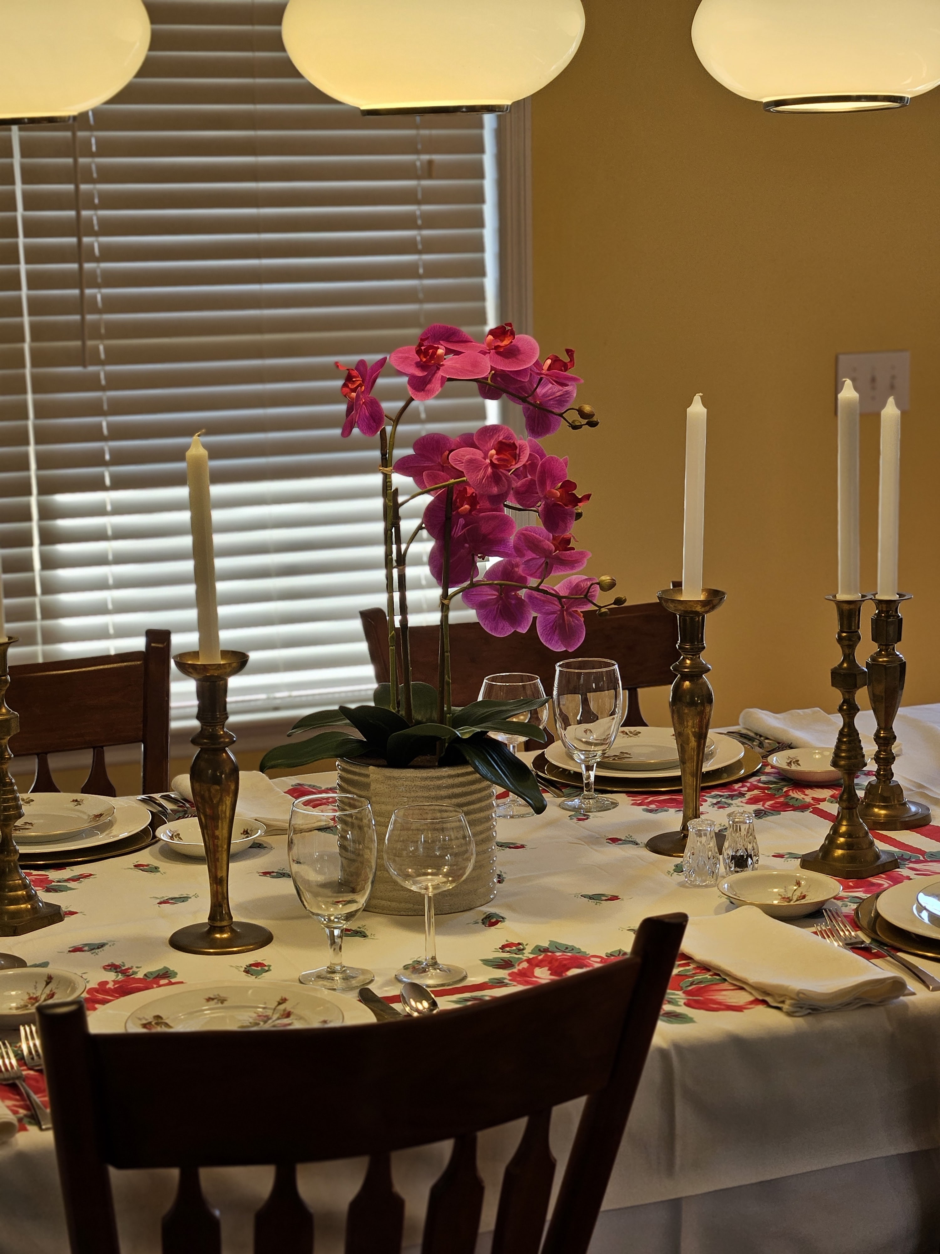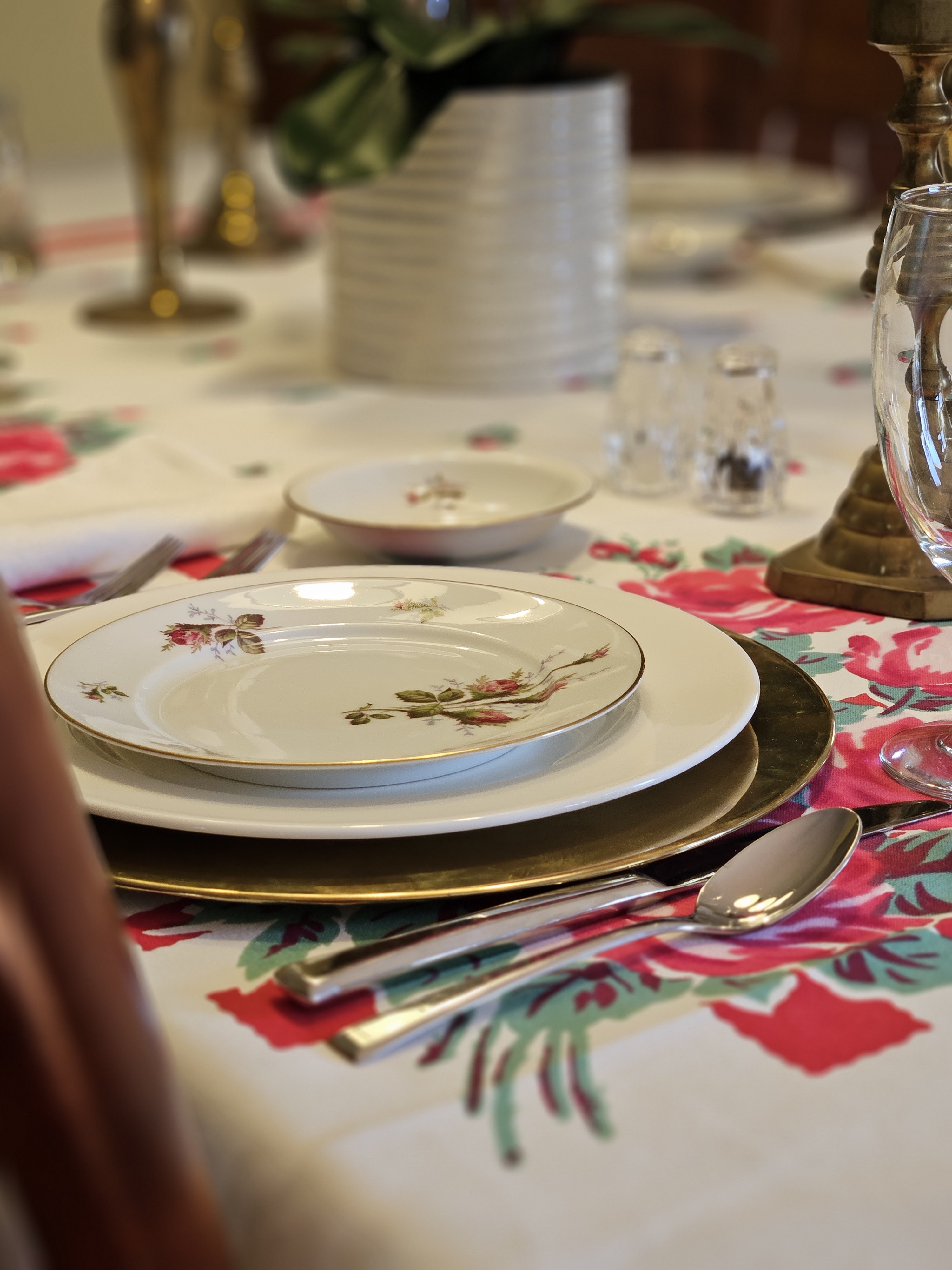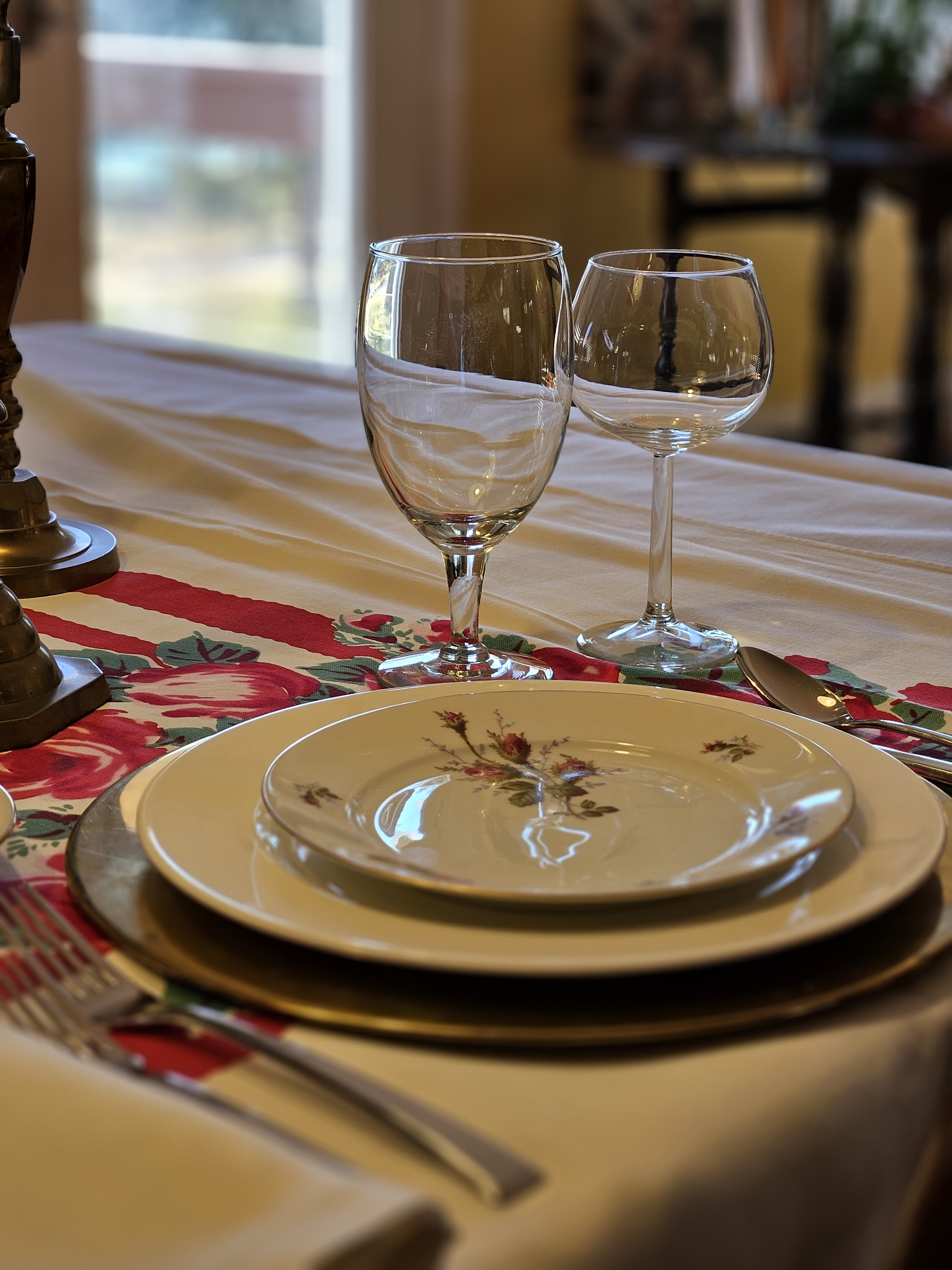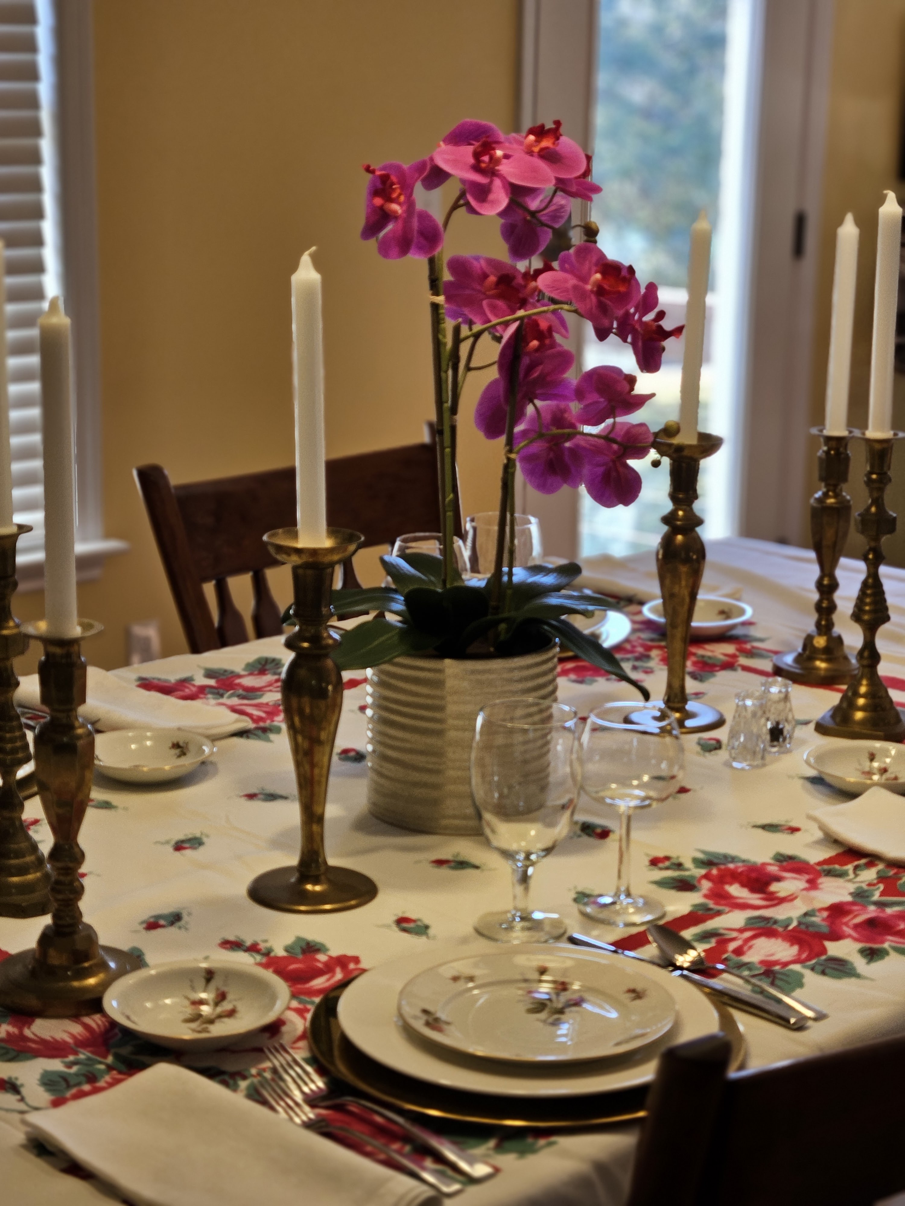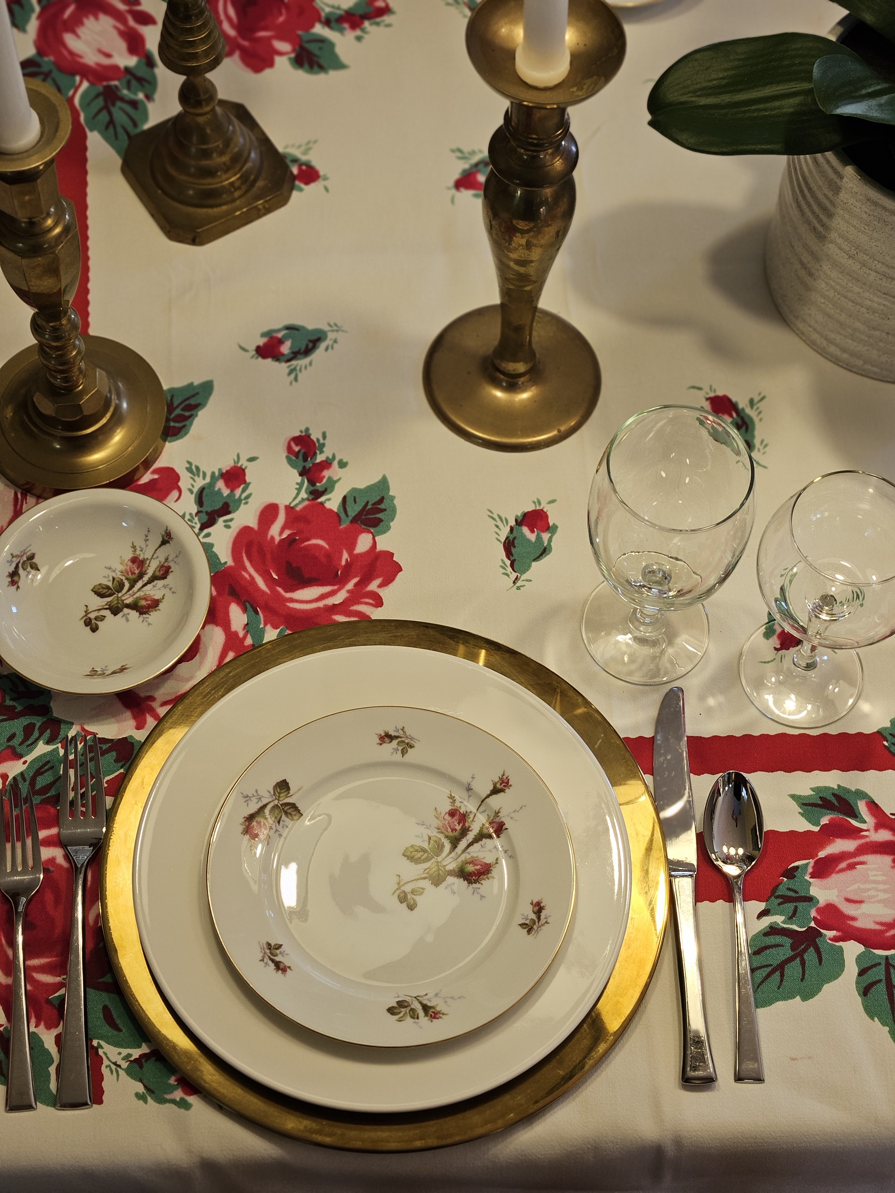 Valentine’s Day is in the middle of the week, and on Ash Wednesday. We rarely go out for Valentine’s Day, but we try to do a special meal and hang out together. I found these brass chargers and vintage rose pattern china (Rosenthal Petal Lane) and thought they’d be great for a tablescape. I found most of the candlesticks at estate sales except one pair was a wedding gift. The table cloth is vintage, and I have to put a bunch of stuff on the table because it shows its age–holes and spots.