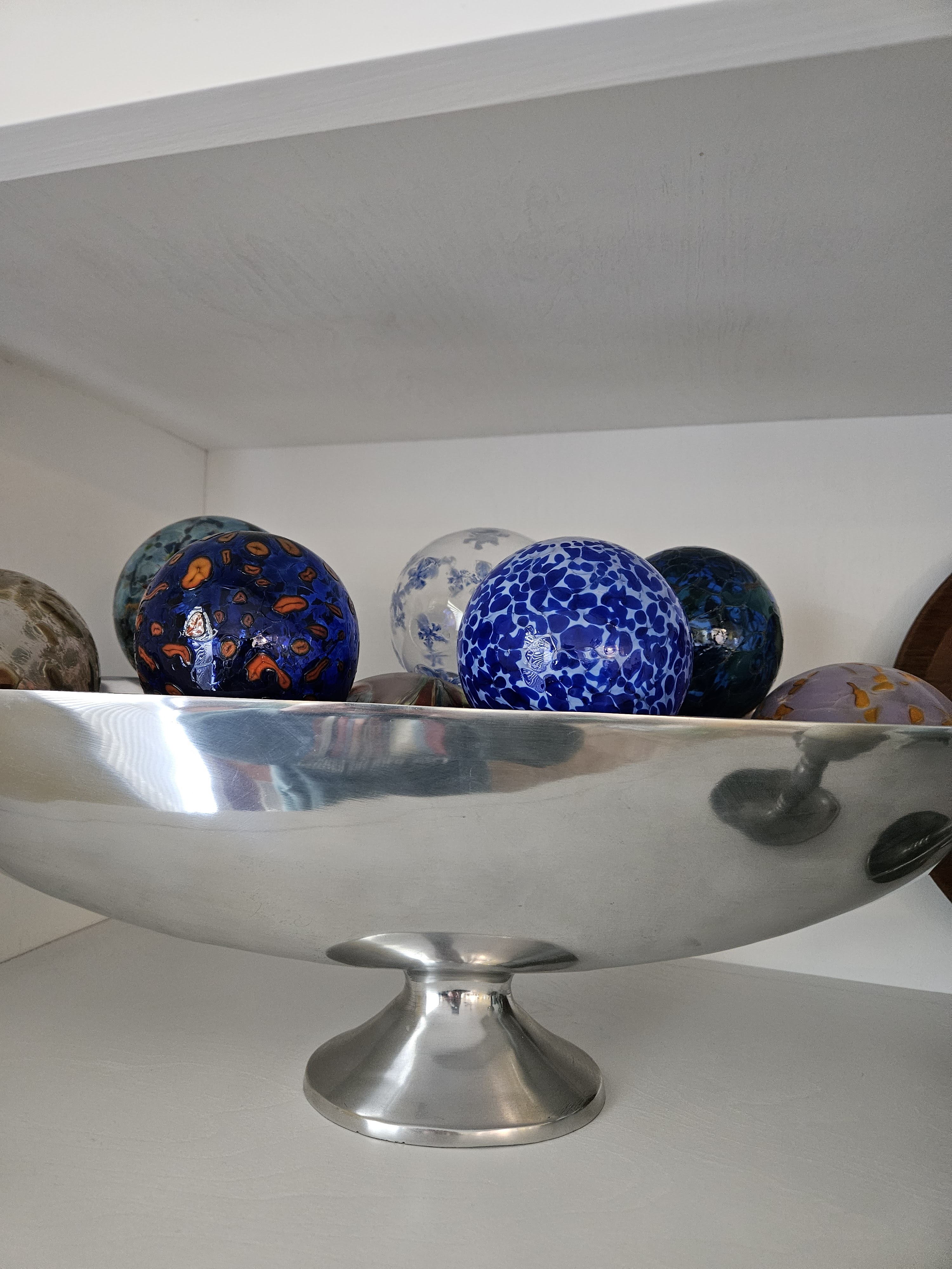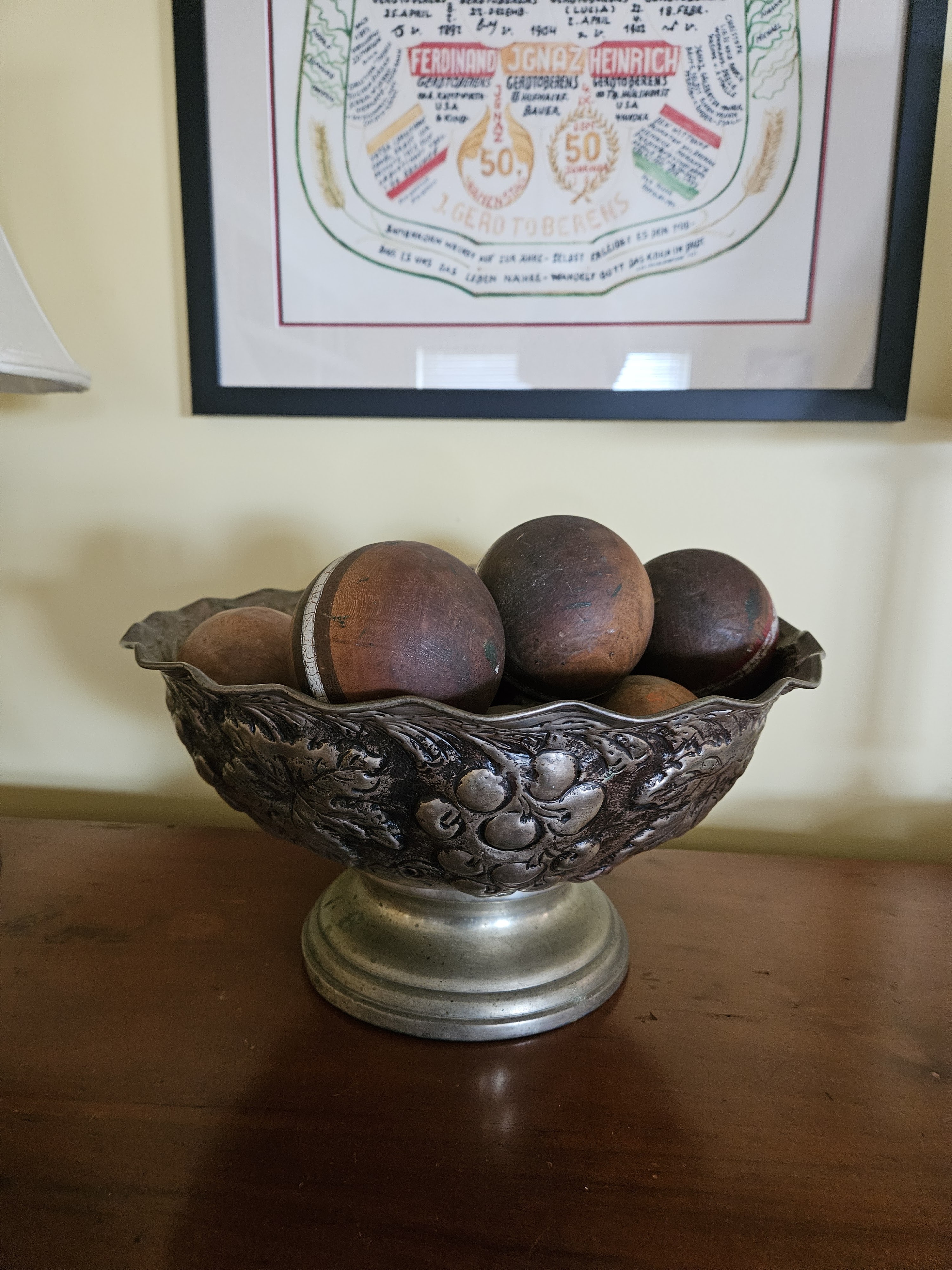 I put them in this fancy repousse silverplate bowl. I love the juxtaposition of the rustic balls and the more refined bowl.