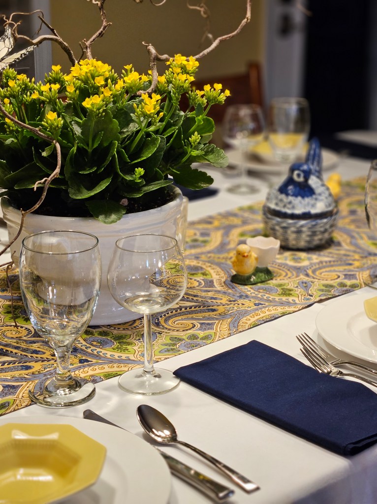 Place settings are white Villeroy and Boch dinner plates, Daffodil Independence fruit bowls (thrifted), water goblets (thrifted), wine glasses, flatware, and navy napkins (thrifted)–I should have used my green glass napkin rings (estate sale), but didn’t think of those.