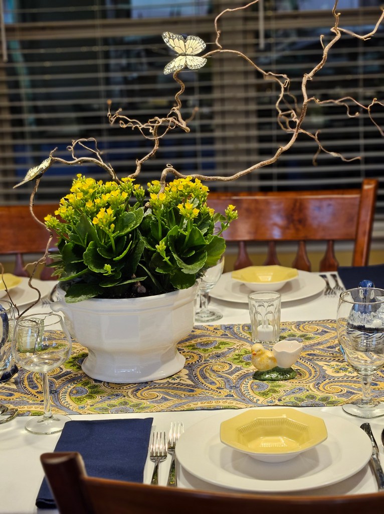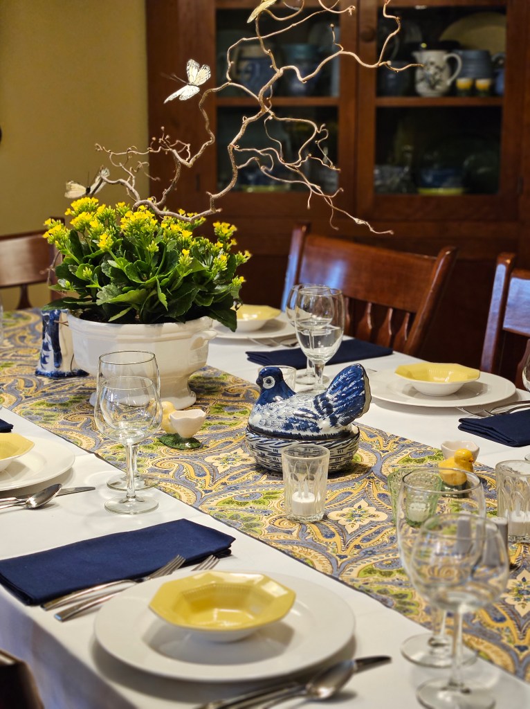 I put down a paisley runner with yellow, blue and green and then added the tureen, but I put a curly filbert branch in it and attached some little faux butterflies. Then I added a blue/white stoneware hen on nest (thrifted), some cute Bordallo Pinheiro egg cups, a blue and white pitcher (thrifted) and some little candles (thrifted) and some sweet stoneware salt and pepper shakers (thrifted).