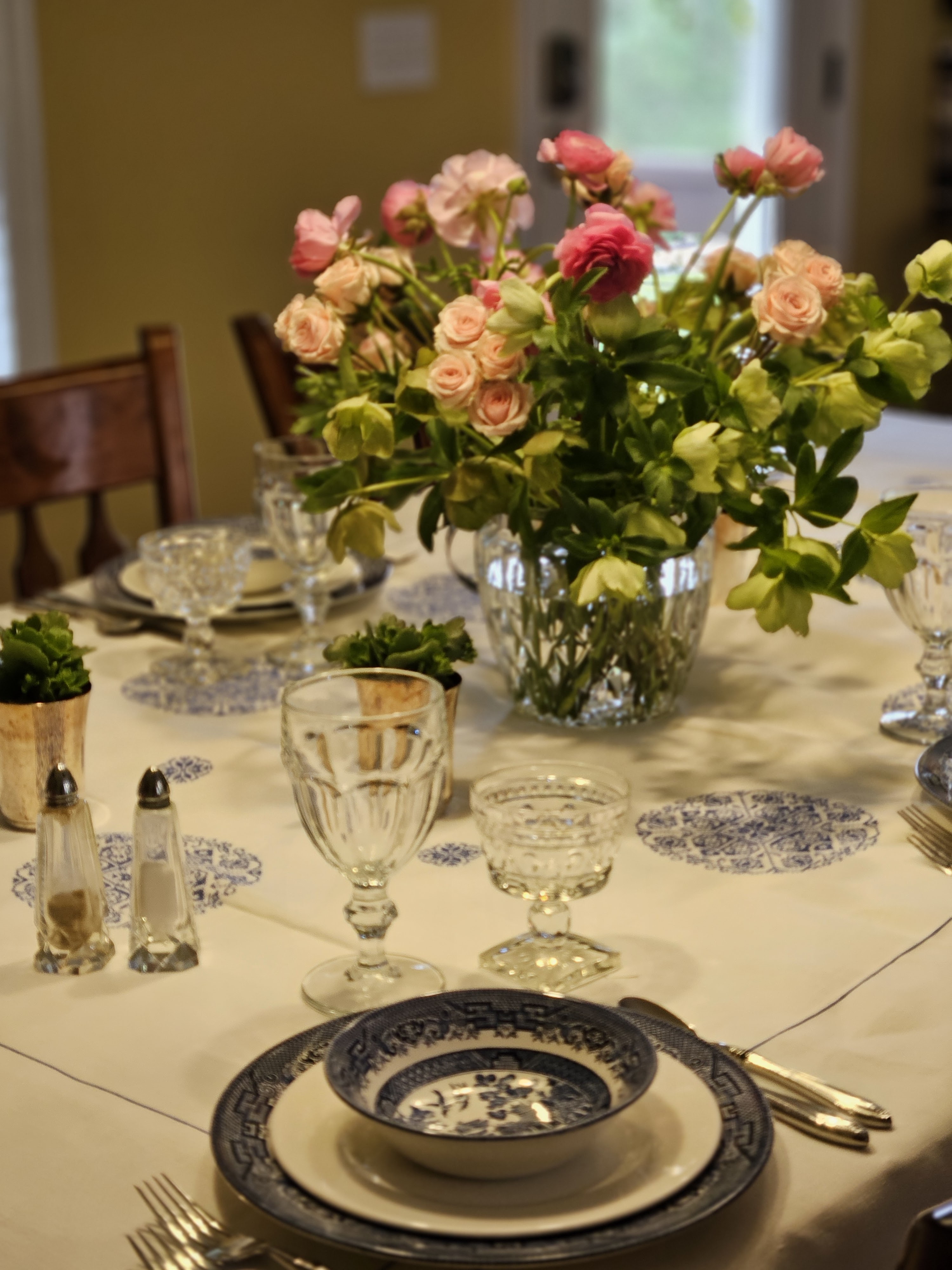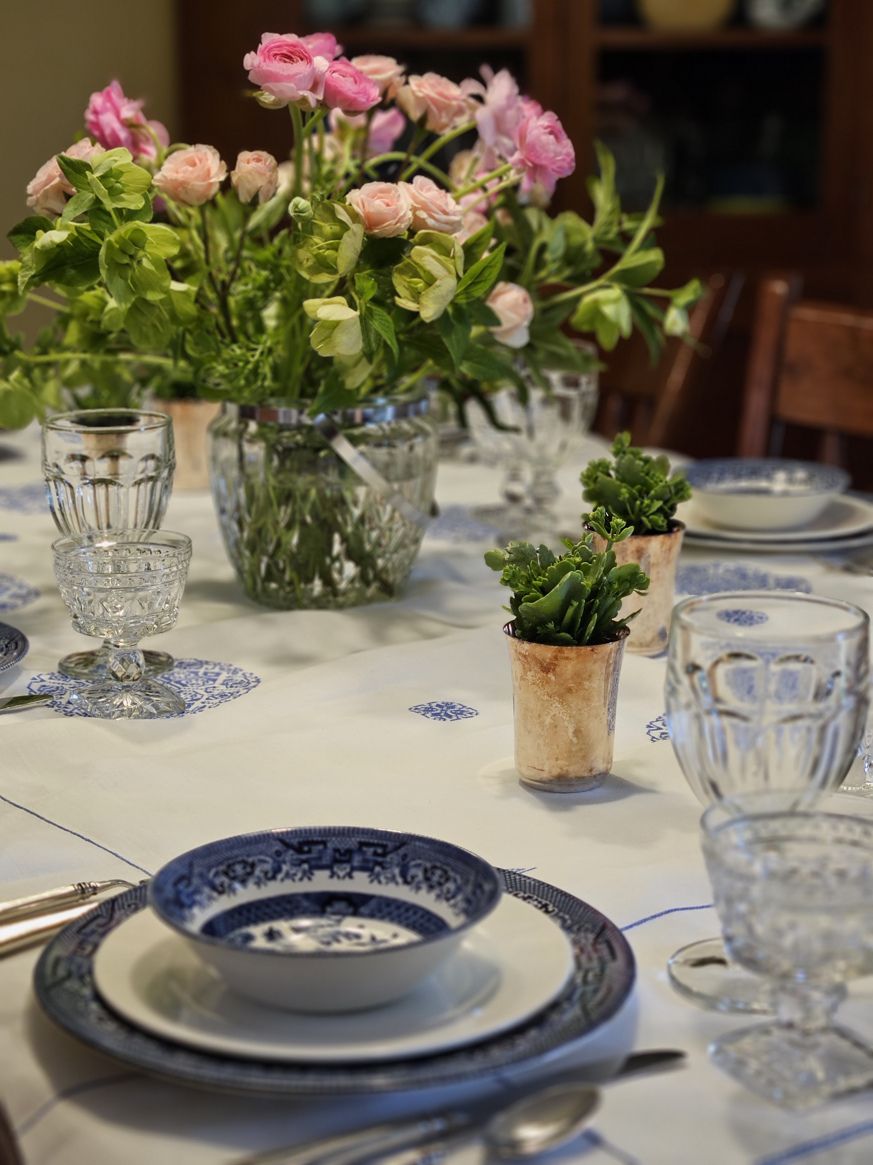 I found this Churchill Blue Willow on my last thrifting adventure and thought it would be perfect for this. I have this beautiful white linen cloth with gorgeous blue embroidery which coordinates nicely with the dishes. I used a molded glass ice bucket for the flowers–lenten rose, ranunculus, and spray roses. I put little tiny pink kalanchoe in the silver plated julep cups. The champagne glasses are also a thrifted find Colony Park Lane–love them. I used Libbey Gibraltar goblets (thrifted as well), because I am not about matching sets of things.