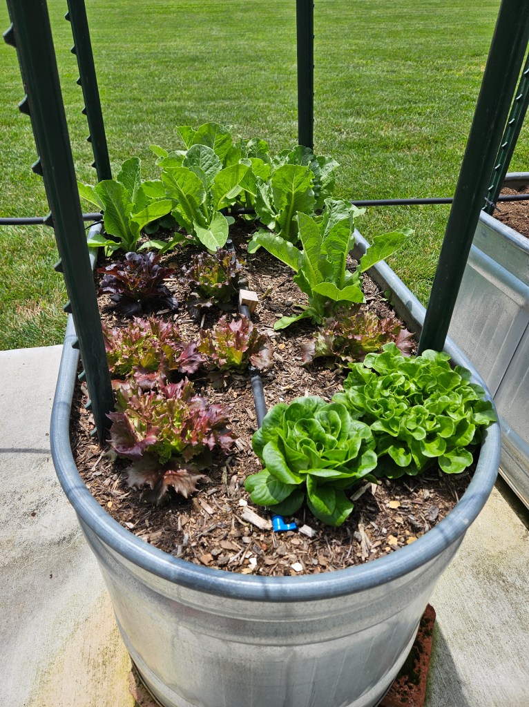 I have already harvested arugula and radishes from our stock tank raised beds, but had to pull all of them up because they were bolting. I am behind on posting, so here’s where we are: