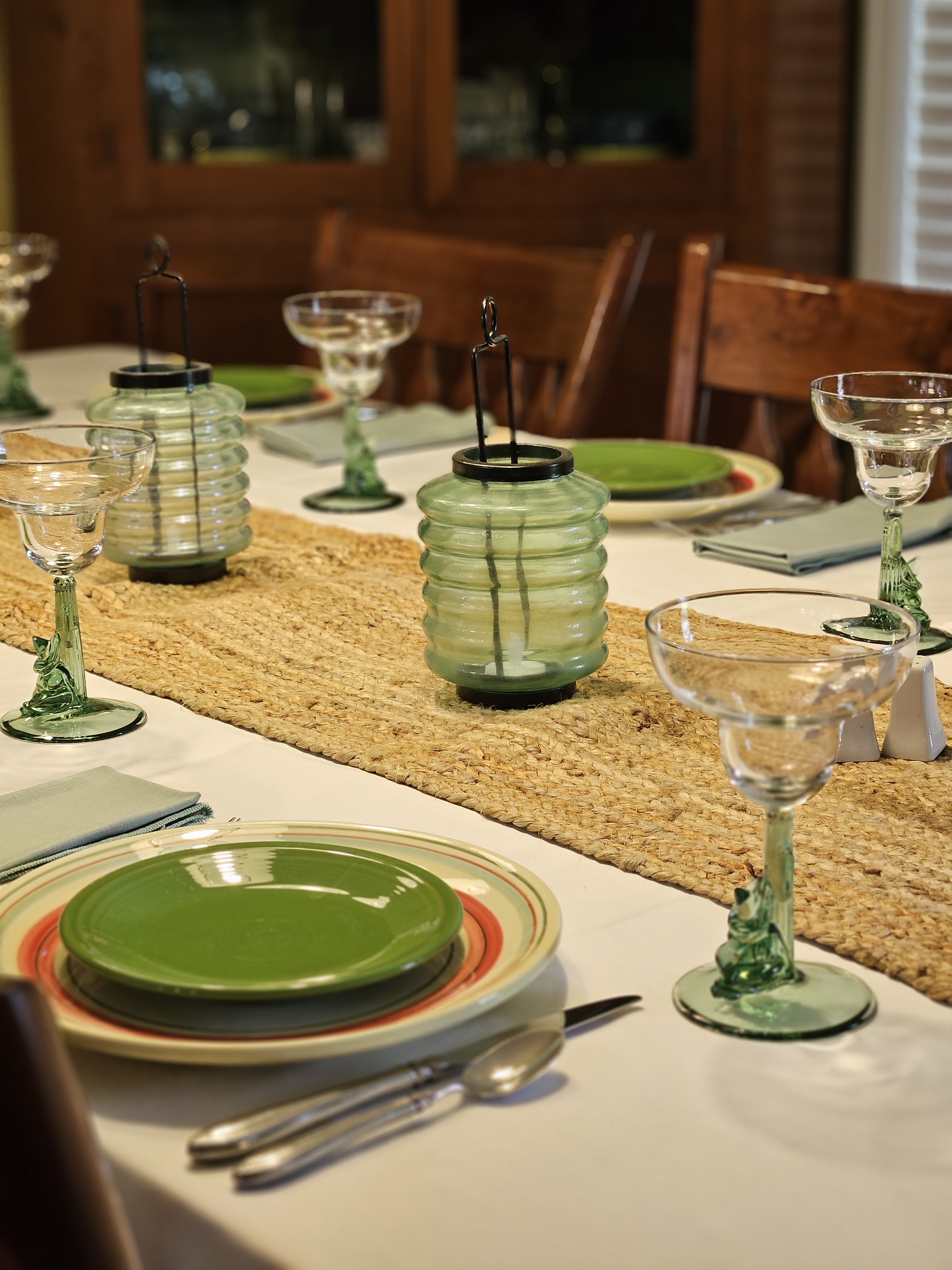 My jumping off point for this table was the adorable margarita glasses I found while thrifting. It’s a little guy napping in front of a cactus–for $1/each, they had to come home. I also found the striped dinner plates for less than $1/each–Lemon Zest by Dansk.