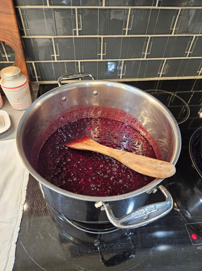 Cook until the mixture begins to thicken and turns clear. Remove from heat and ladle into hot jars, leaving 1/4″ headspace. Add lids and rings and finger tighten. Process in hot water canner for 10 minutes for half pints and 15 minutes for pints. Let cool overnight. Remove rings and wipe jars. Label and store in a cool dark place.