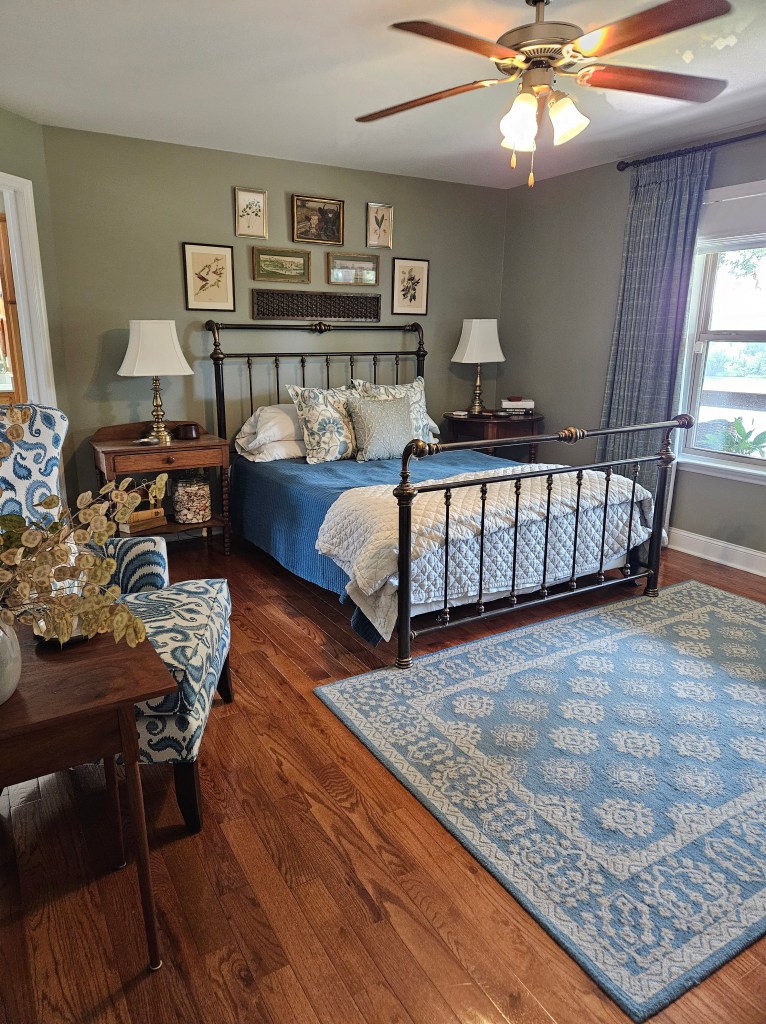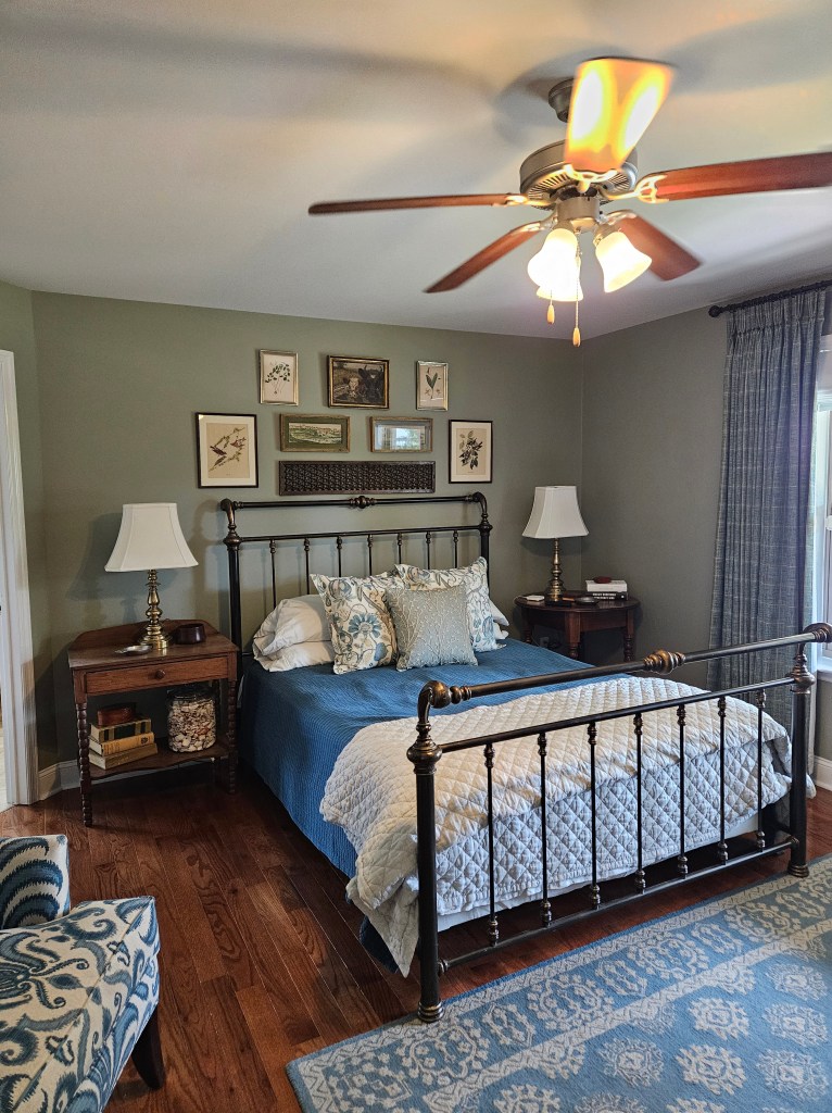 I finally got the curtains back and hung up and finished the gallery wall above the bed. Here’s the final look: