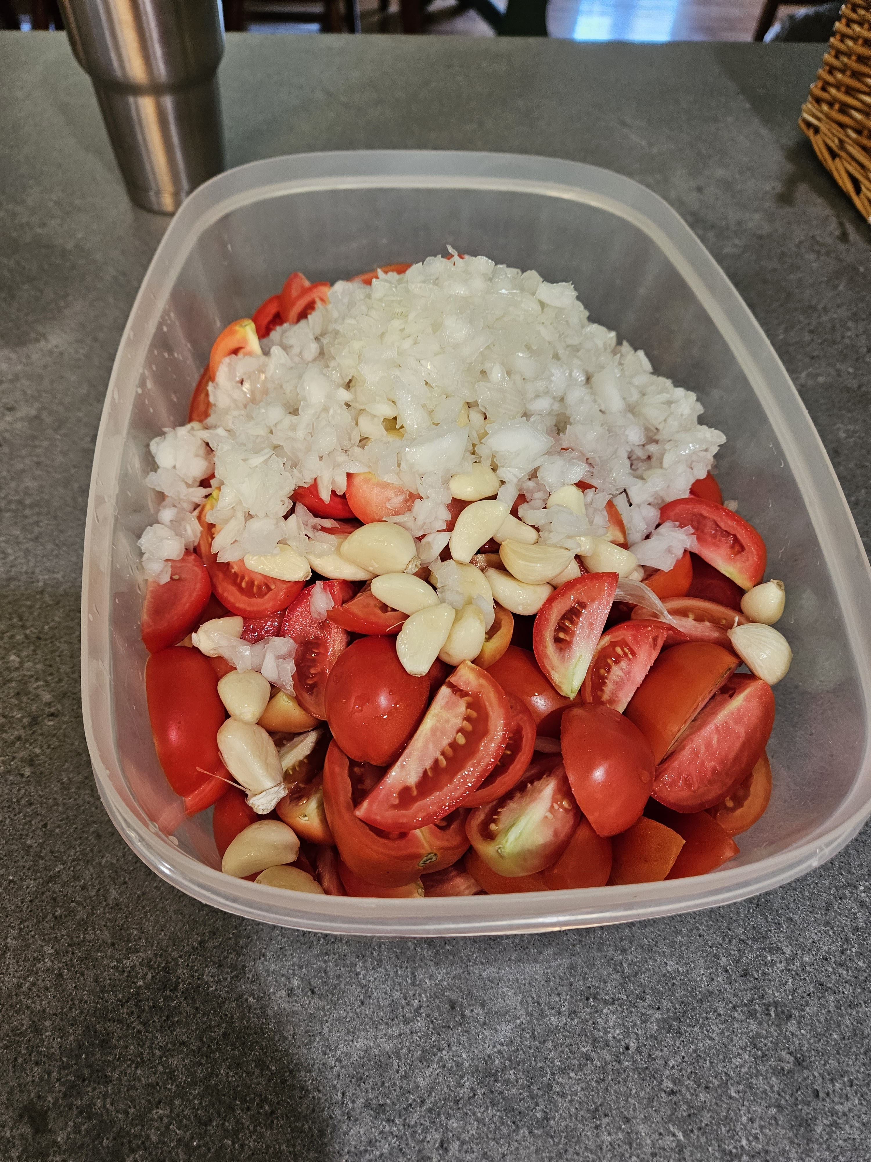 First I wash all my tomatoes and quarter them if they’re big and halve them if they’re smaller. I add chopped or sliced onion (I had chopped onion in the fridge that I needed to use up.) I also add about 1/2 cup of whole garlic cloves (I buy the peeled ones at Aldi.)