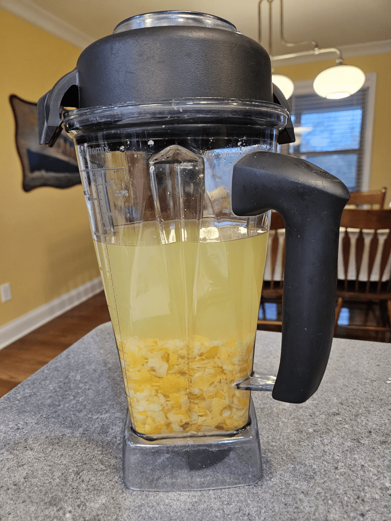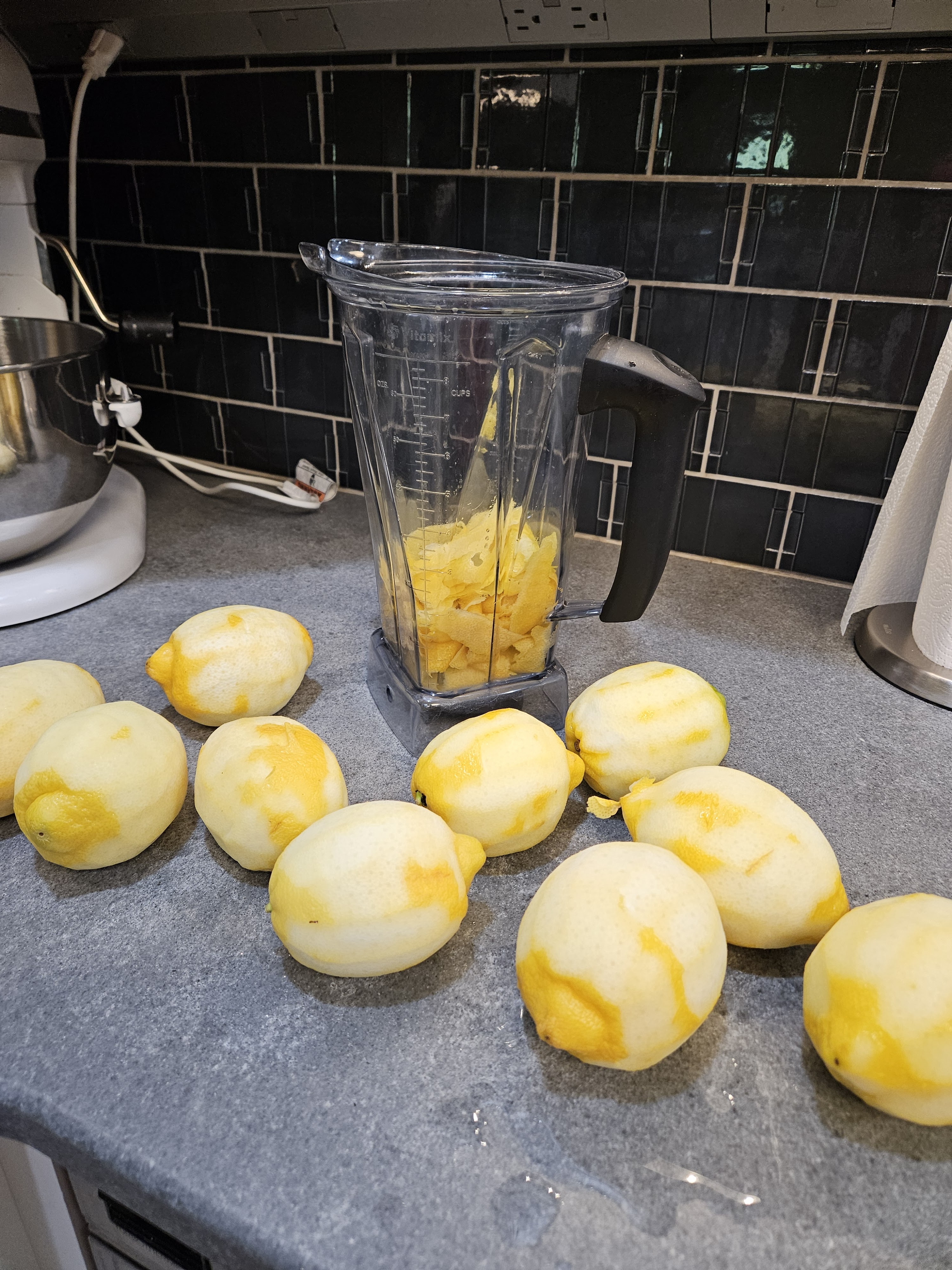 Wash the lemons thoroughly with soapy water and rinse. Using a vegetable peeler, remove the skin from all the lemons. Place the lemon zest in the jar of a large blender.