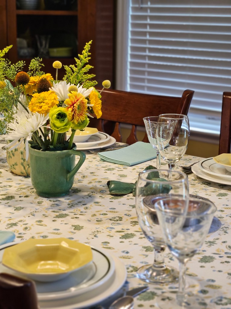 I started with this printed tablecloth in greens, yellows and blue on a cream background. Then I added a green pitcher filled with yellow and white flowers; a yellow container with flowers and a vintage frog planter filled with flowers. I have a Bordallo Pinheiro frog pitcher and a ceramic fish along for fun.