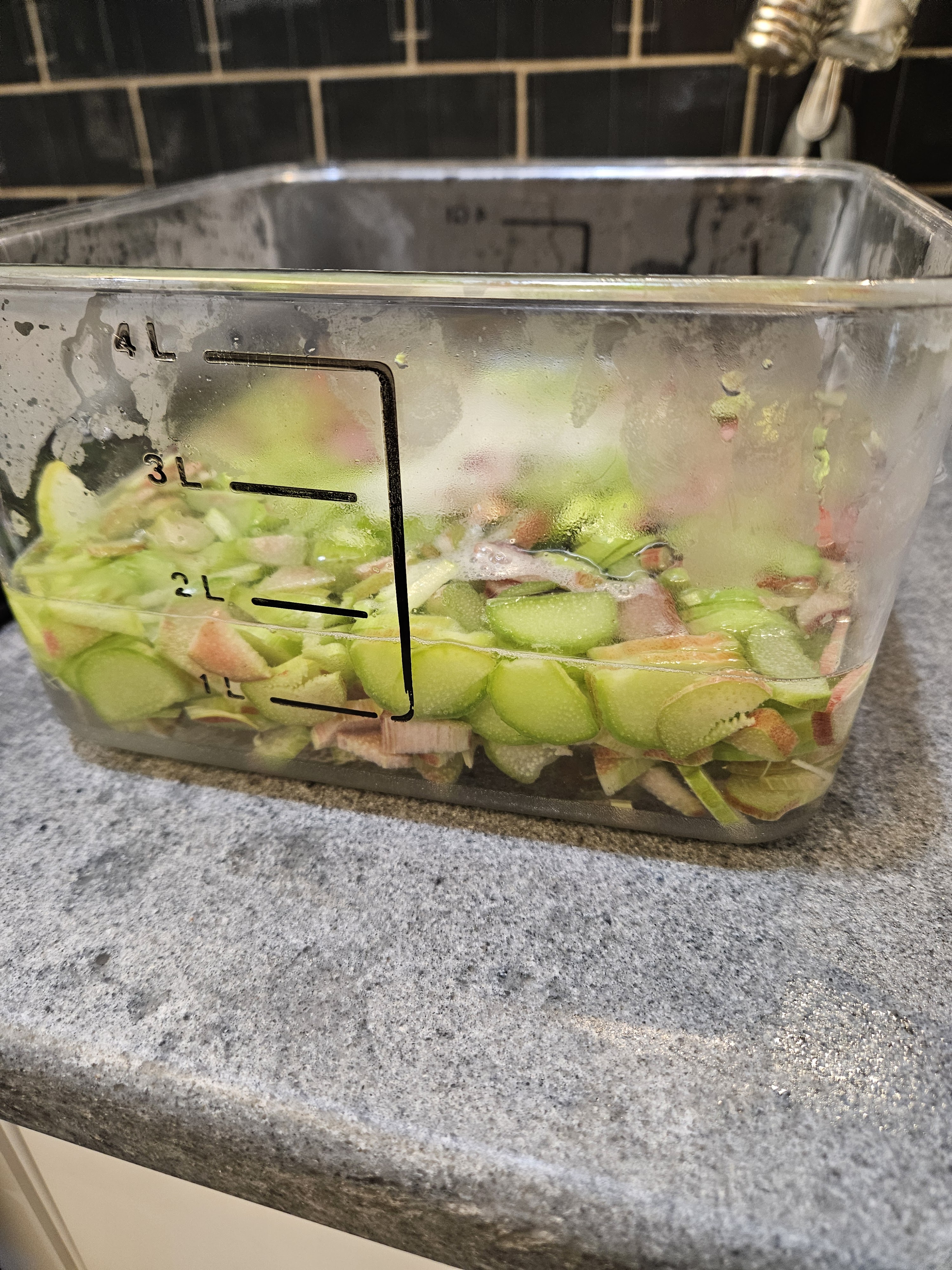 I sliced 7 or 8 stalks of rhubarb really thinly and put it in a plastic container that has a tight fitting lid.