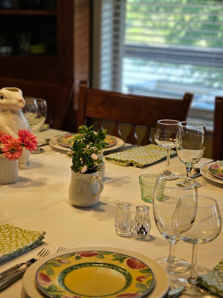 I used some of my extensive collection of small white creamer pitchers for the flowers along with a bunny pitcher made by Bordallo Pinheiro. I love white pitchers because you can use them so many ways and when they are small like this, it doesn’t take many flowers to fill them. (I probably have 20 of them and have picked all of them up for $1 to $5.) I have enough that I could use them as placecards–I’ll have to do that.