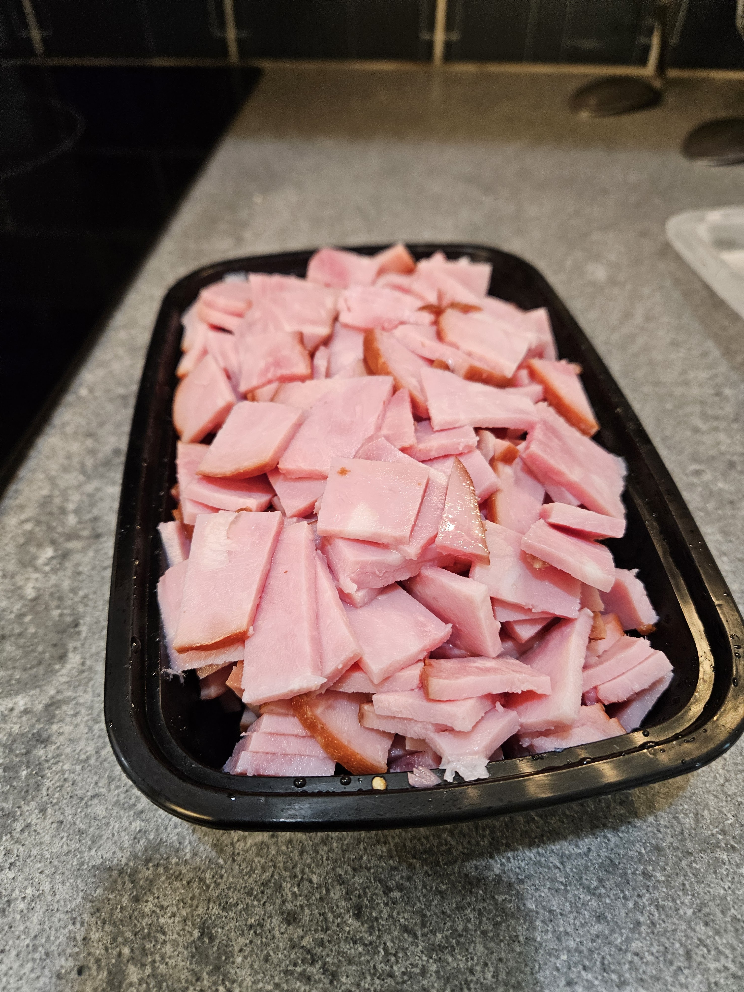 I used sliced ham from Aldi for the ham and cut it into smaller pieces.