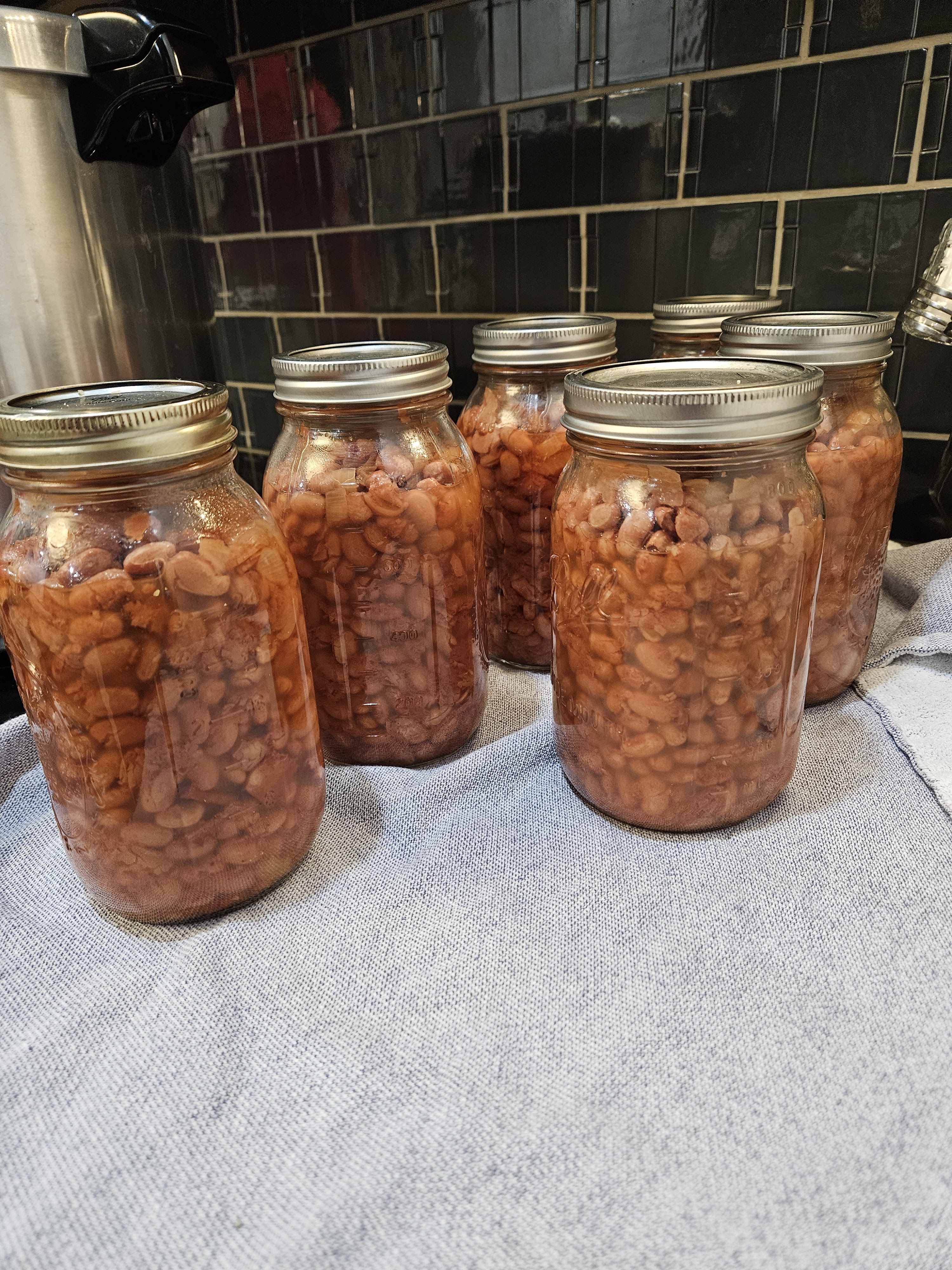 I brought the canner up to 10 lbs pressure and canned the beans for 90 minutes. I let the canner come back down to 0 pressure and removed the weight and the lid. I let the jars stand in the canner for about 30 minutes and then removed them to a beach towel covered counter. I let them sit overnight.