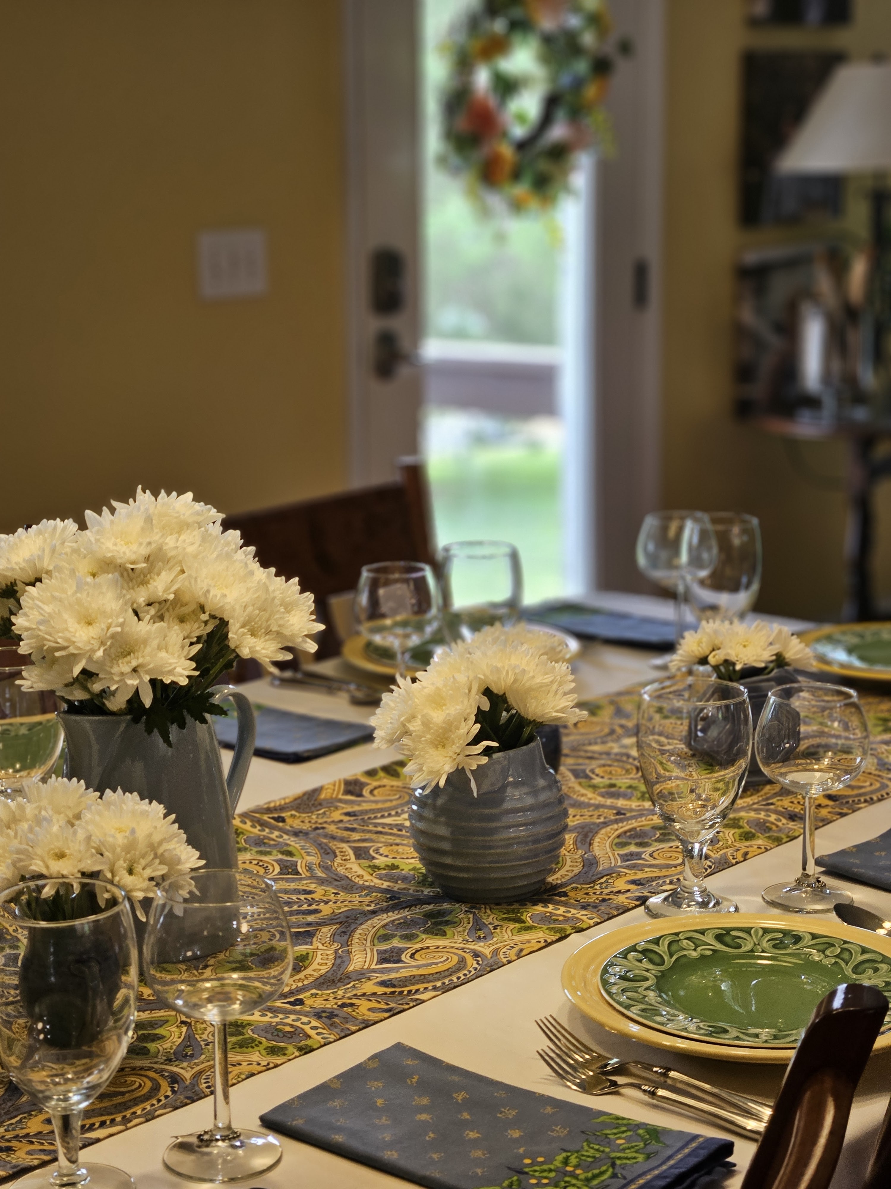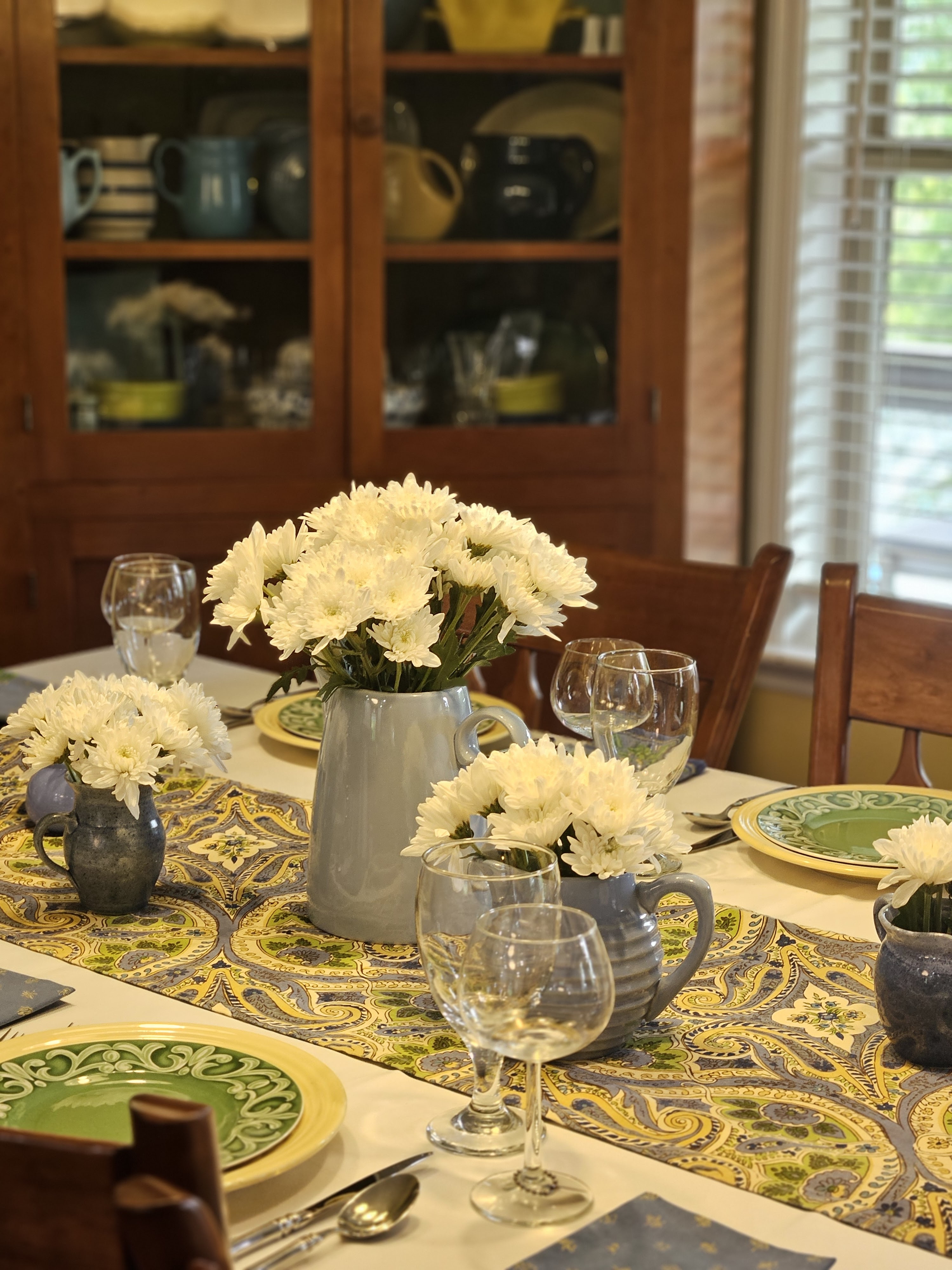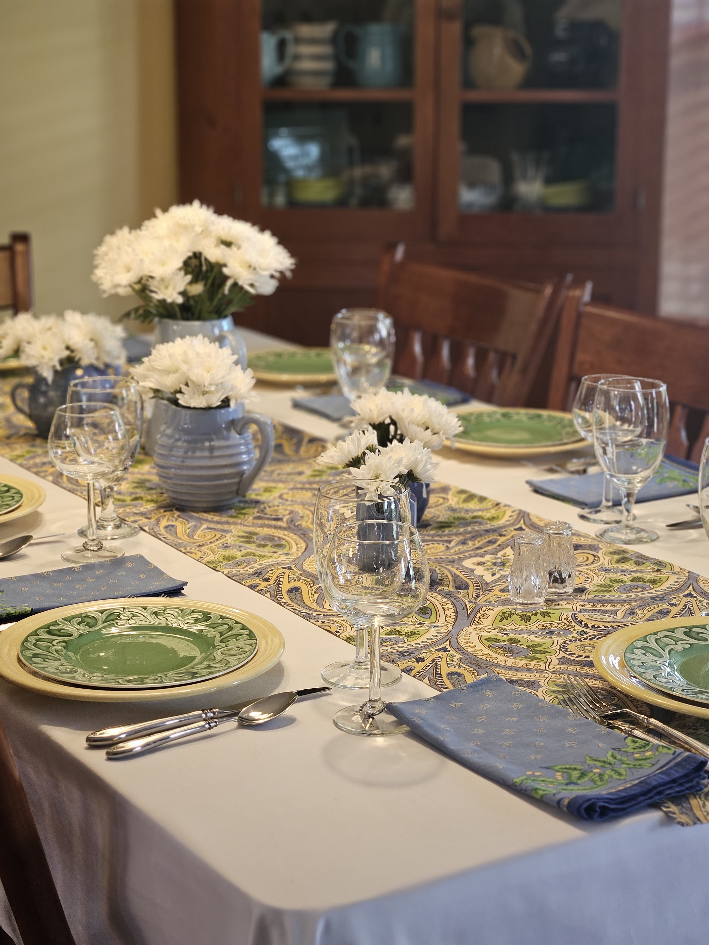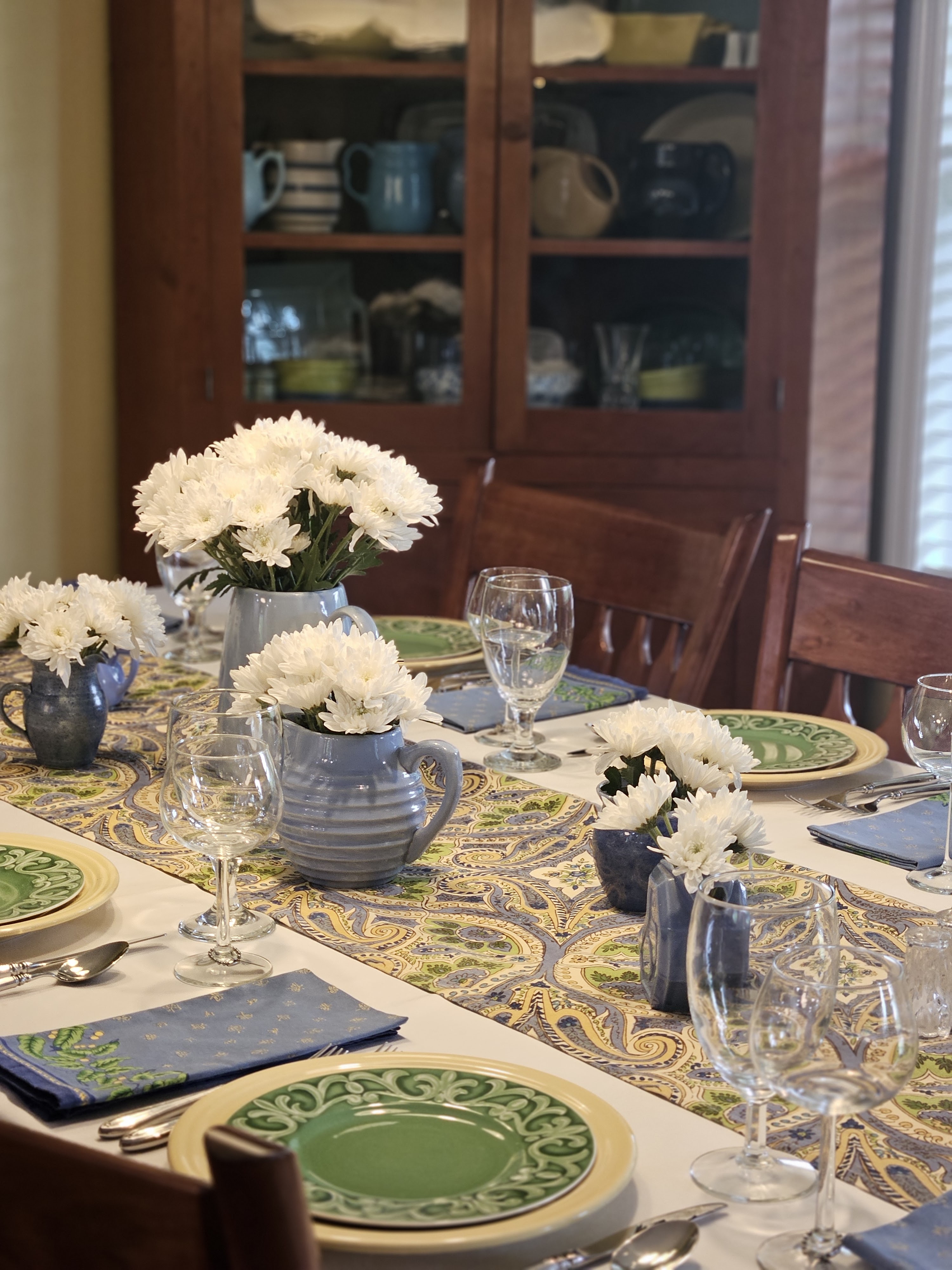 I let the linens be the inspiration for this table–blues, greens and yellows. The napkins are from Williams Sonoma and I bought the runner years ago at Home Goods. I put white mums in some of my blue pitchers for the centerpiece.