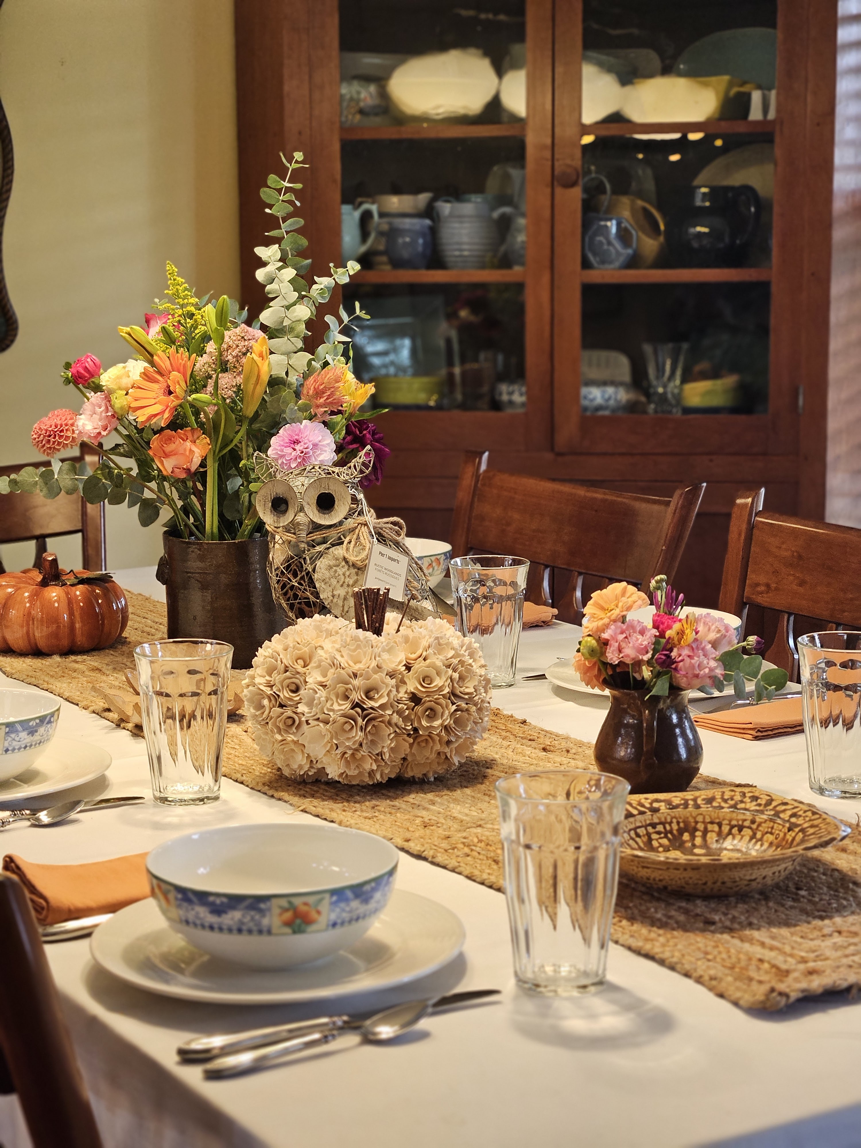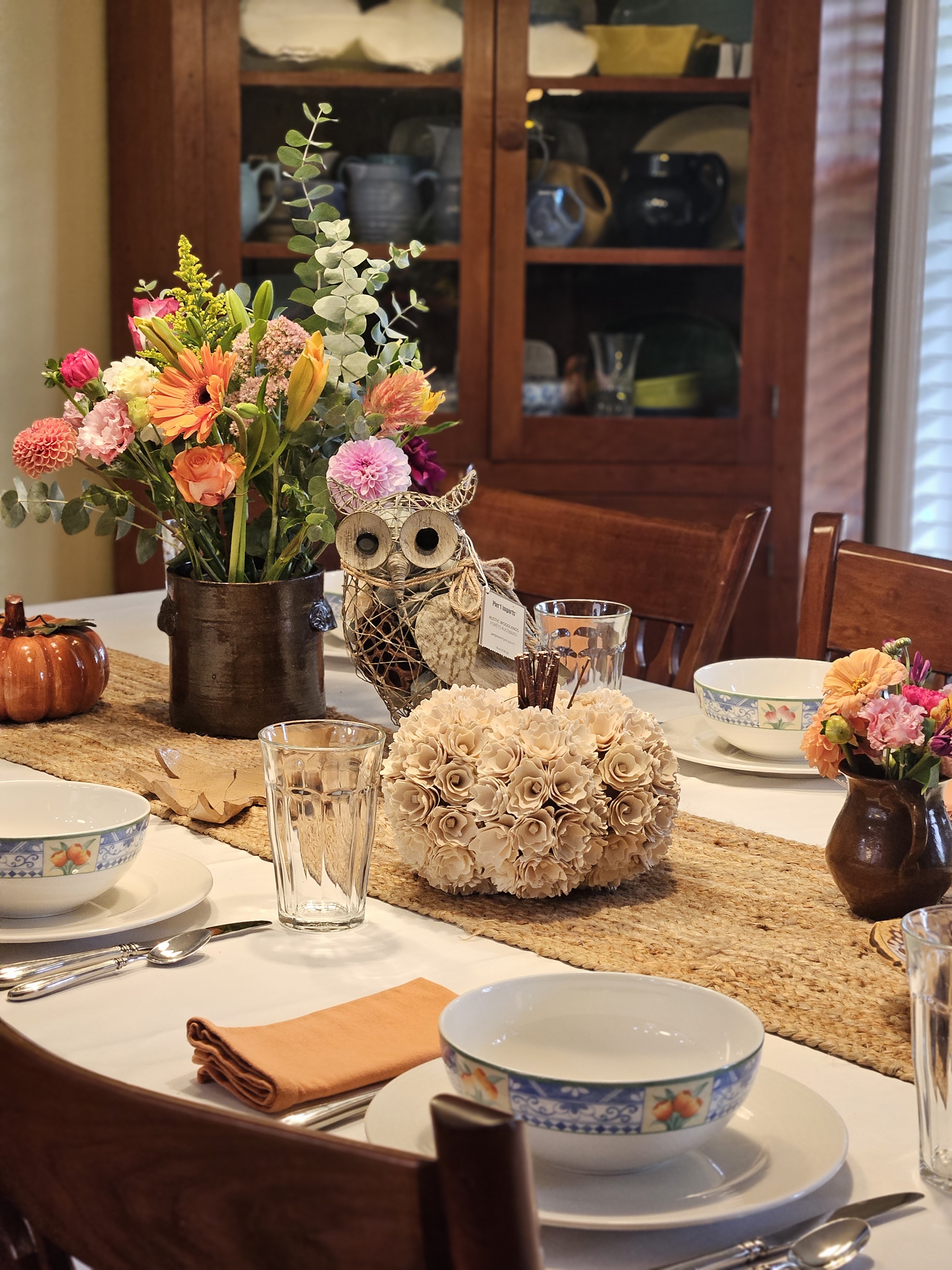 My subscription flowers had a bunch of pinks and oranges in them this week, and I bought a few more flowers at the grocery to fill out the bouquet. It’s definitely feeling more like fall, so I also wanted to use some of my fall decor so I pulled out my owl and shaved wood pumpkin and a ceramic orange pumpkin, and an art pottery leaf. I put the flowers in brown pottery containers to stay with the browns and tans.