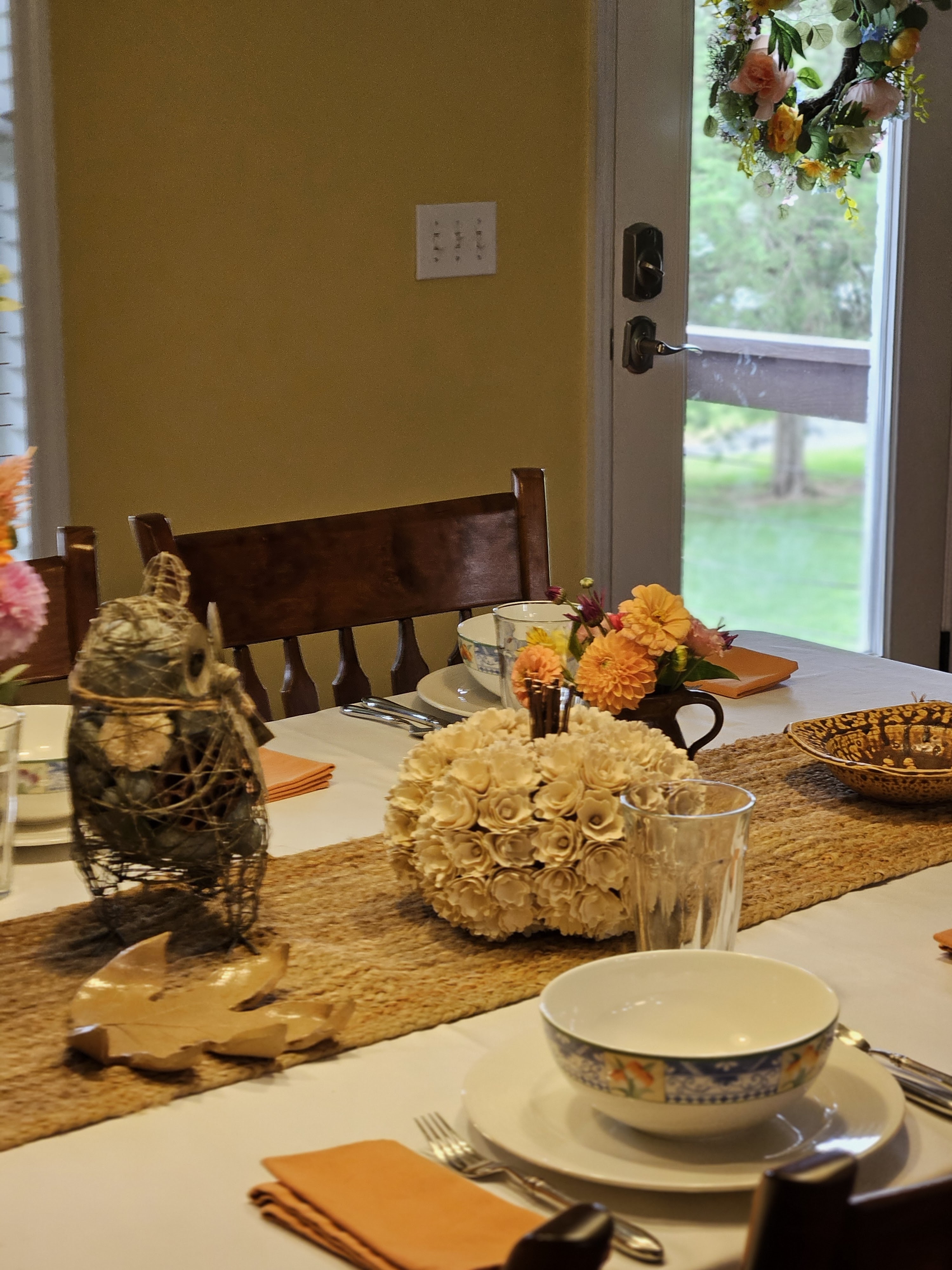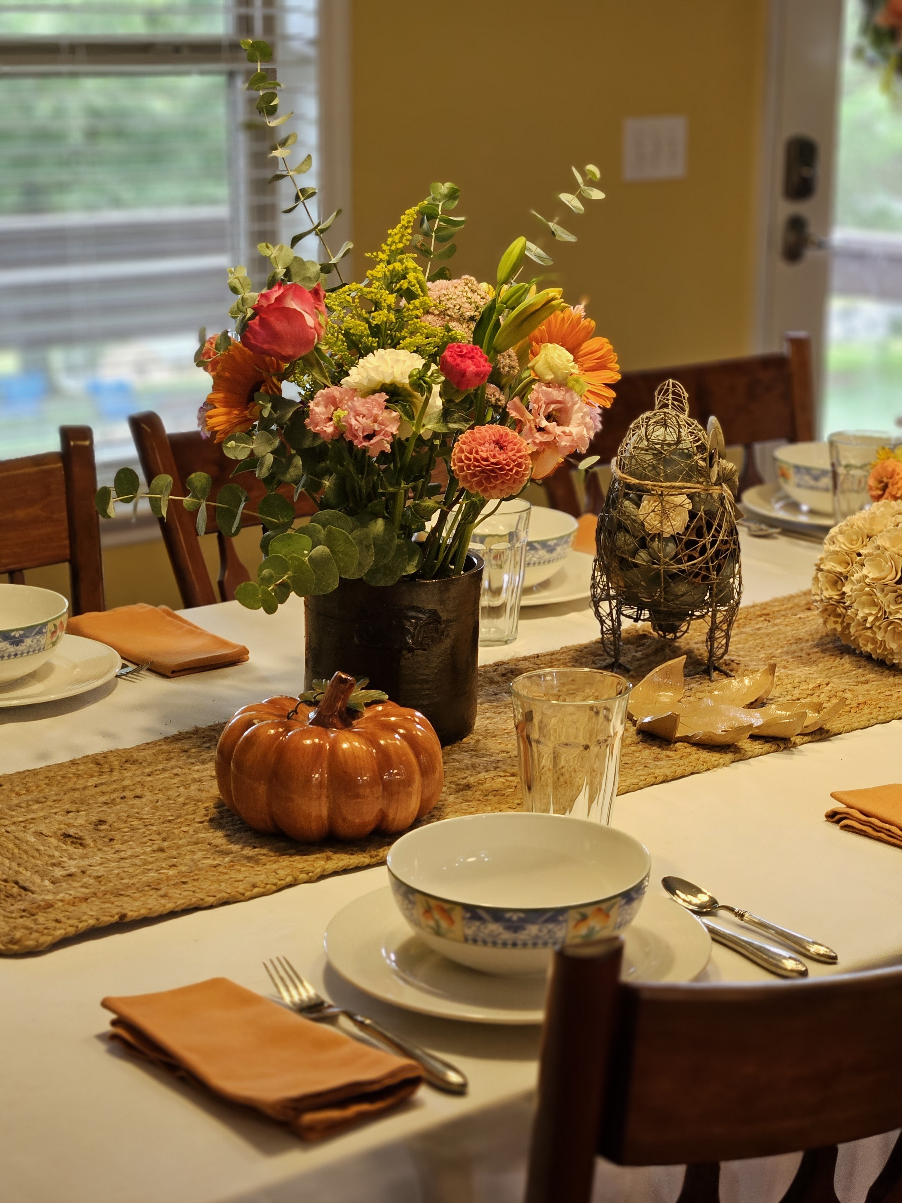 For the place settings, I used white buffet plates and Villeroy and Boch Perugia bowls–because we were having chef salads with our kids and their girlfriends. I used orange napkins to repeat the color from the centerpiece. It was a casual family meal, so I just used our Duralex tumblers for glassware.