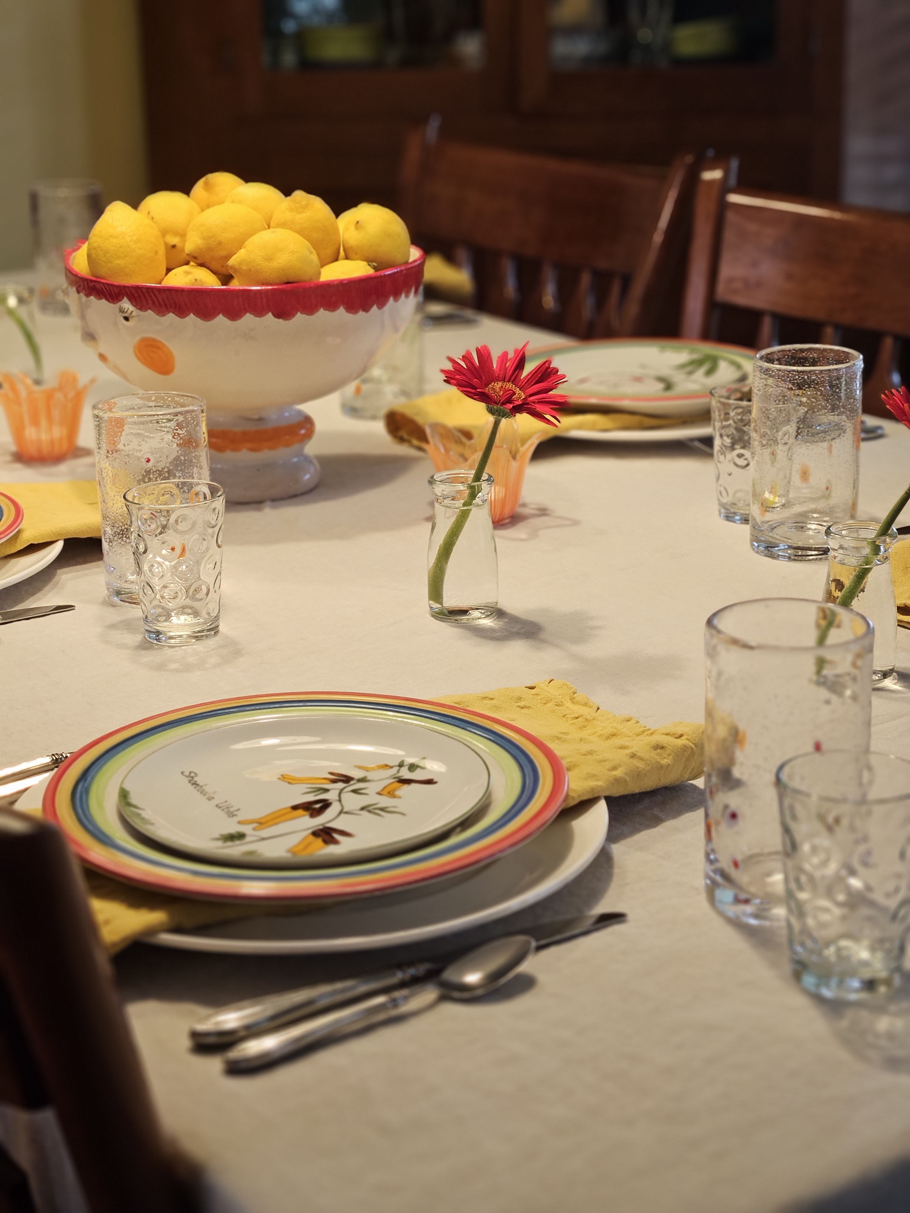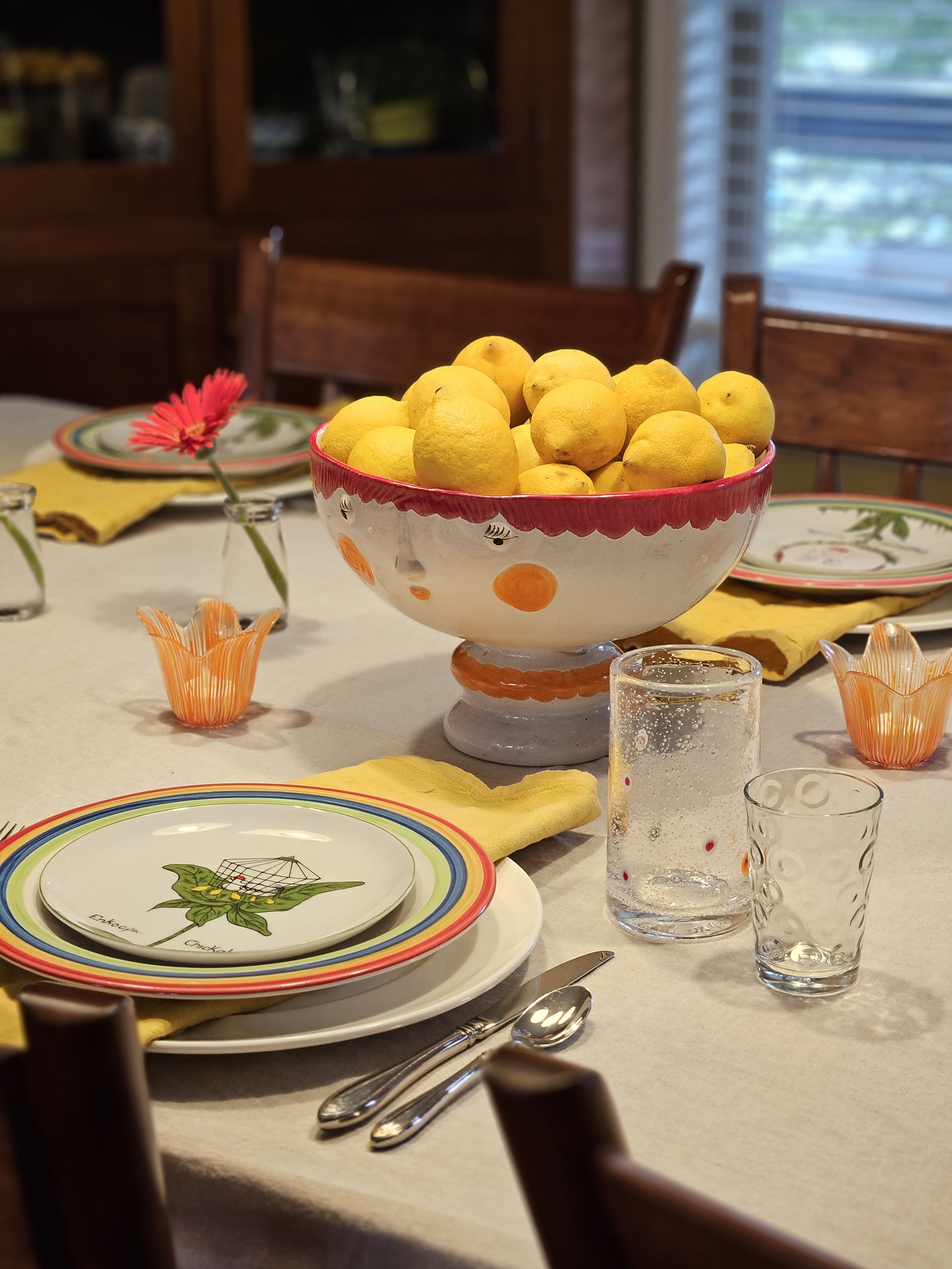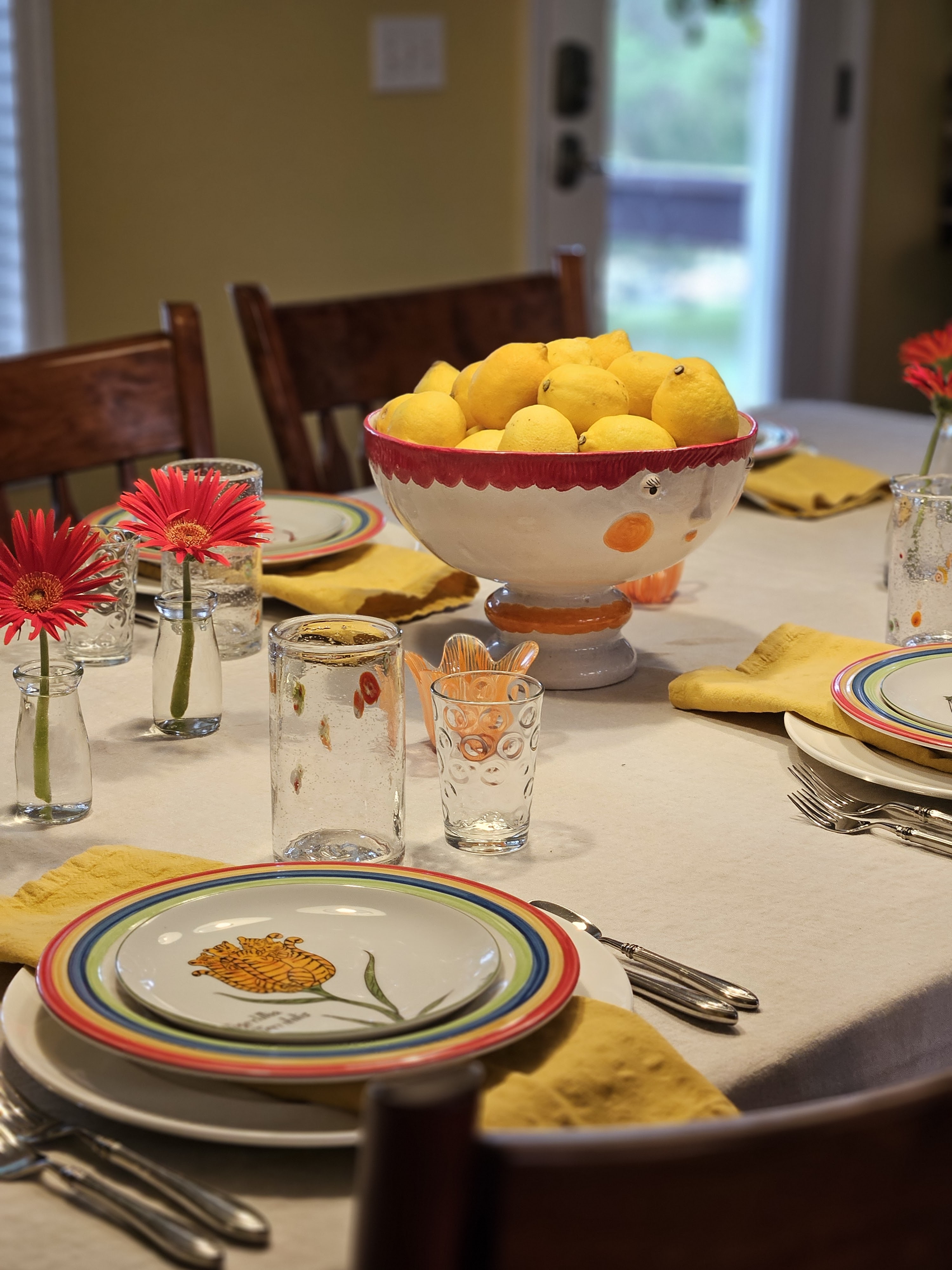 I started with a natural linen cloth and added the centerpiece bowl filled with lemons, some orange candle holders, and some small bottles with red gerbera daisies from my yard.